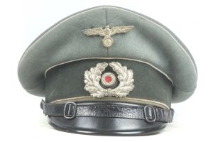 New€750.00Heer EM / NCO Infanterie visor with early buntmetall insignia. The visor is a untouched example with period affixed insignia. The cap eagle is missing one prong but is firmly applied with two of the three prongs. The cap retains its original liner and the sweatband is partially loose at the back. The visor is a nice untouched example in good used codition.