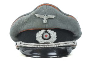 €800.00Textbook Heer visor cap for a Offizier der Infanterie in good worn condition. The visor is a typically privately purchased piece. The cap retains its original bullion insignia. The cap has a beautiful worn shape that would be a great attribute for a mannequin or displayed as is!