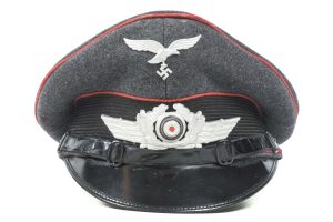 €950.00Foreign made Luftwaffe Crushed officer visor cap in combat worn condition. The visor is a foreign, probably Belgian made example. The visor has its originally sewn Bullion cocarde, at some point the bullion eagle was removed and replaced with a metal eagle. The visor has strong wear all over and has a very strong frontline character!