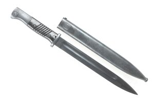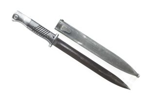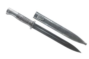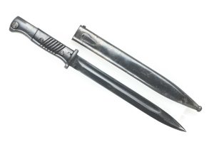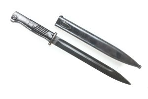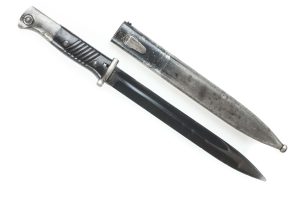 €340.00Matching K98 bayonet marked 41 cof in good condition. The bayonet has two markings ’39’ on the handle and the tear drop frog attatchment. The bayonet is a nice example!