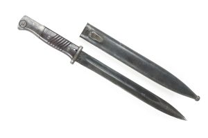 €325.00Matching K98 bayonet marked 41 cqh indicating production by Clemen und Jung,Solingen. The bayonet is in good used condition with its original factory finish and has never been sharpened.