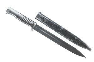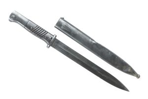 €300.00Matching K98 bayonet marked 42 asw in good used condition. The bayonet is marked asw 42indicating production by E. & F. Horster & Co. Solingen. The bayonet is matching to its scabbard with and has nice clean wooden grips.