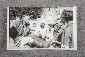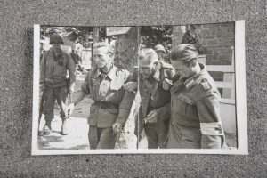 NewSt. Malo: wounded German is helped along by two of his own comrades, one of them a German medic. This is a original photo of the well known Life photographer Robert Capa. Rare!