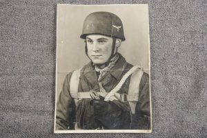 New€200.00Large Fallschirmjäger portrait in the size 17×24 cm. The photo is marked on the back Frühling im Januar 1944 Fallschirmschüle 4, 3 Kompanie. Beautiful original late war Fallschirmjäger portrait!