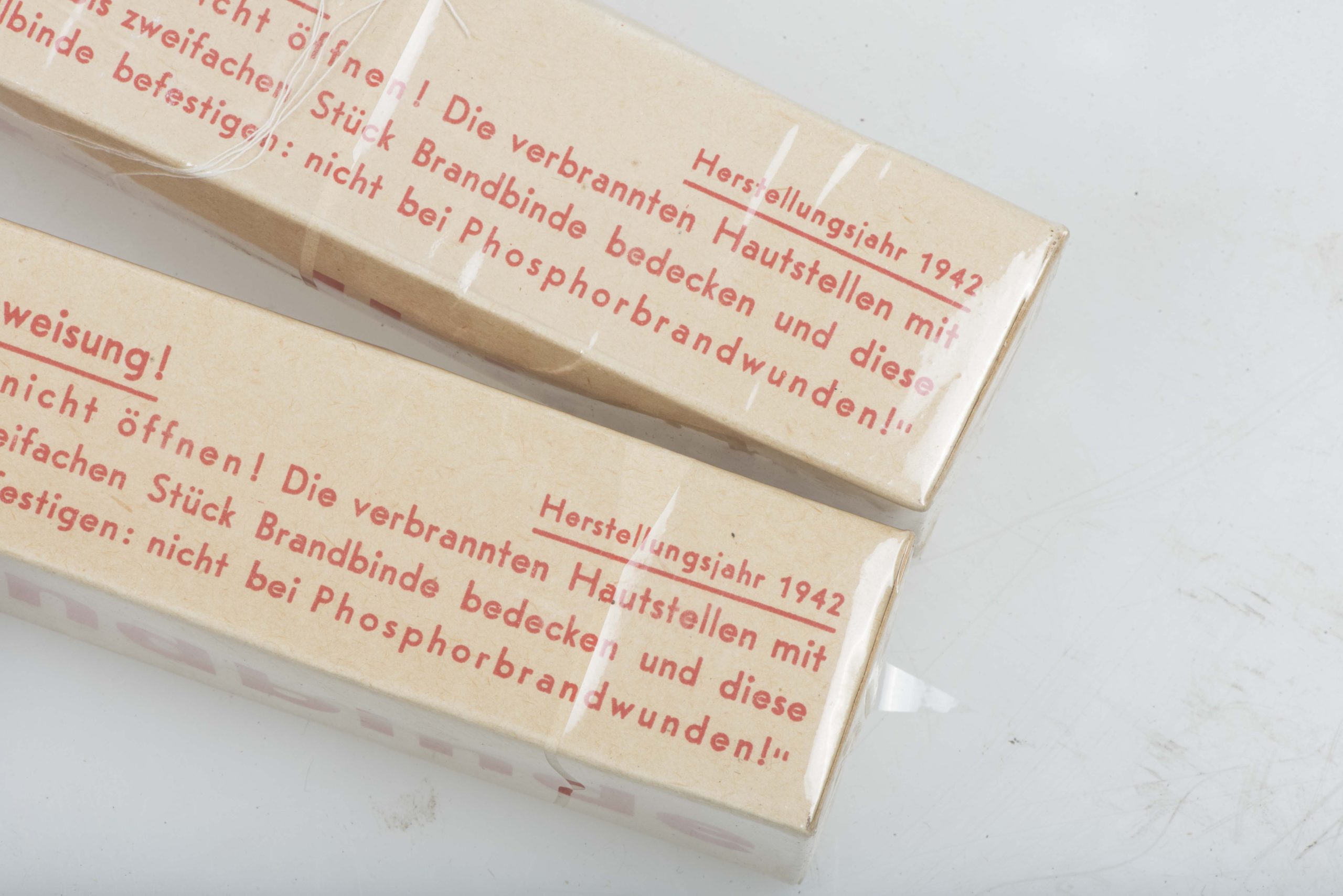 2x Sanitäter Brandbinde or burn bandage in unused condition. The boxes are nicely marked Brandbinde W. Söhngen Wiesbaden 1942. Perfect examples still originally sealed!