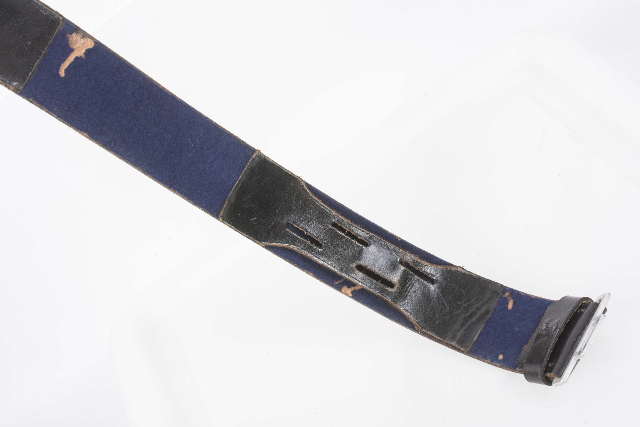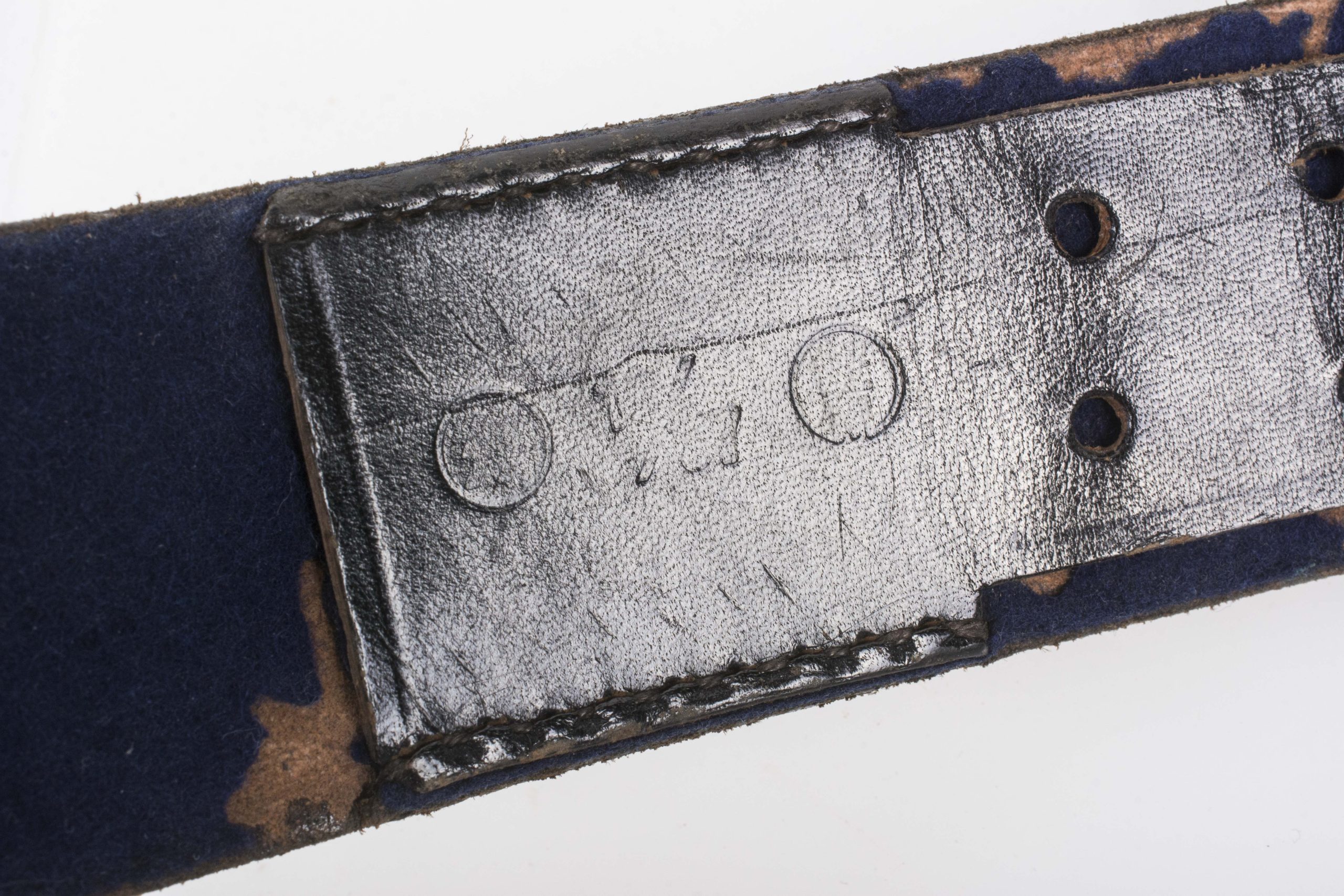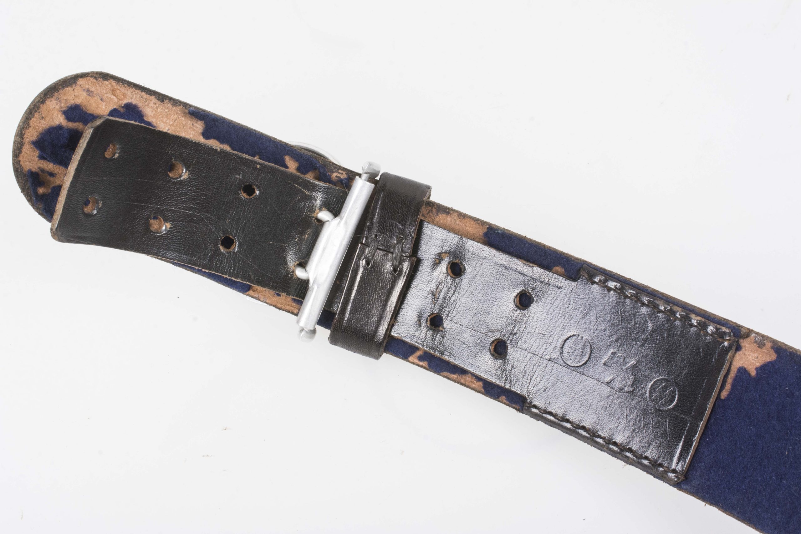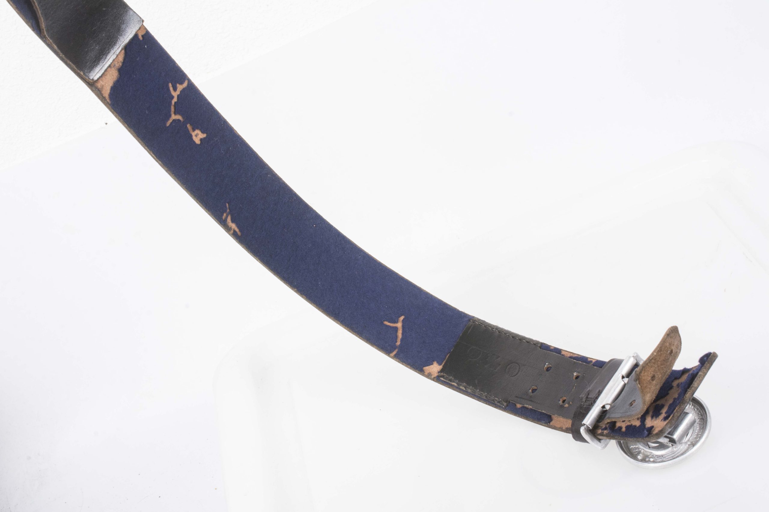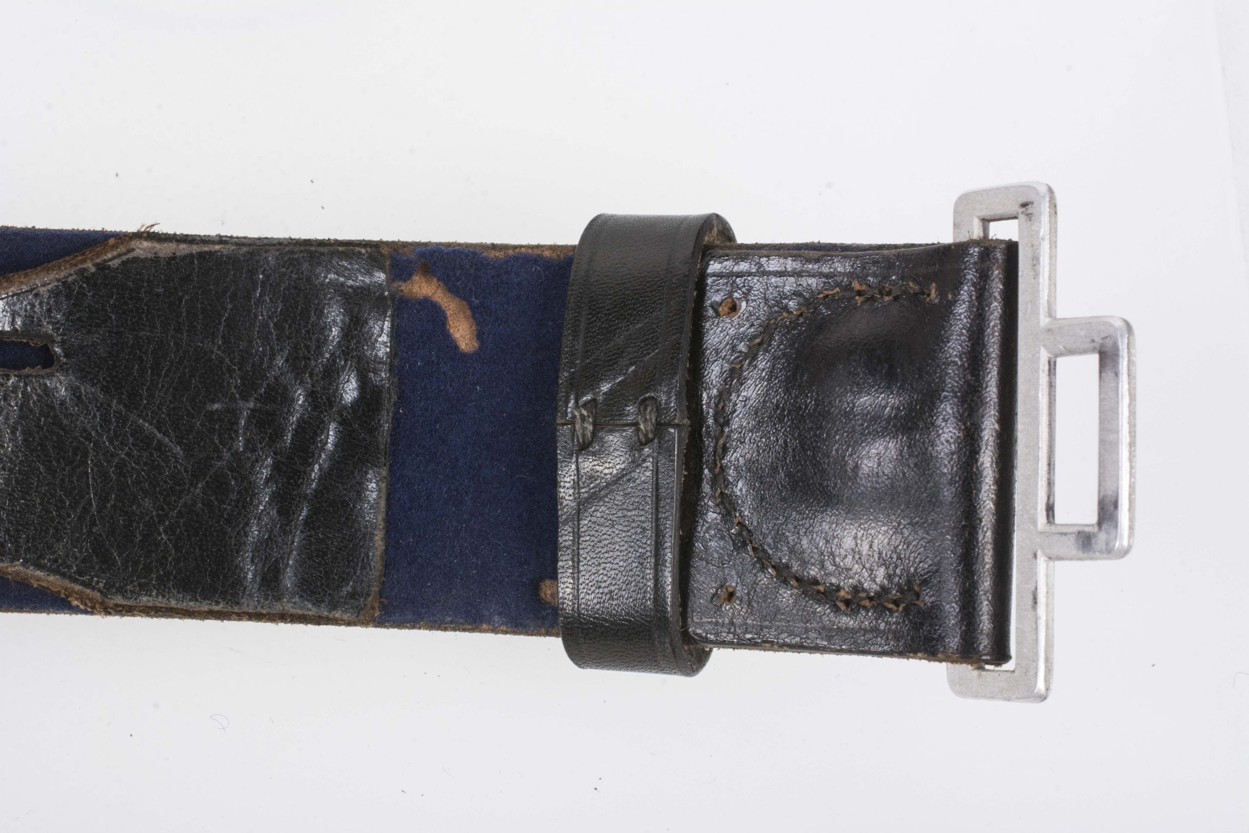 Textbook pre war Waffen-SS officer equipment belt in excellent condition. The belt is a nice large size fitting most if not all mannequins and is marked RZM 12/37 ᛋᛋ. The leather of the belt is in excellent, clean and supple condition. Inside the belt is a blue felt lining which is partially moth damaged. The buckle is a very nice aluminium example marked RZM 36/38 ᛋᛋ indicating production by Overhoff in 1938. The buckle retains most if not all of its original silver finish. Rare and hard to find belt set and a essential piece for the specialized collector which for sure is the best example I have ever had the pleasure to offer!