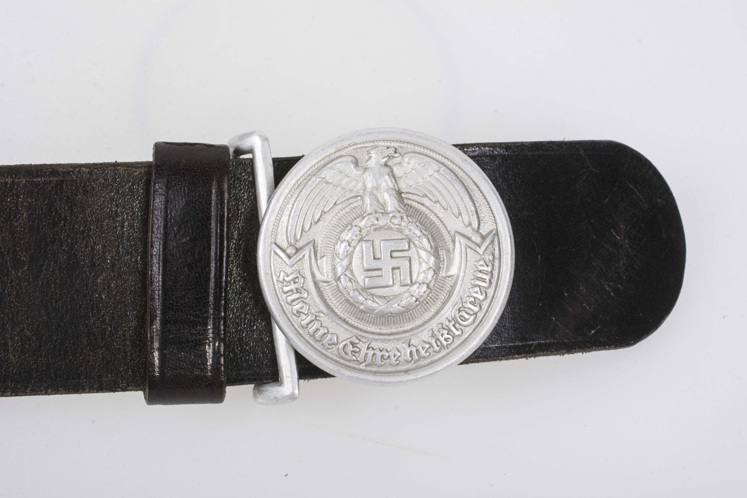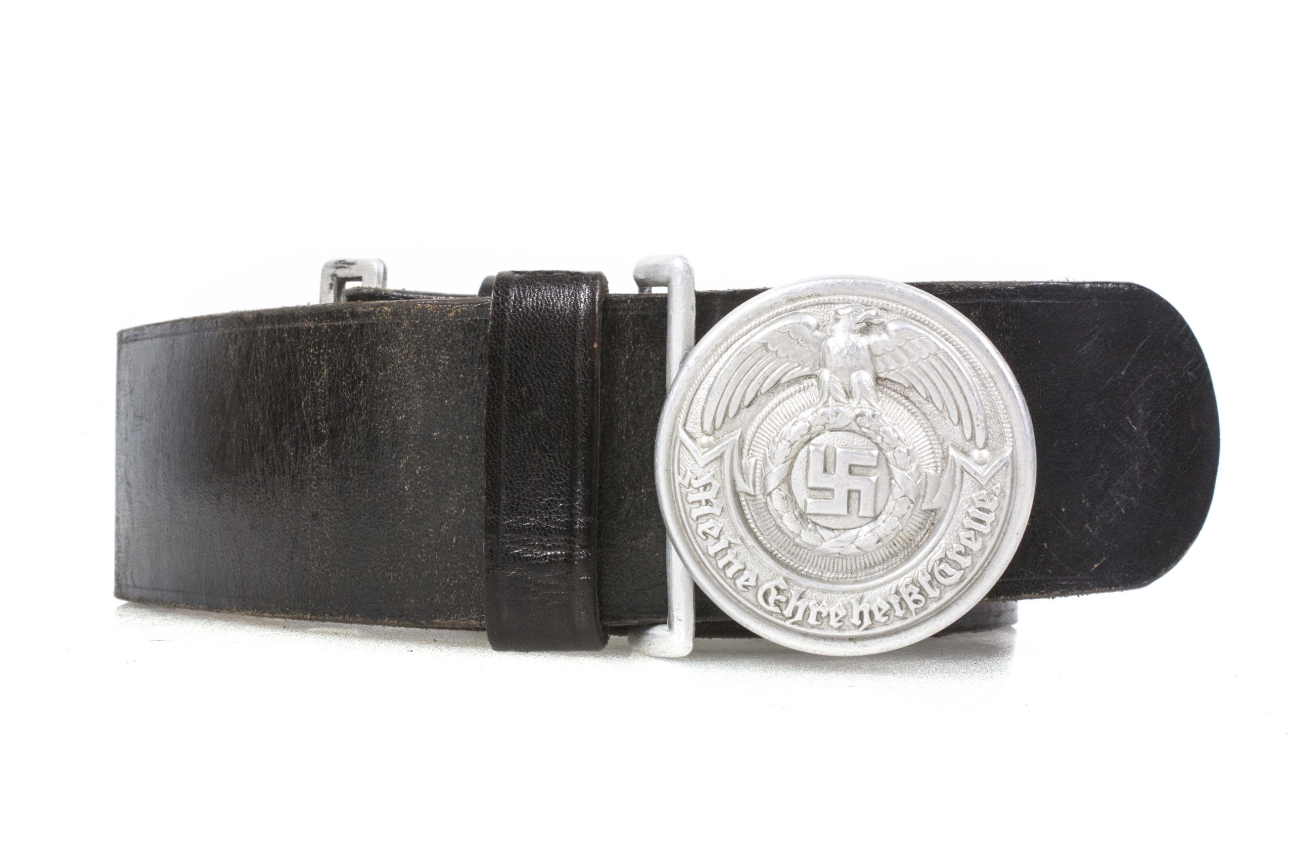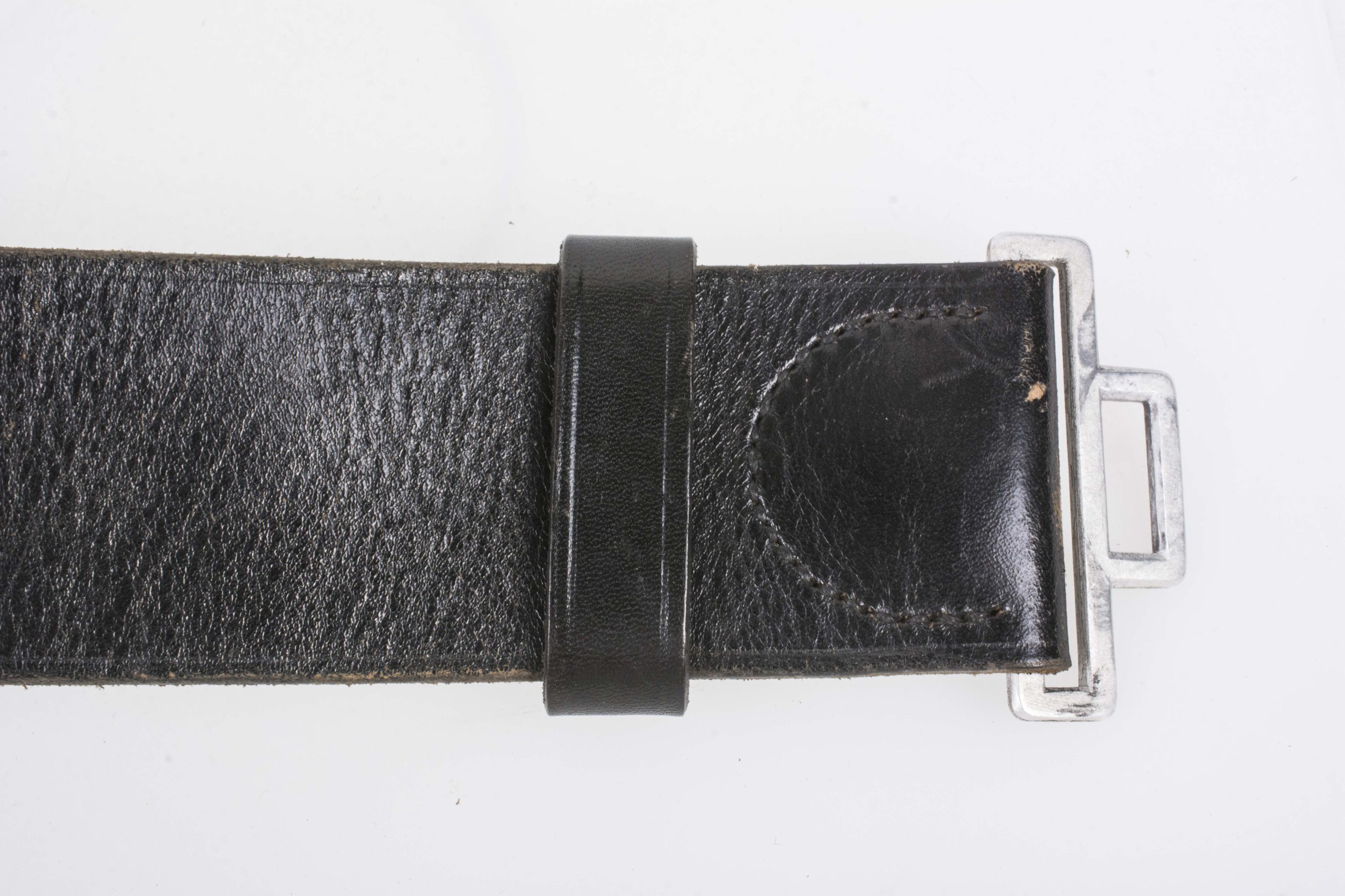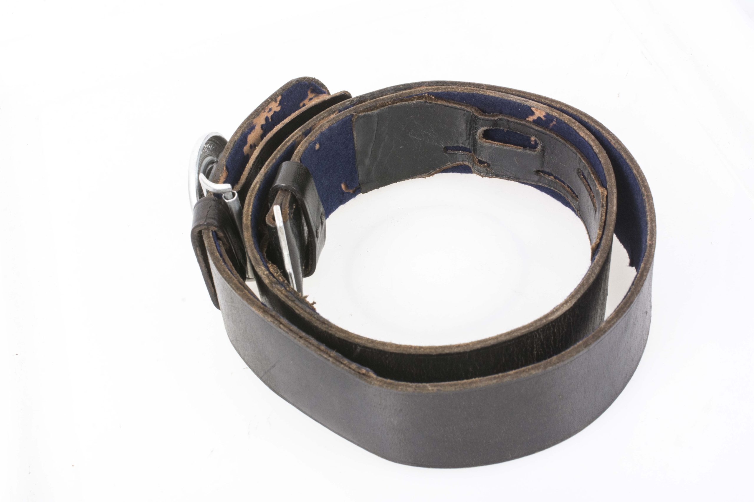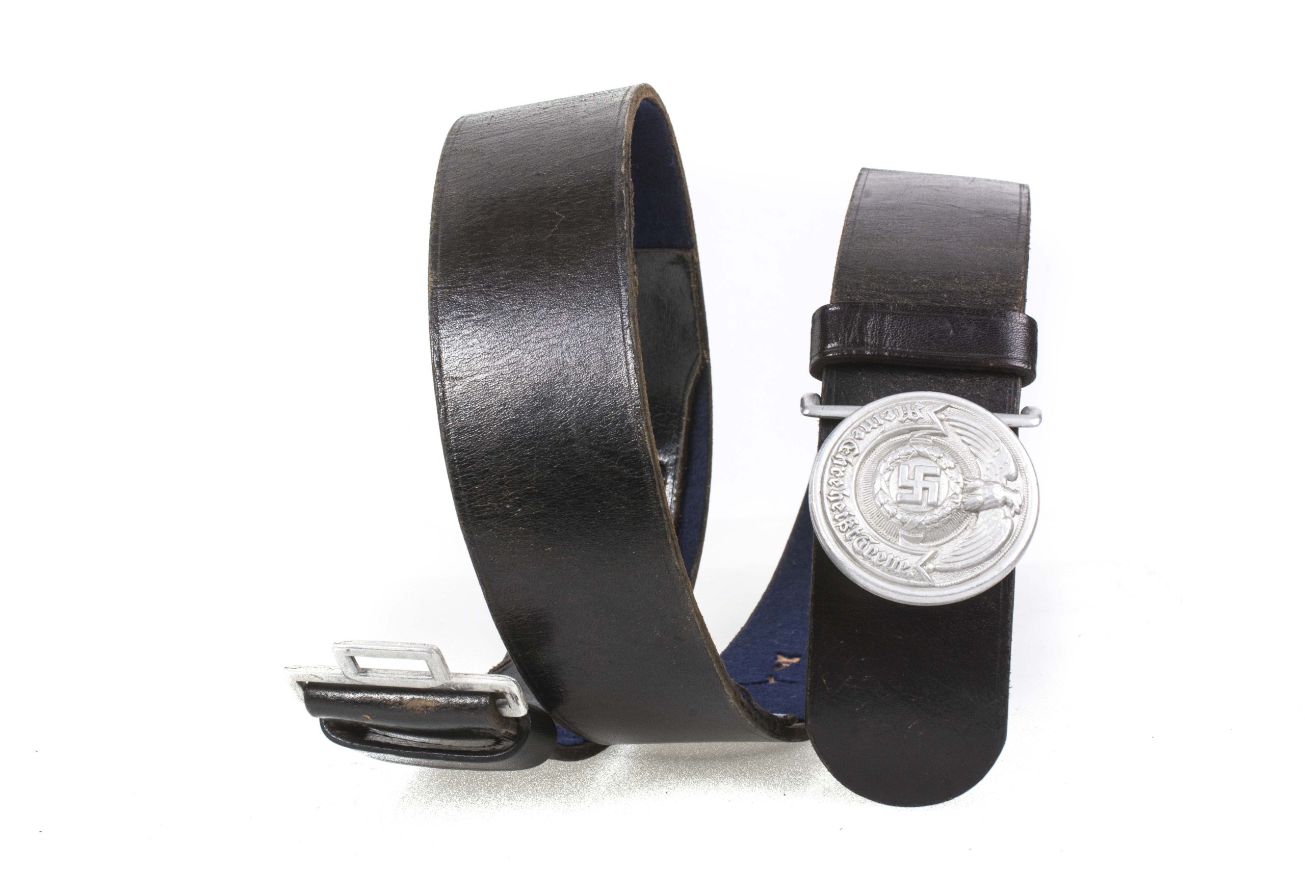 Textbook pre war Waffen-SS officer equipment belt in excellent condition. The belt is a nice large size fitting most if not all mannequins and is marked RZM 12/37 ᛋᛋ. The leather of the belt is in excellent, clean and supple condition. Inside the belt is a blue felt lining which is partially moth damaged. The buckle is a very nice aluminium example marked RZM 36/38 ᛋᛋ indicating production by Overhoff in 1938. The buckle retains most if not all of its original silver finish. Rare and hard to find belt set and a essential piece for the specialized collector which for sure is the best example I have ever had the pleasure to offer!