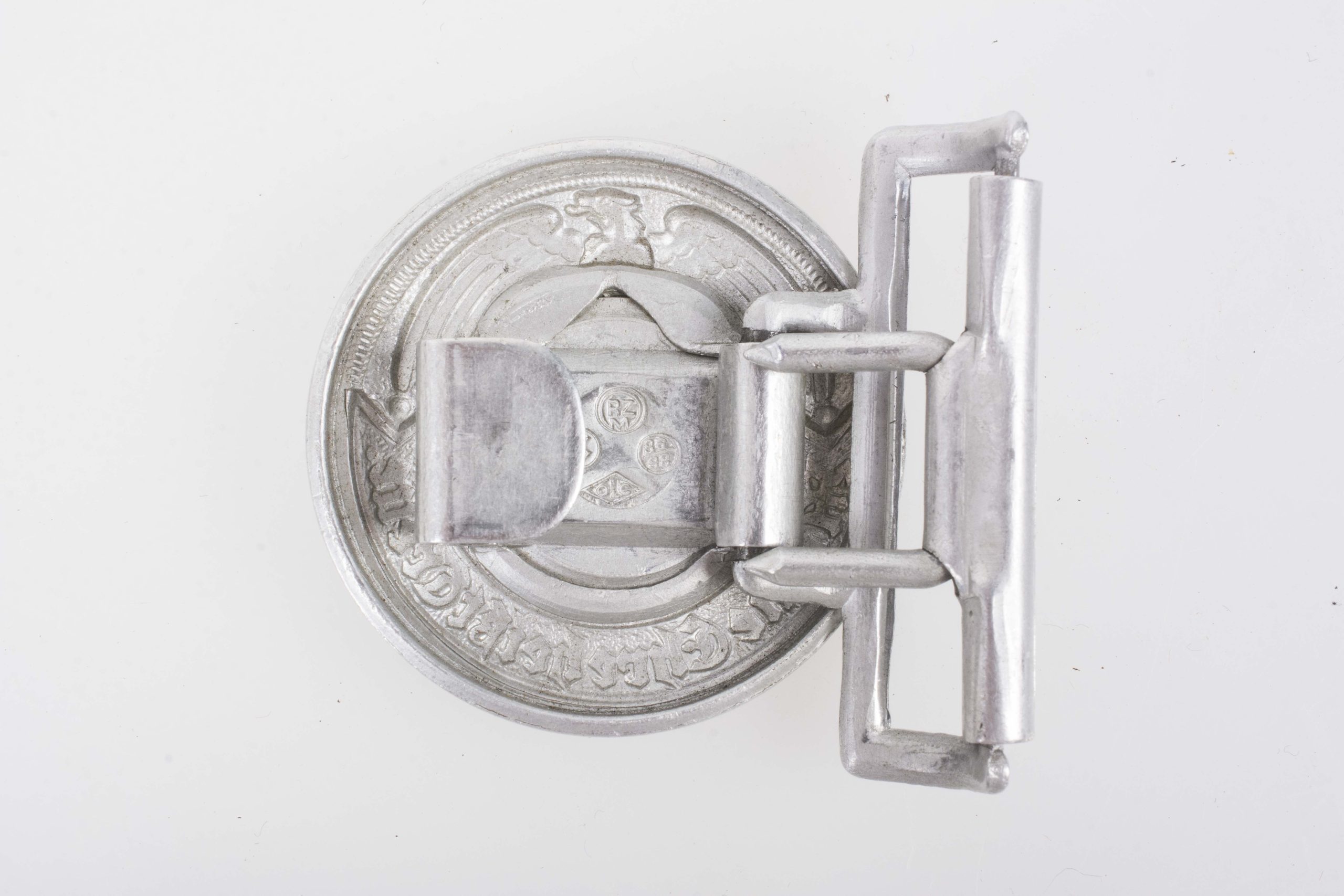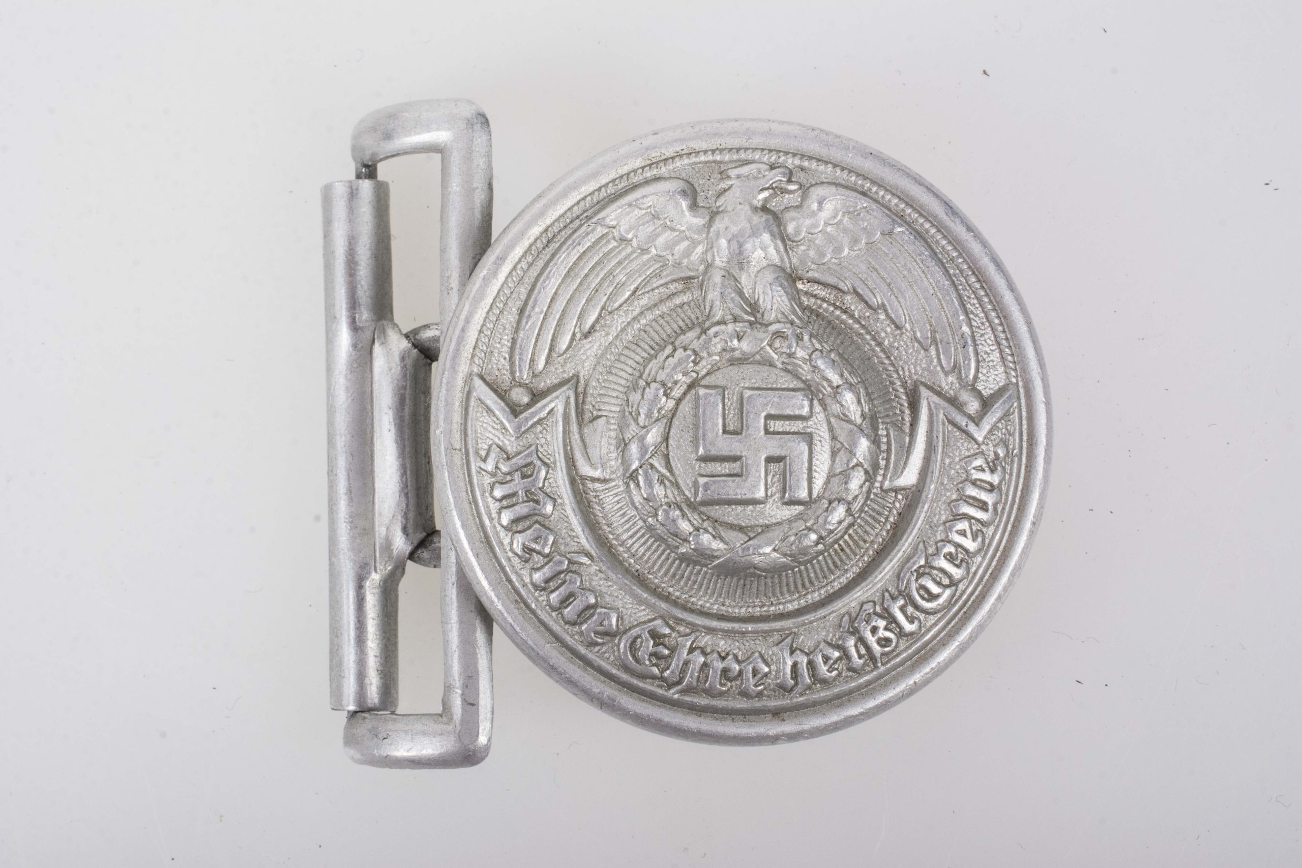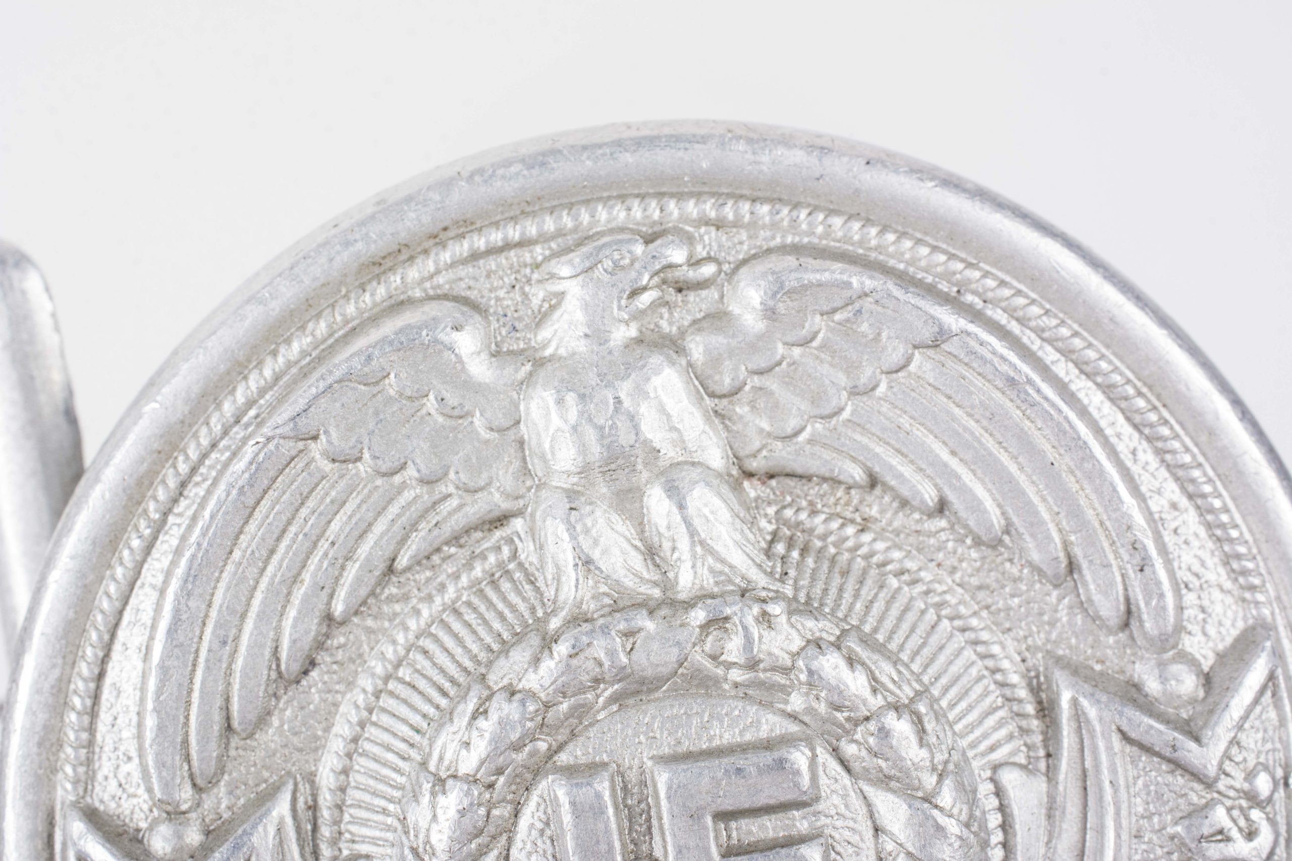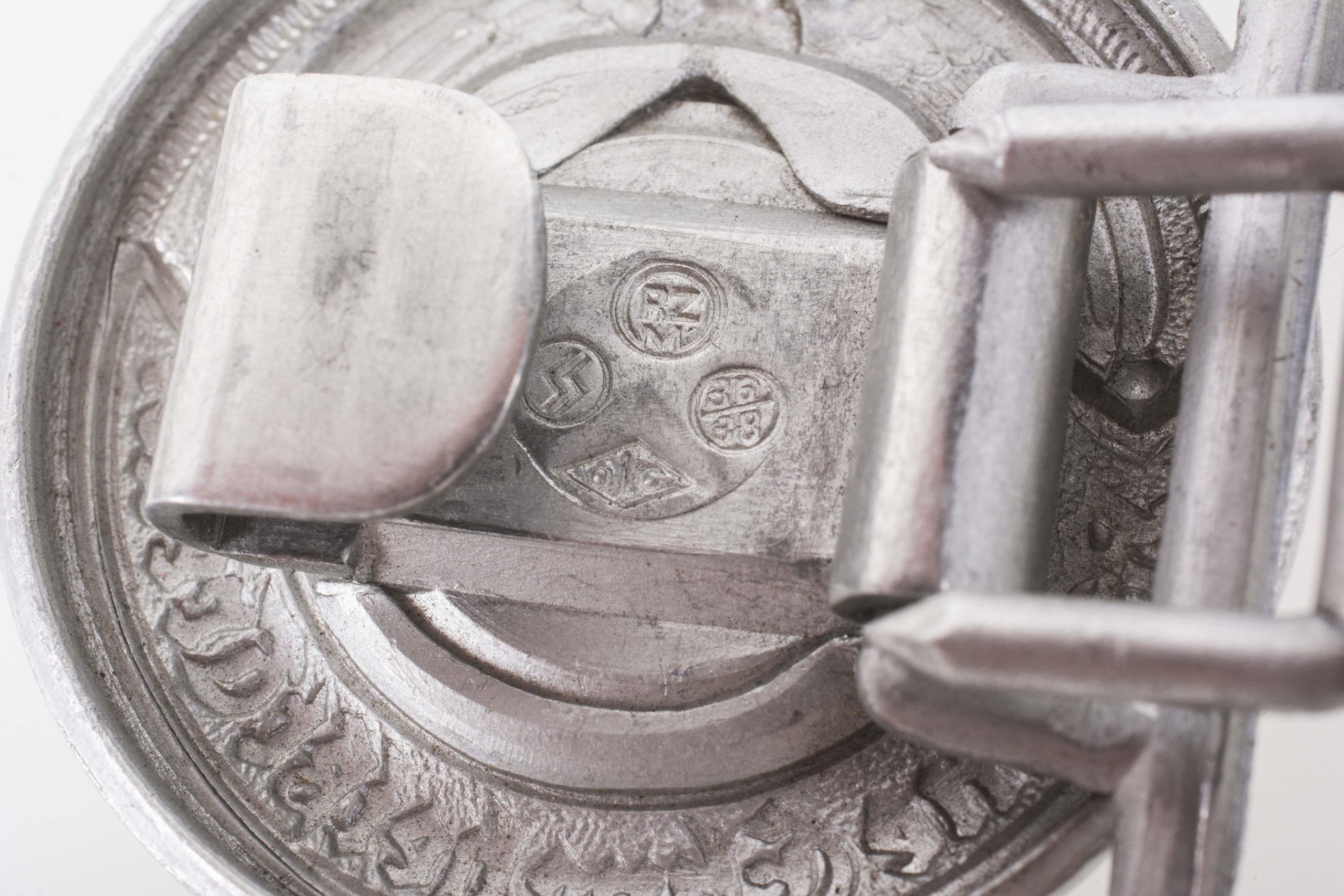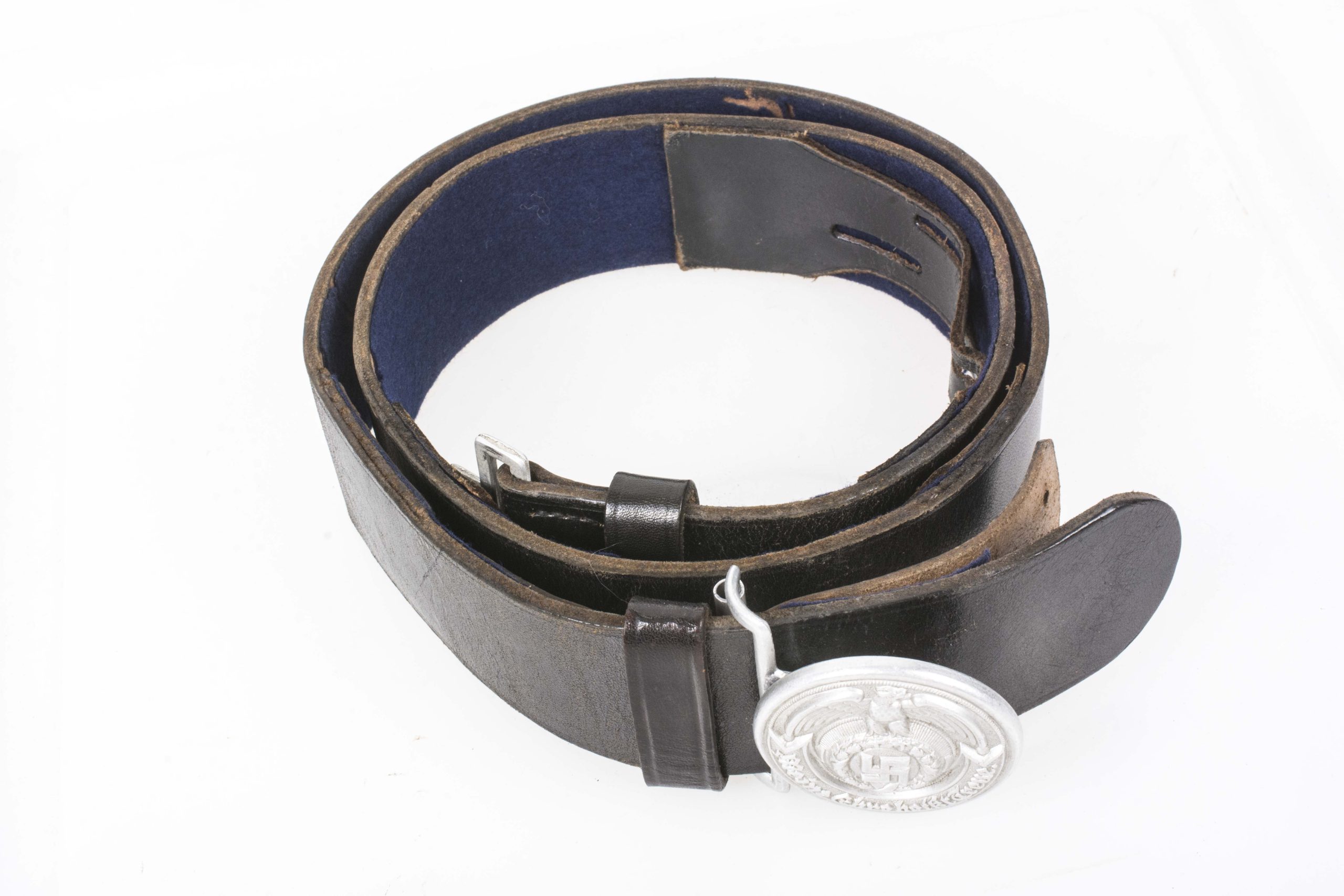 Textbook pre war Waffen-SS officer equipment belt in excellent condition. The belt is a nice large size fitting most if not all mannequins and is marked RZM 12/37 ᛋᛋ. The leather of the belt is in excellent, clean and supple condition. Inside the belt is a blue felt lining which is partially moth damaged. The buckle is a very nice aluminium example marked RZM 36/38 ᛋᛋ indicating production by Overhoff in 1938. The buckle retains most if not all of its original silver finish. Rare and hard to find belt set and a essential piece for the specialized collector which for sure is the best example I have ever had the pleasure to offer!