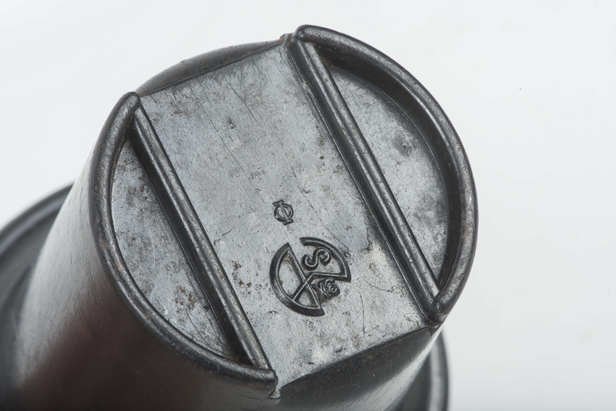 Black bakelite canteen cup in excellent condition. The cup is nicely marked 3X/S which is an unknown and rare manufacturer which features a small, unknown marking under the MPD code. Rare example!