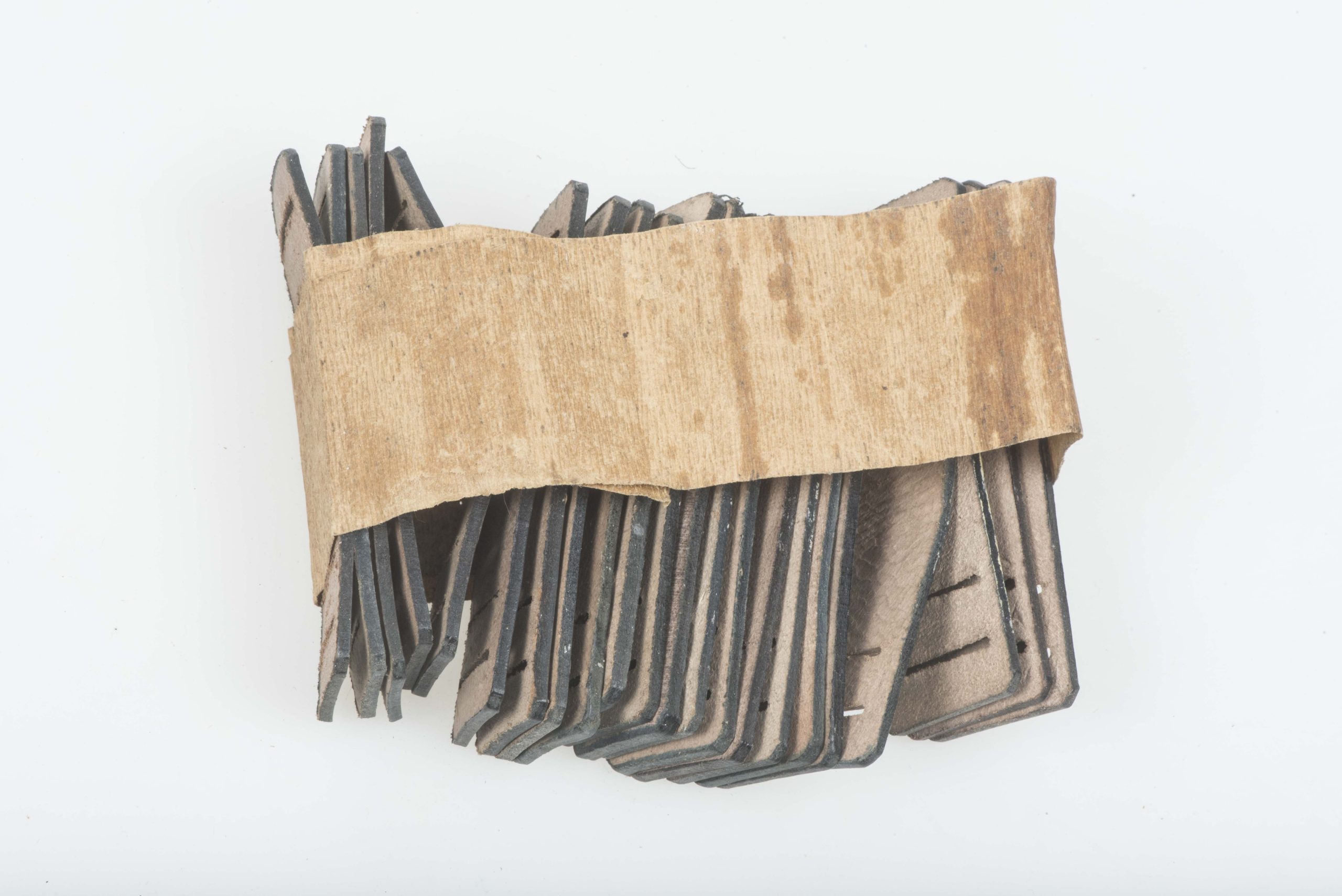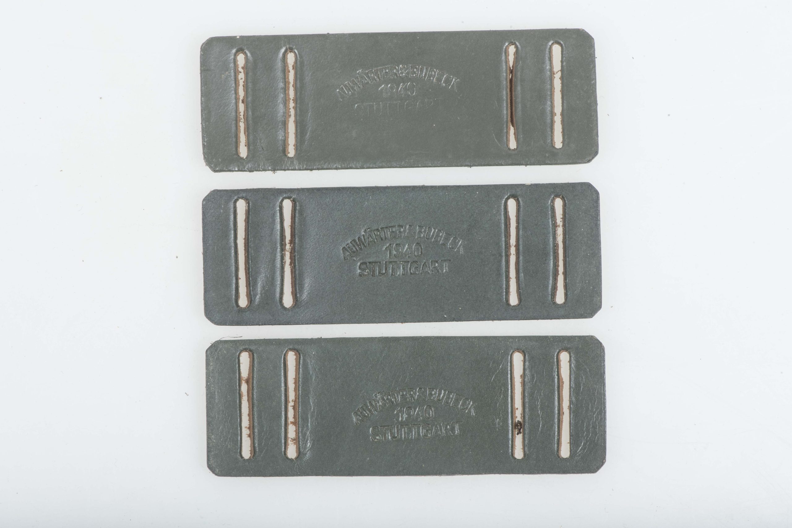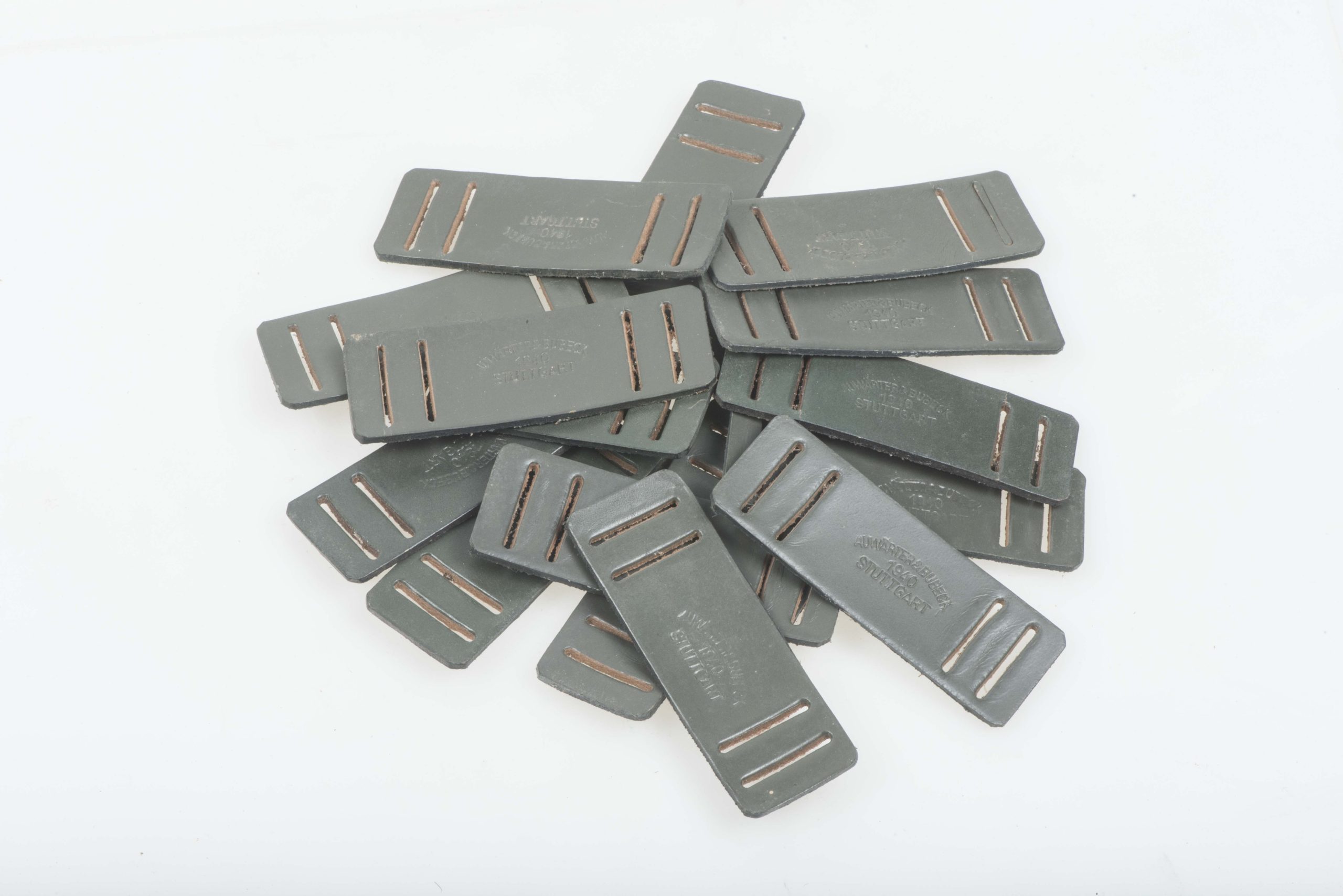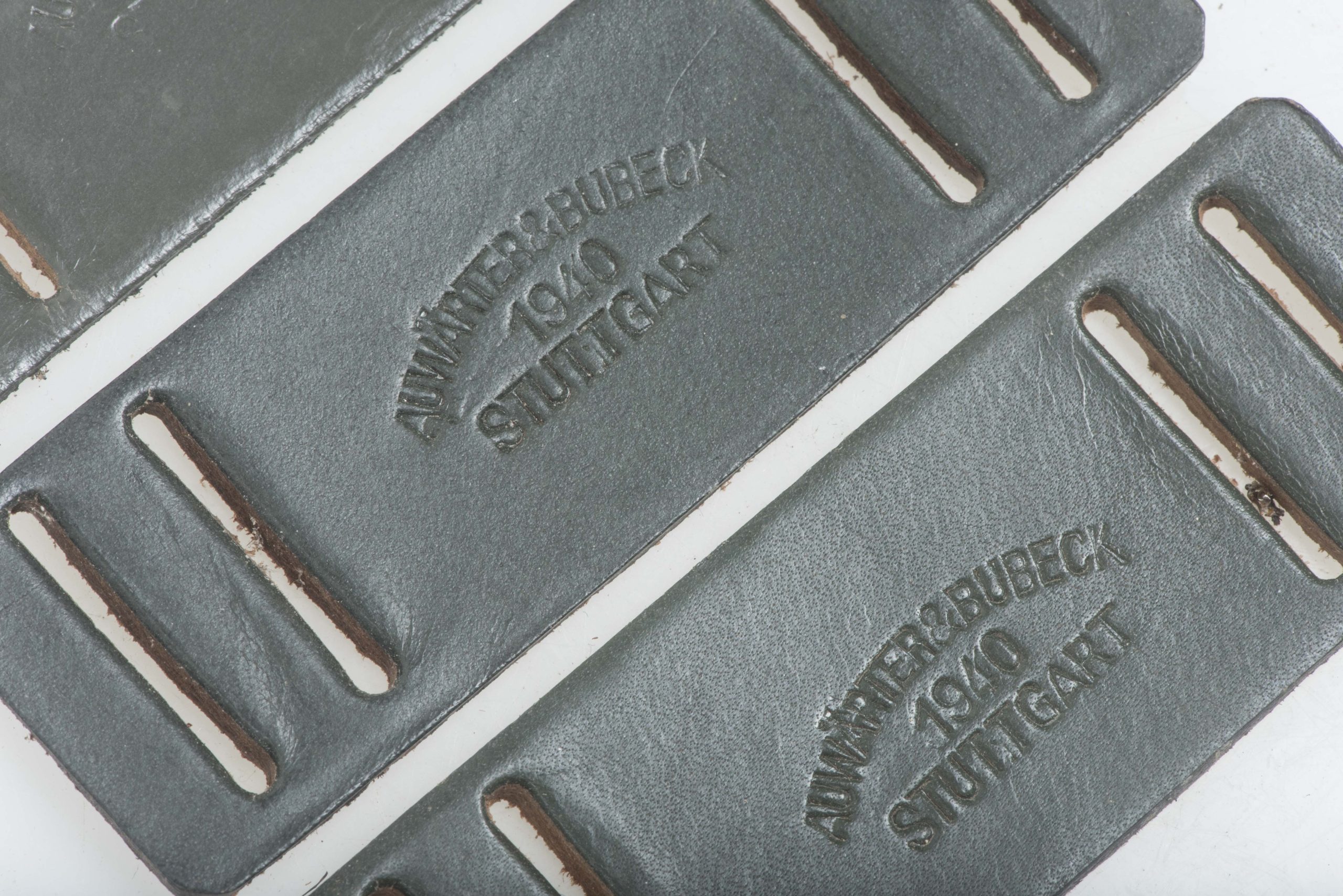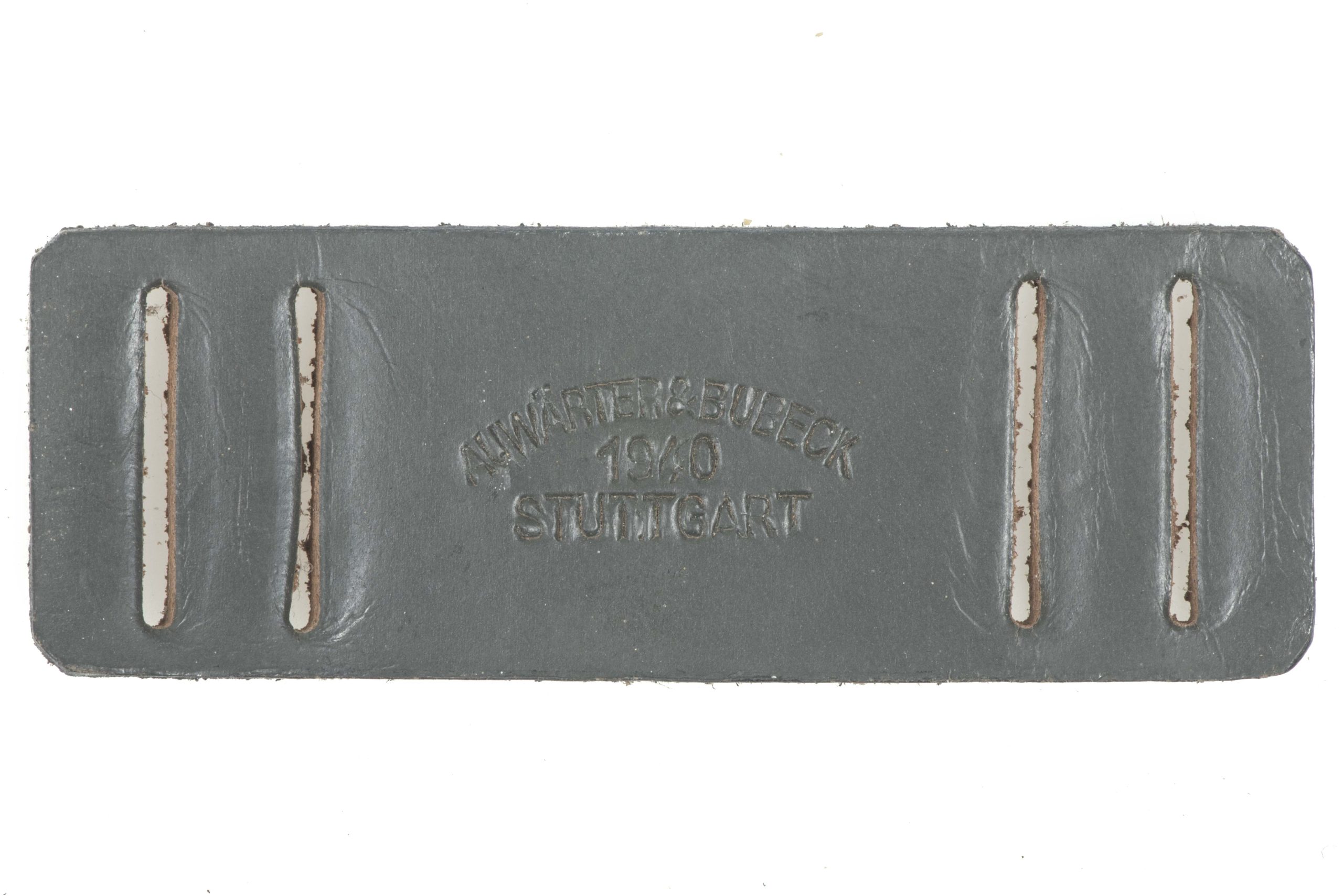 Rare unissued leather gasmask strap reinforcement marked Auwärter & Bubeck, 1940 Stuttgart