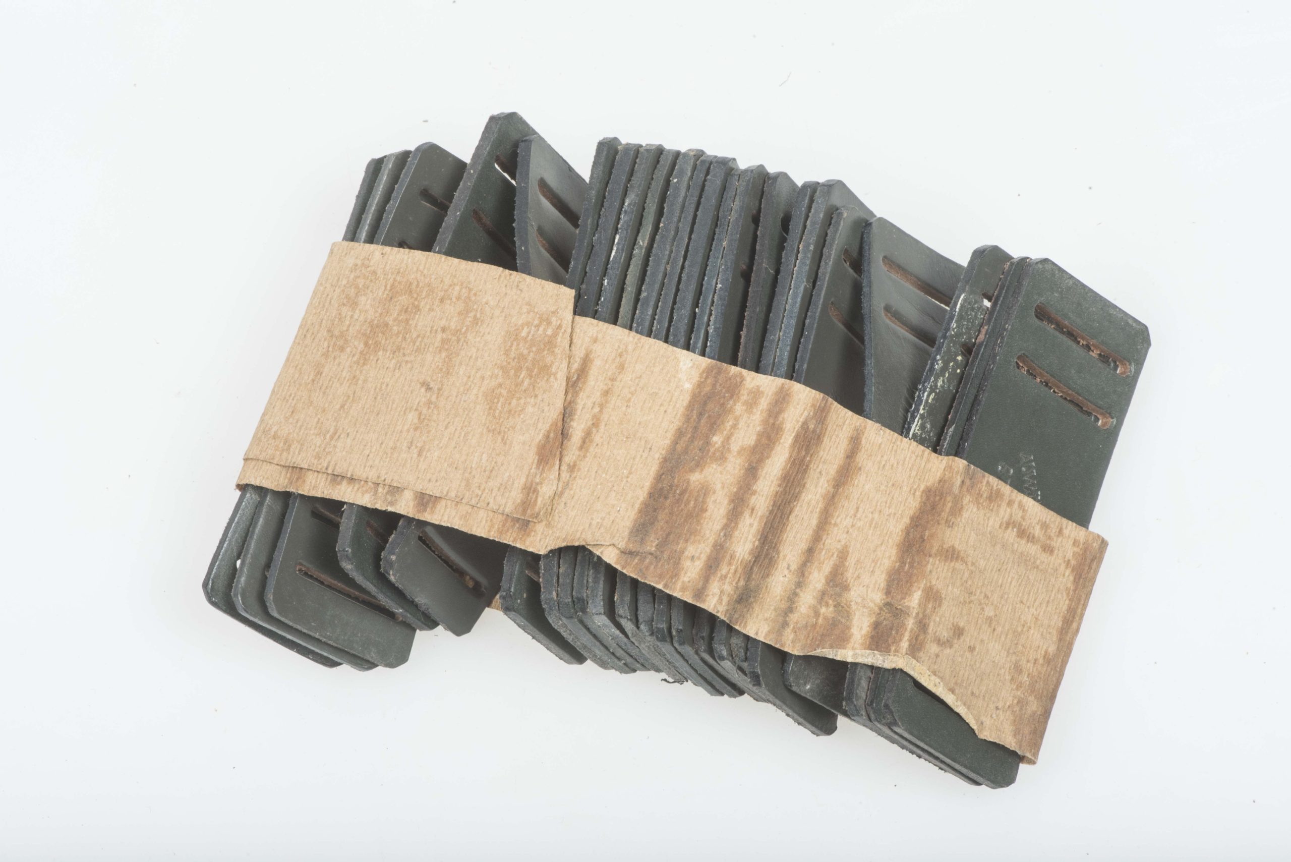 Rare unissued leather gasmask strap reinforcement marked Auwärter & Bubeck, 1940 Stuttgart. The reinforcements come out of an original bundle. The leather is rather stiff and it would be hard fitting them on a strap. I have multiple of these in stock, the price is naturally for one.