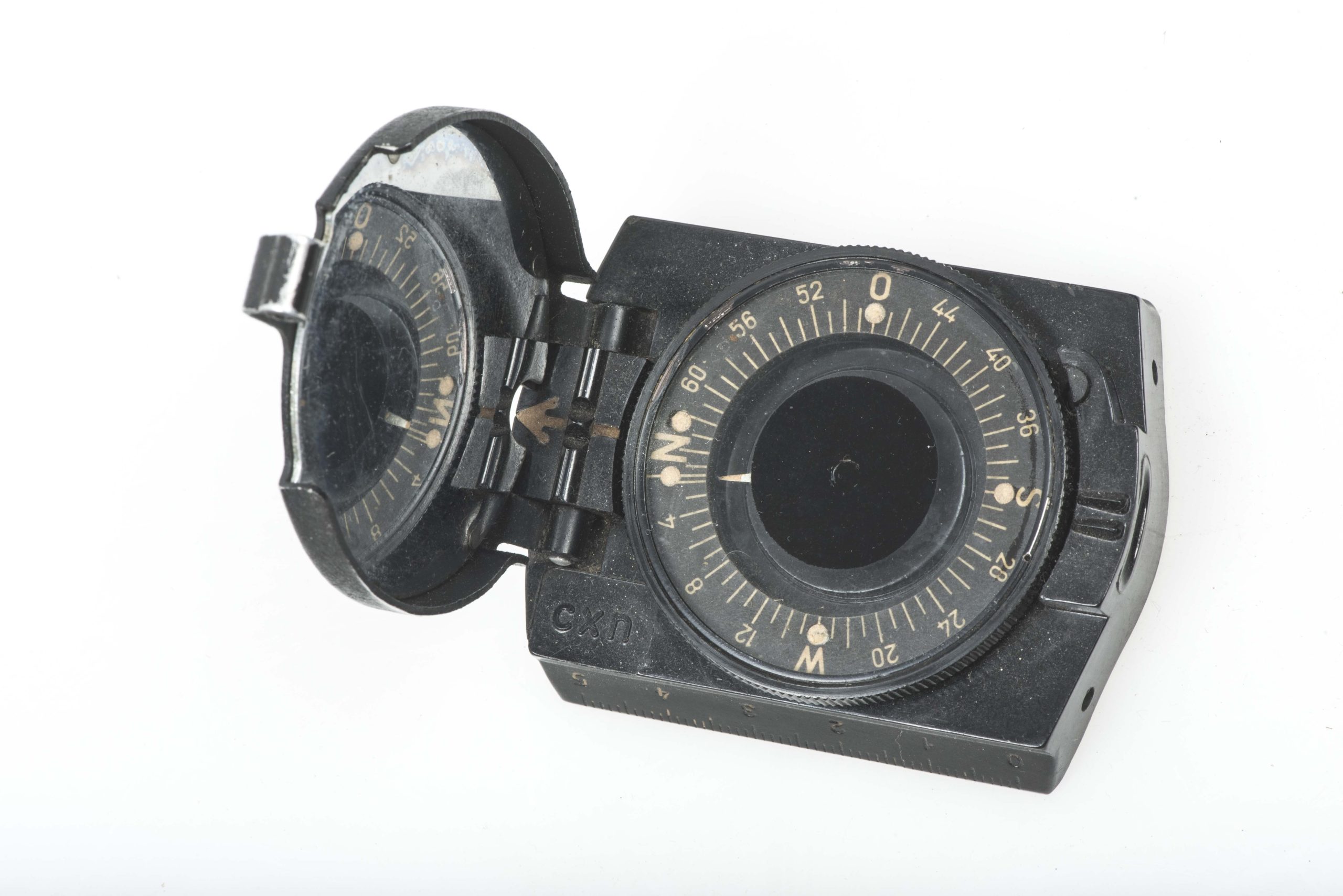 Bakelite marching compass marked cxn indicating production by Emil Busch, Rathenow. The bakelite frame is marked N7 indicating production by Cuno Heinzelmann -Hassberg, Berlin.