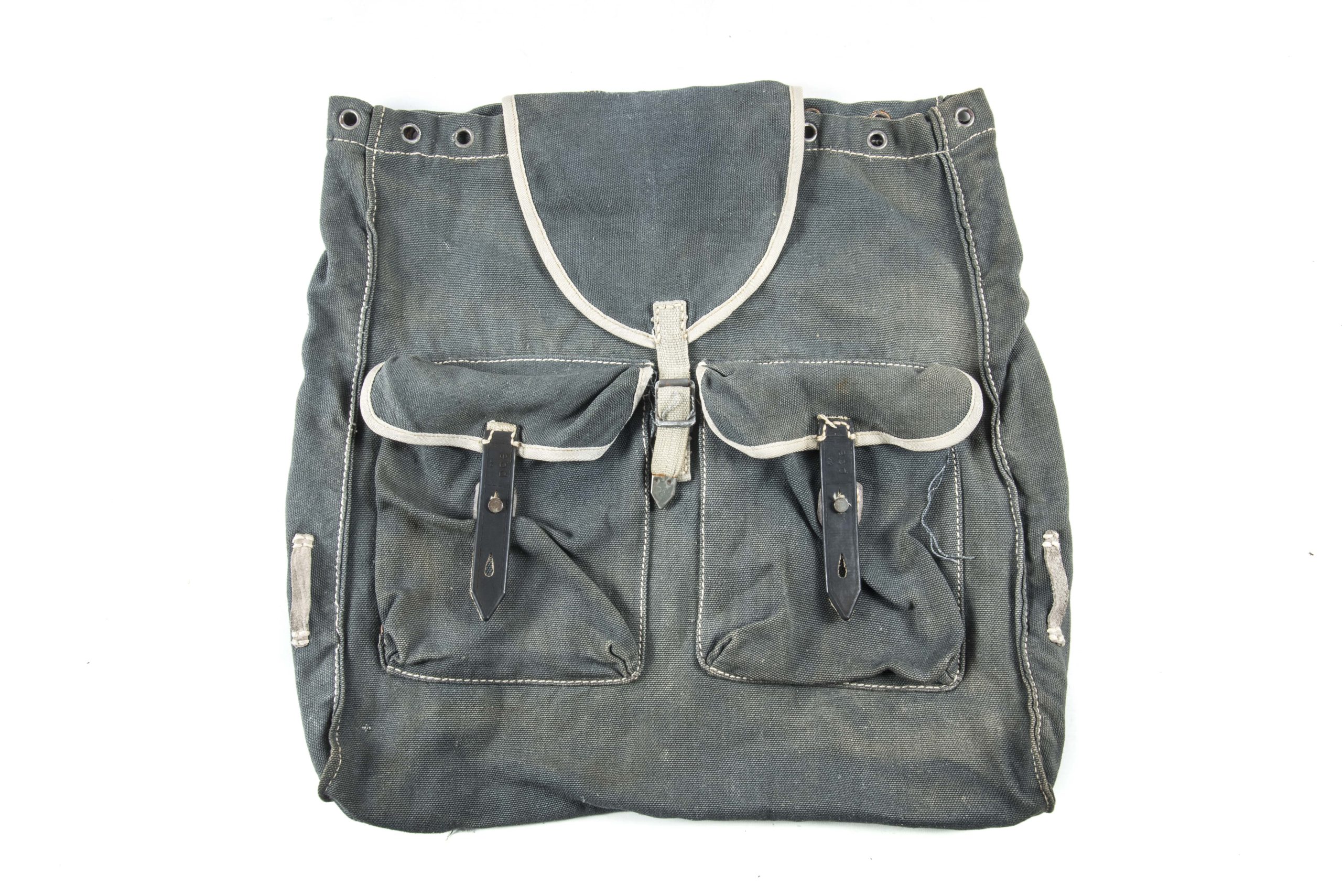 Blue rucksack with gasmask canister strap parts marked ebd 44