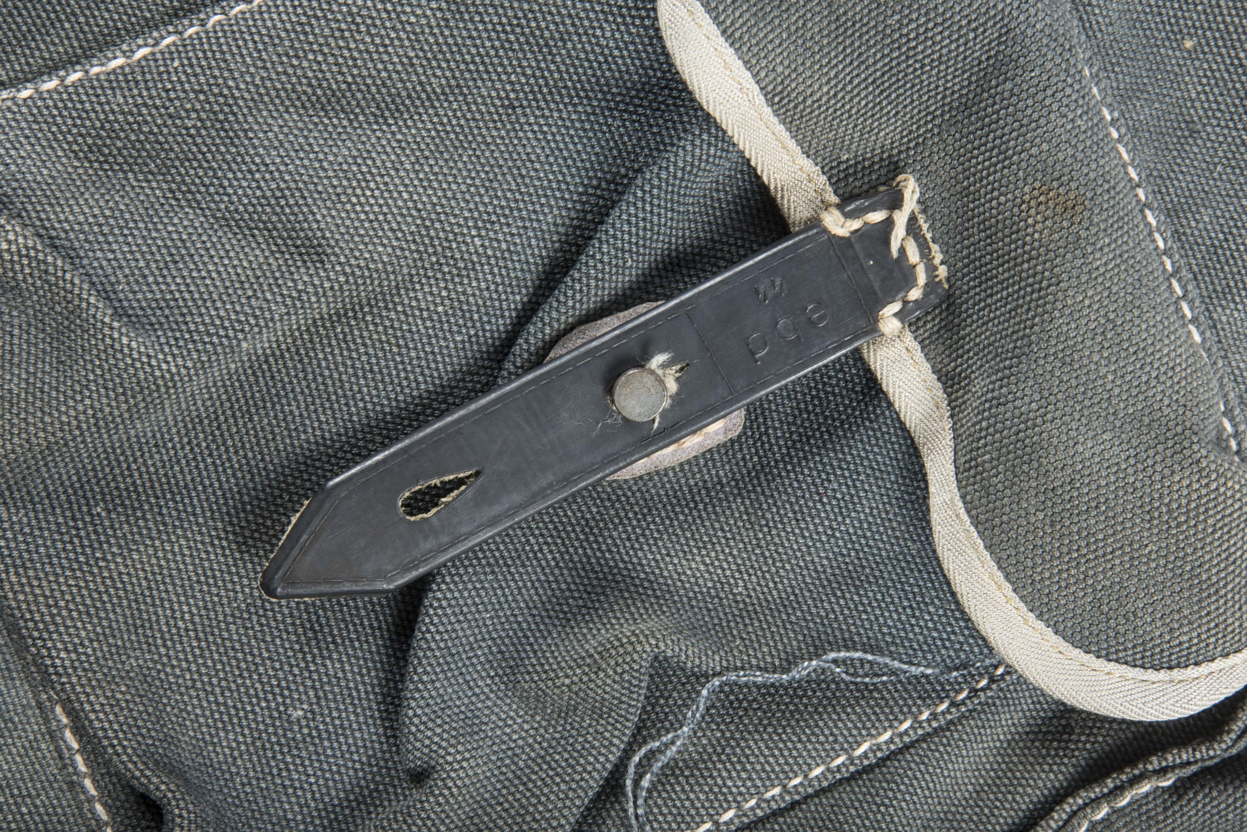 Blue rucksack with gasmask canister strap parts marked ebd 44 in good used condition. This bag is one of the last examples made for the Wehrmacht or most probably made in the direct post war period for use with POW’s. I have never seen this variant before and in my opinion it fits right in the late war equipment collection!