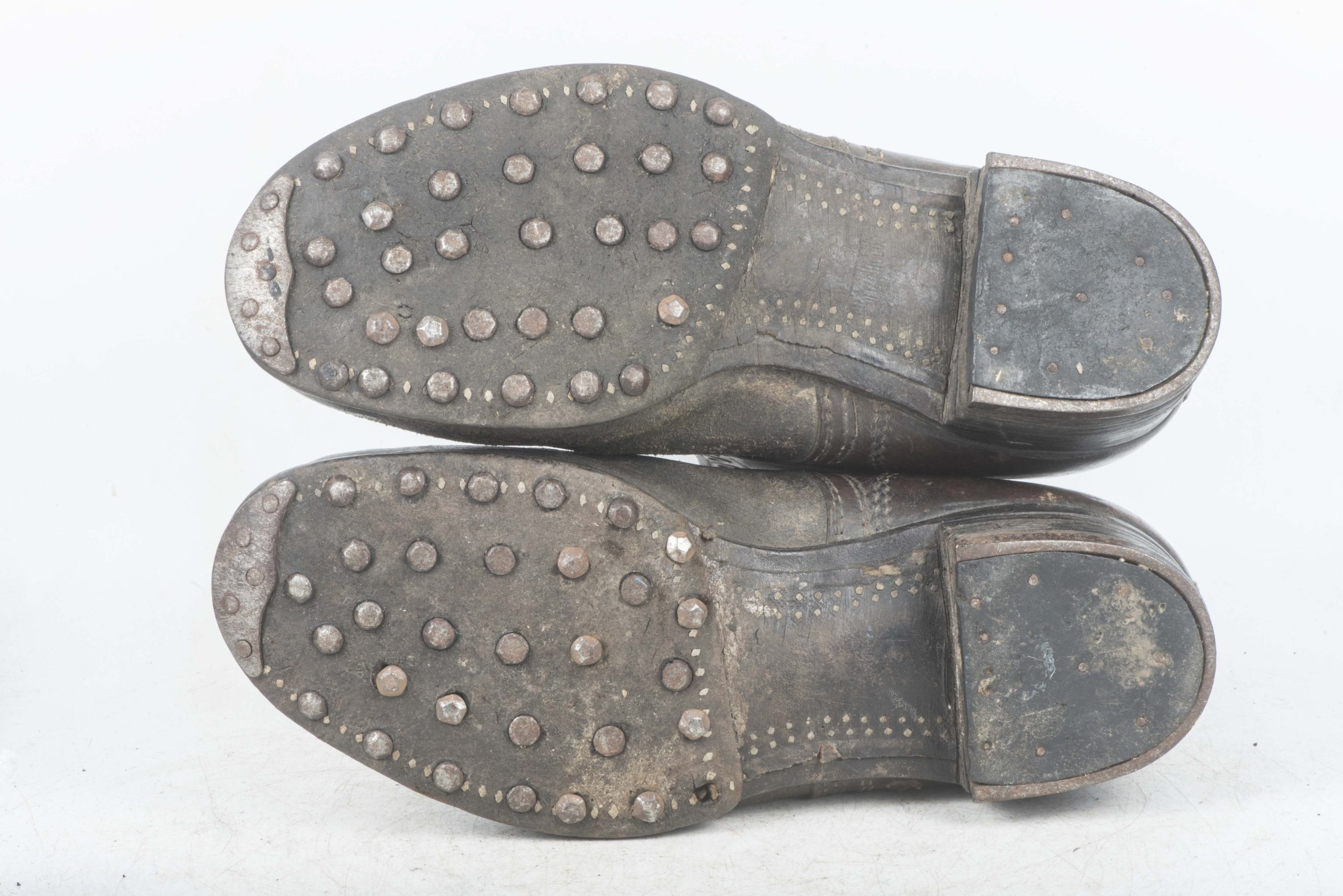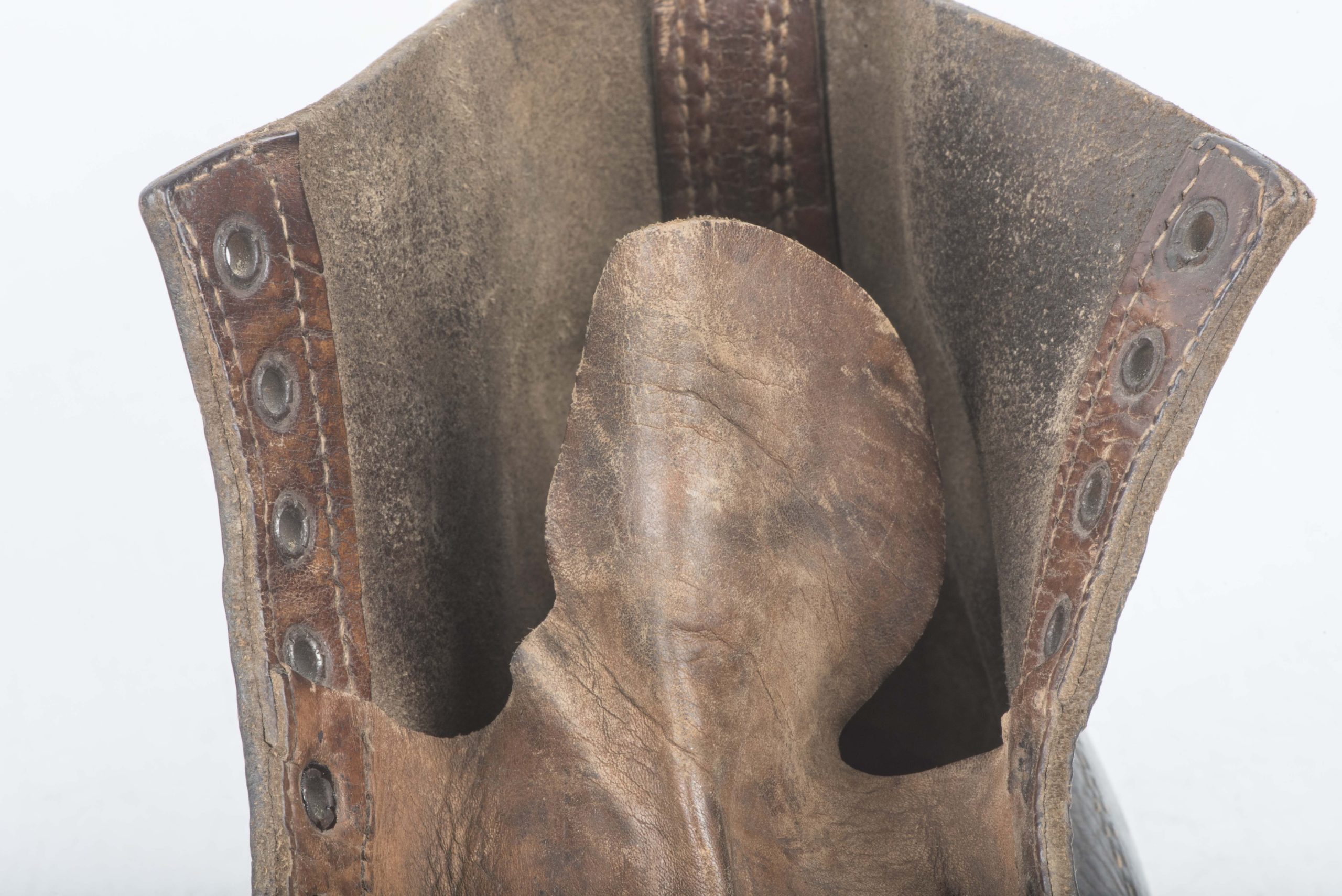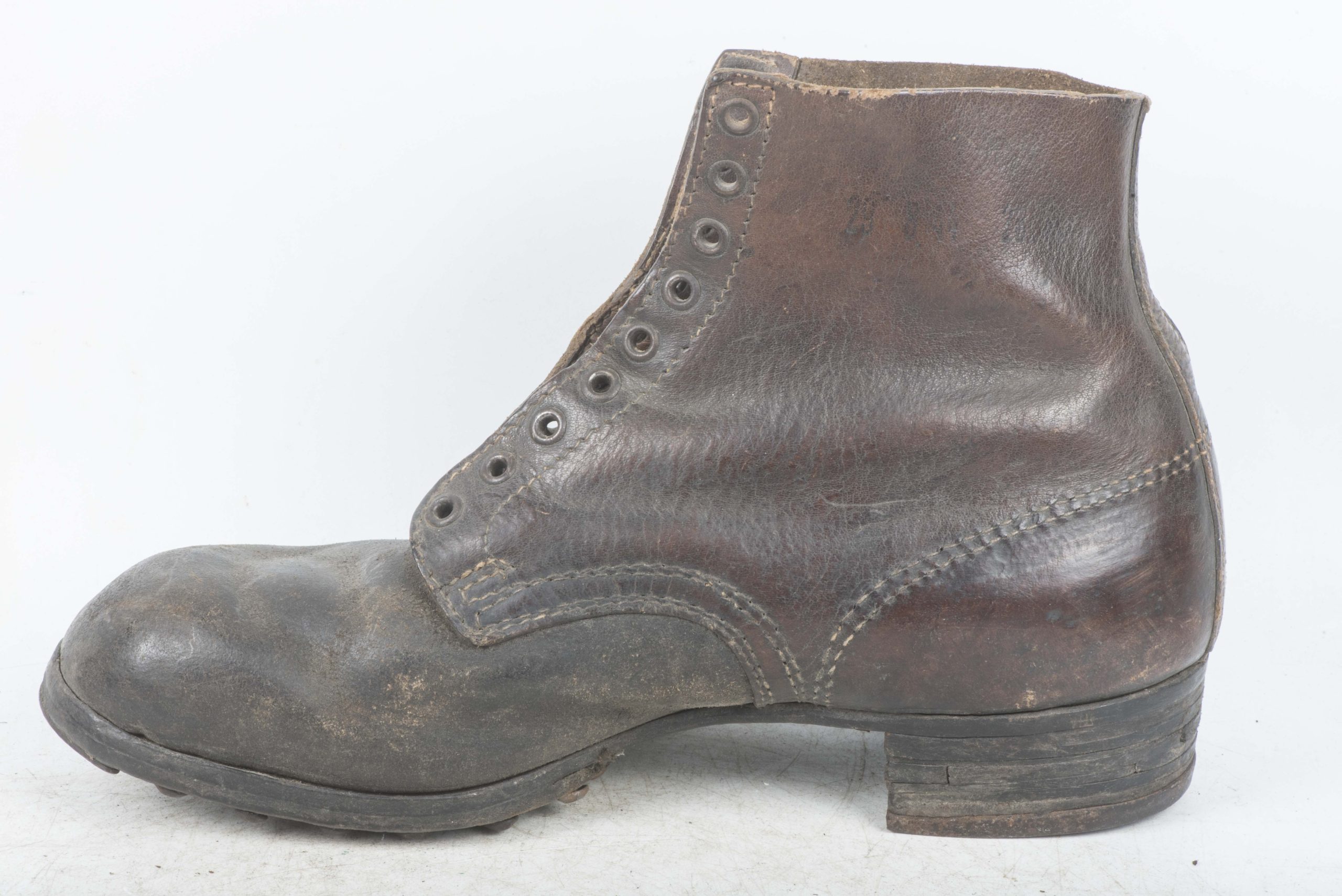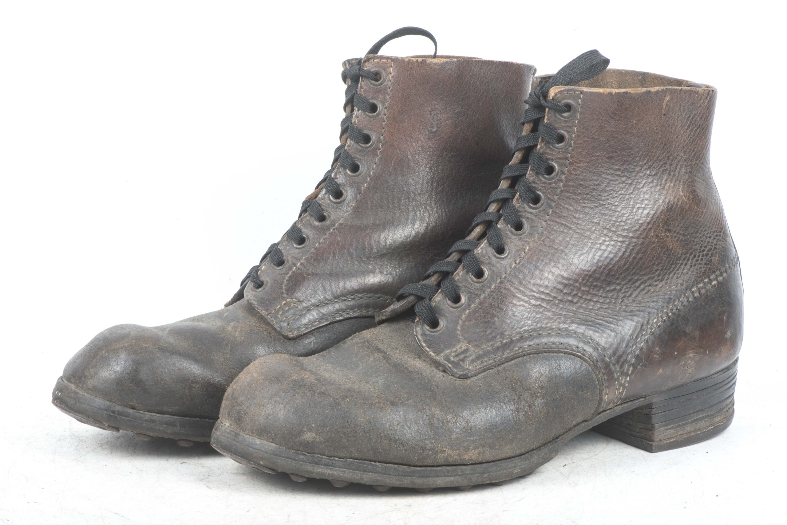 Late war brown issue M37 lowboots or Schnürschuhe in good, lightly worn condition. The boots are a nice medium to large size and dated 1944 at the top. Textbook pair in good condition with original metal tipped rayon laces, perfect for a mannequin!