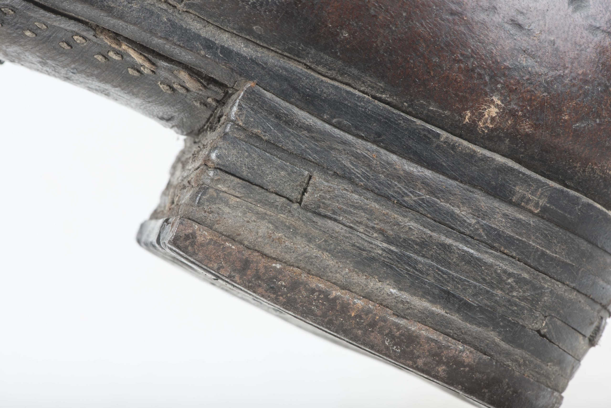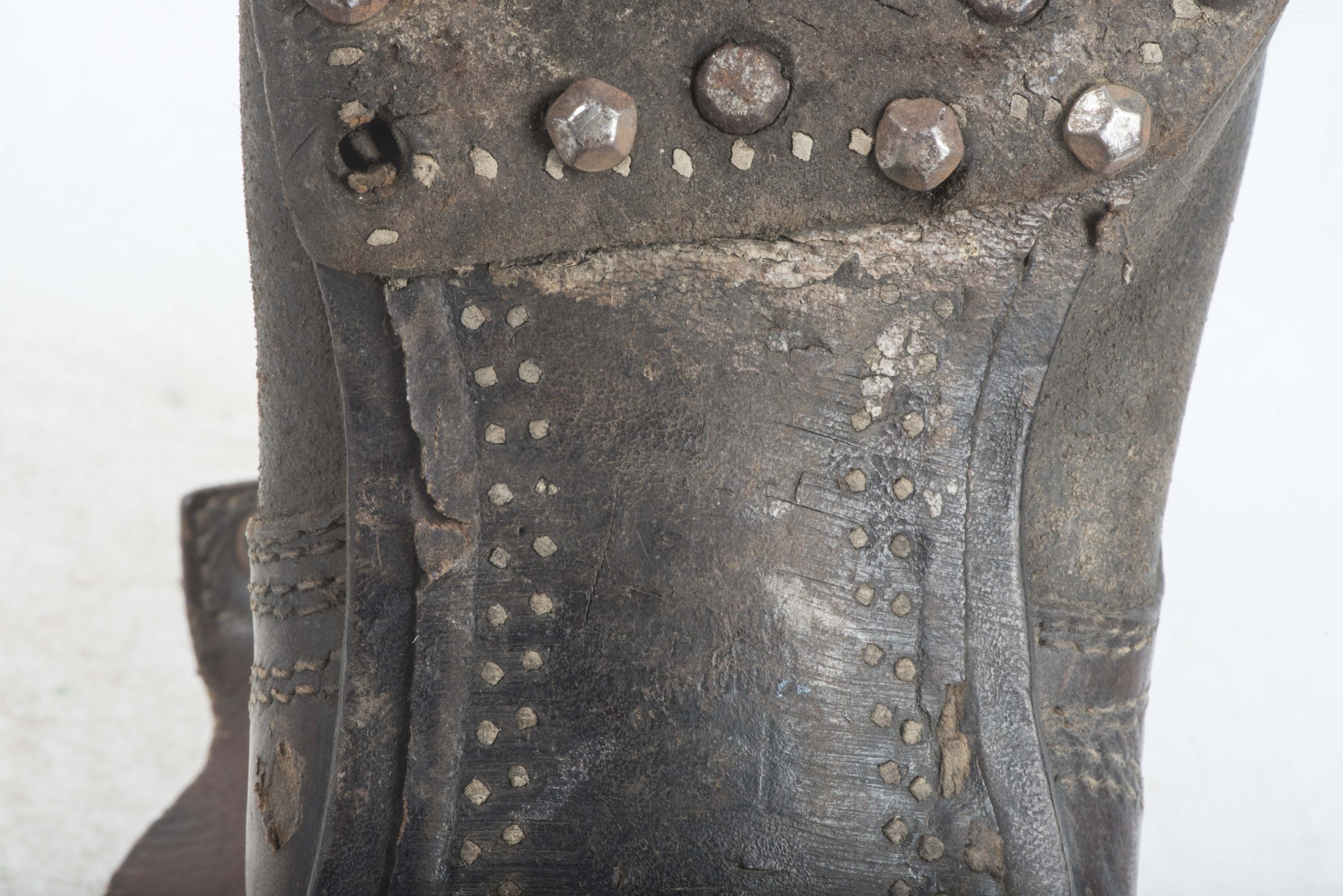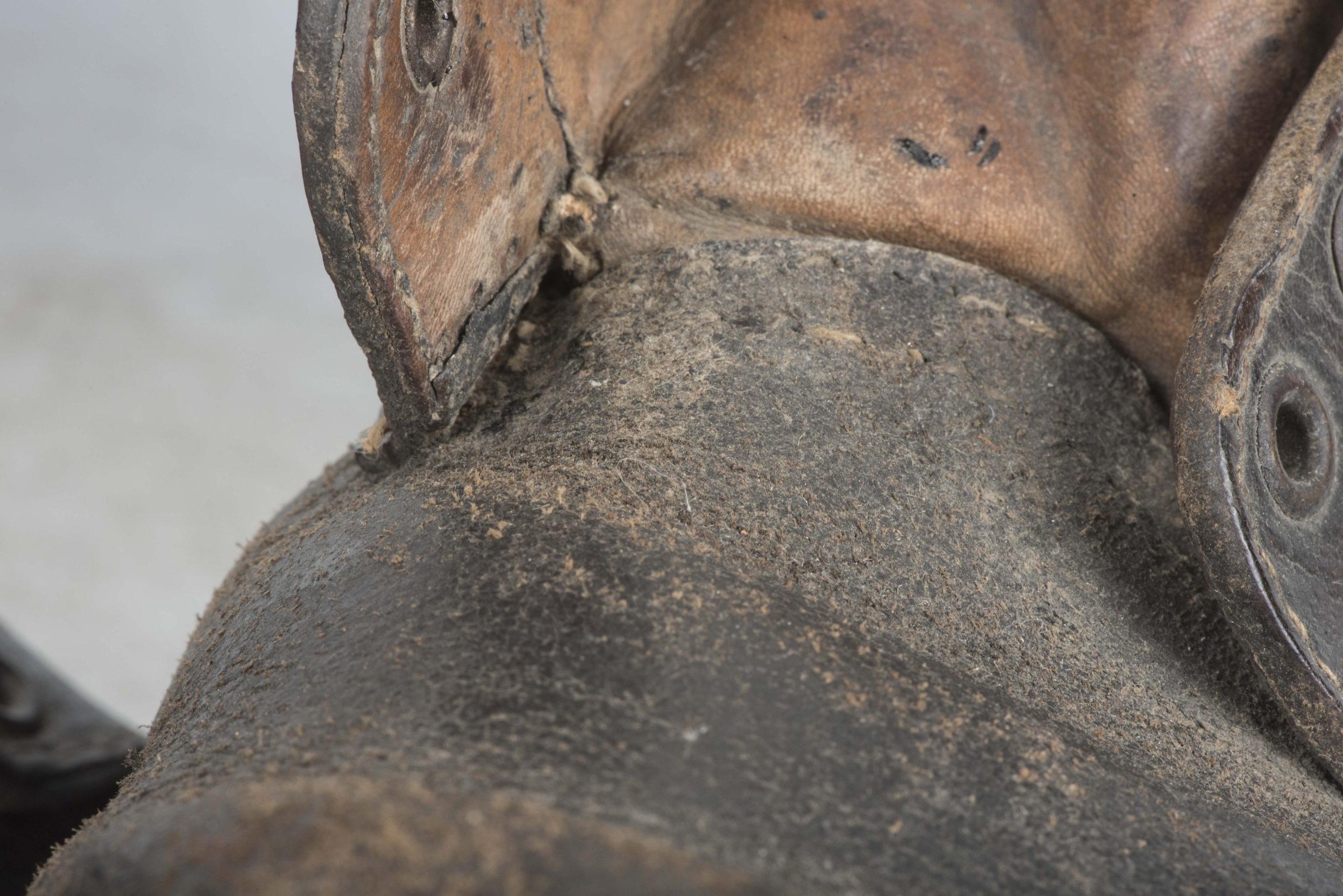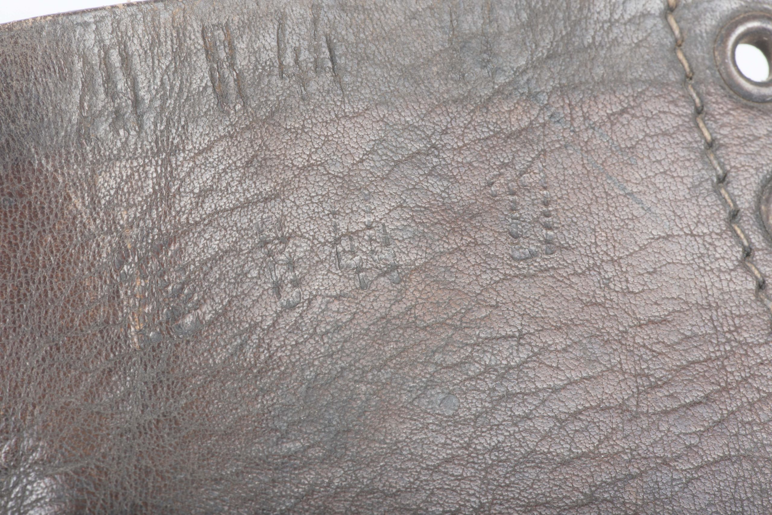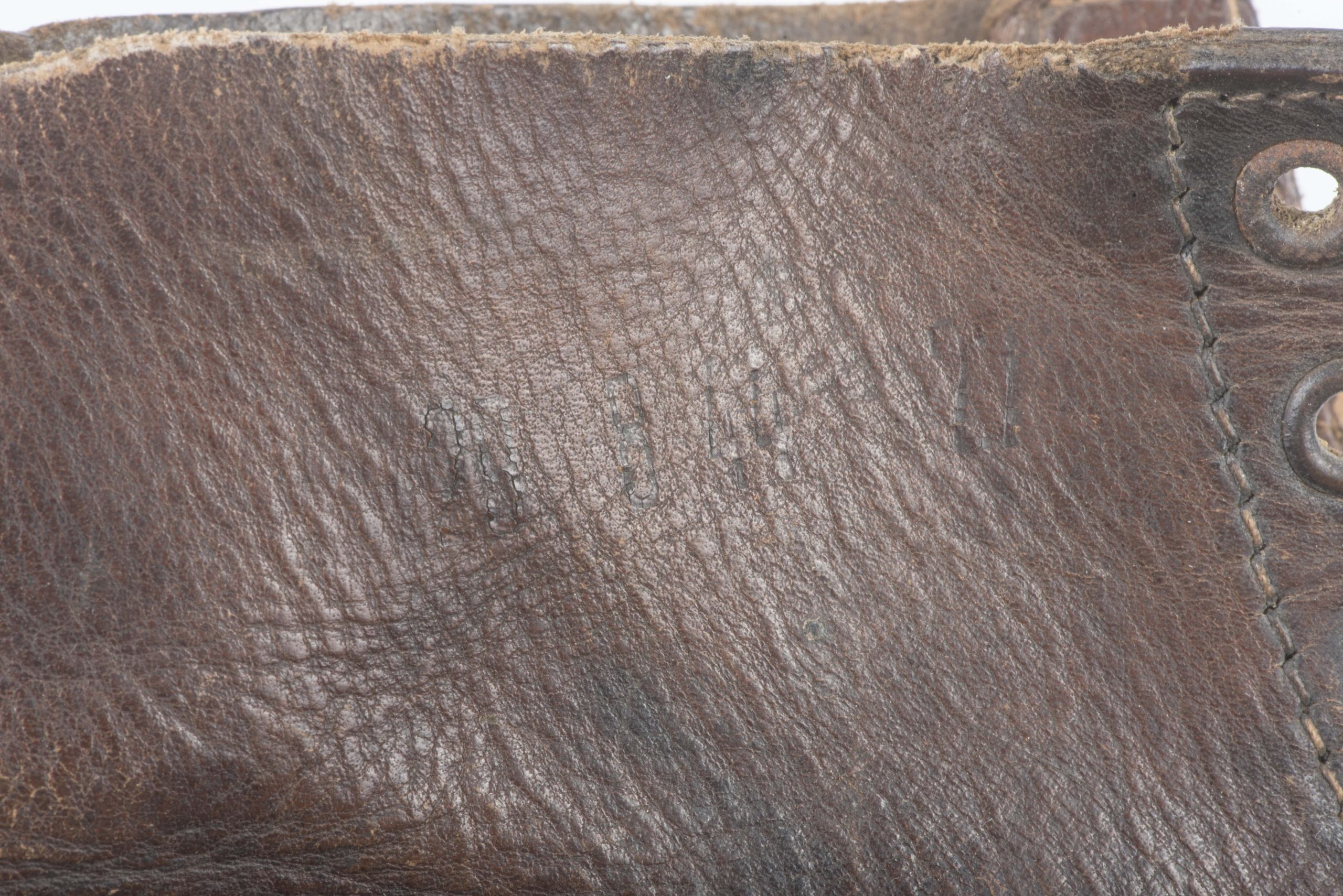 Late war brown issue M37 lowboots or Schnürschuhe in good, lightly worn condition. The boots are a nice medium to large size and dated 1944 at the top. Textbook pair in good condition with original metal tipped rayon laces, perfect for a mannequin!