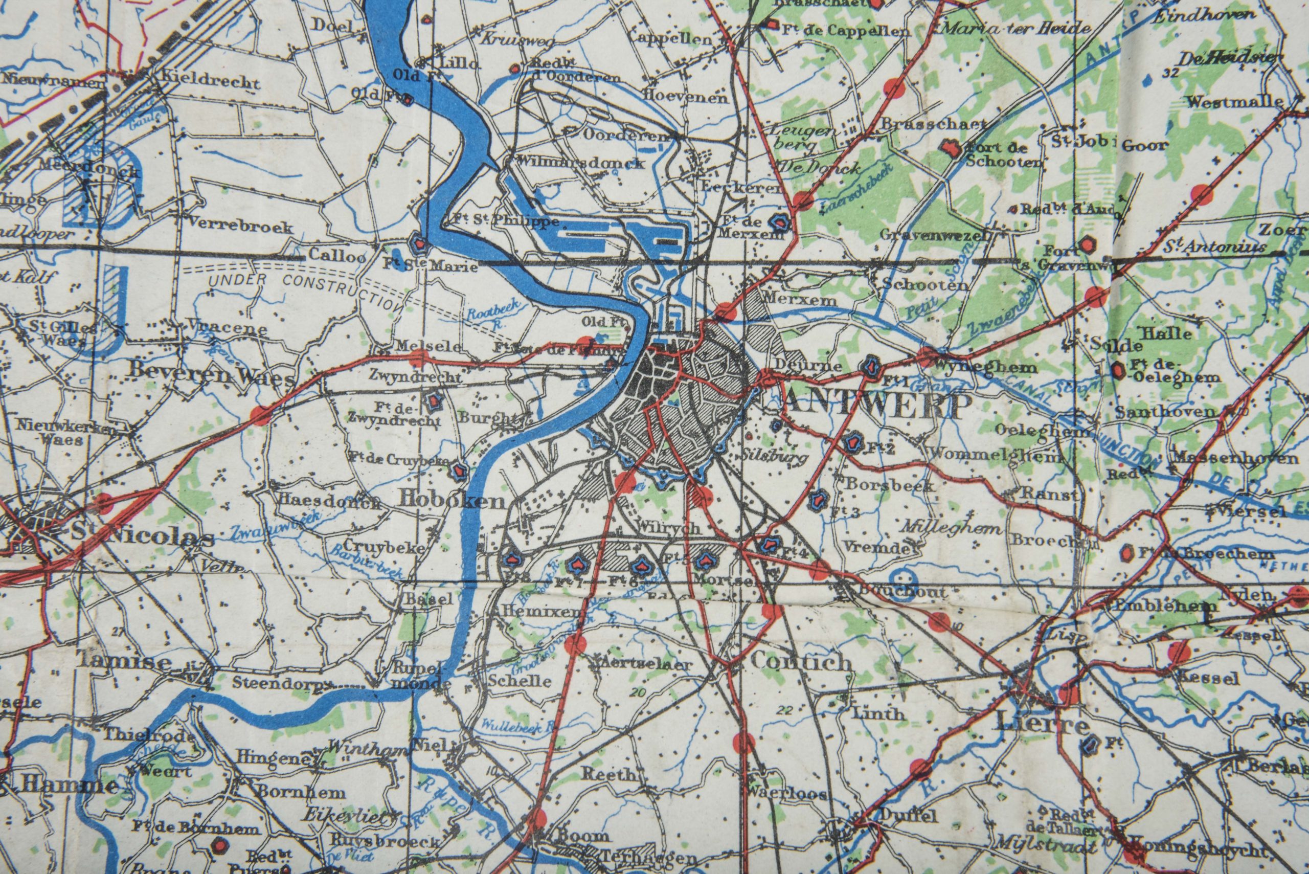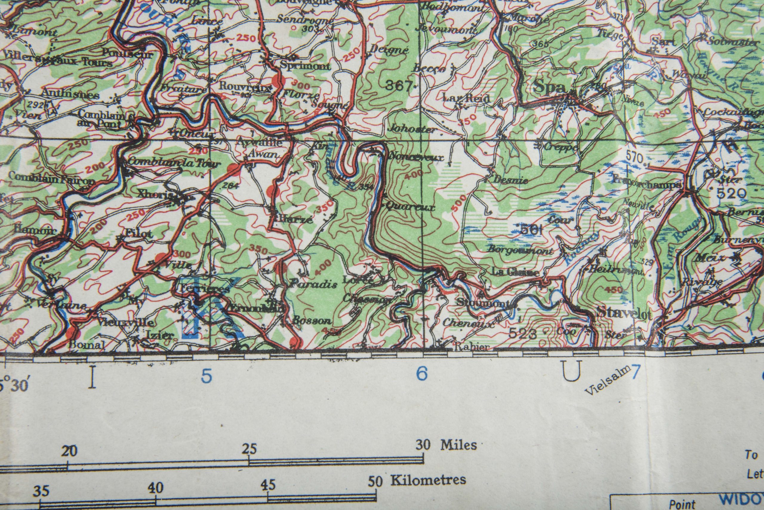 British 1:250 000 Ardennes map, Brussels-Liege in good condition. This map shows almost Belgium in full; or the Ardennes Offensive from start to calculated, not reached finishline.