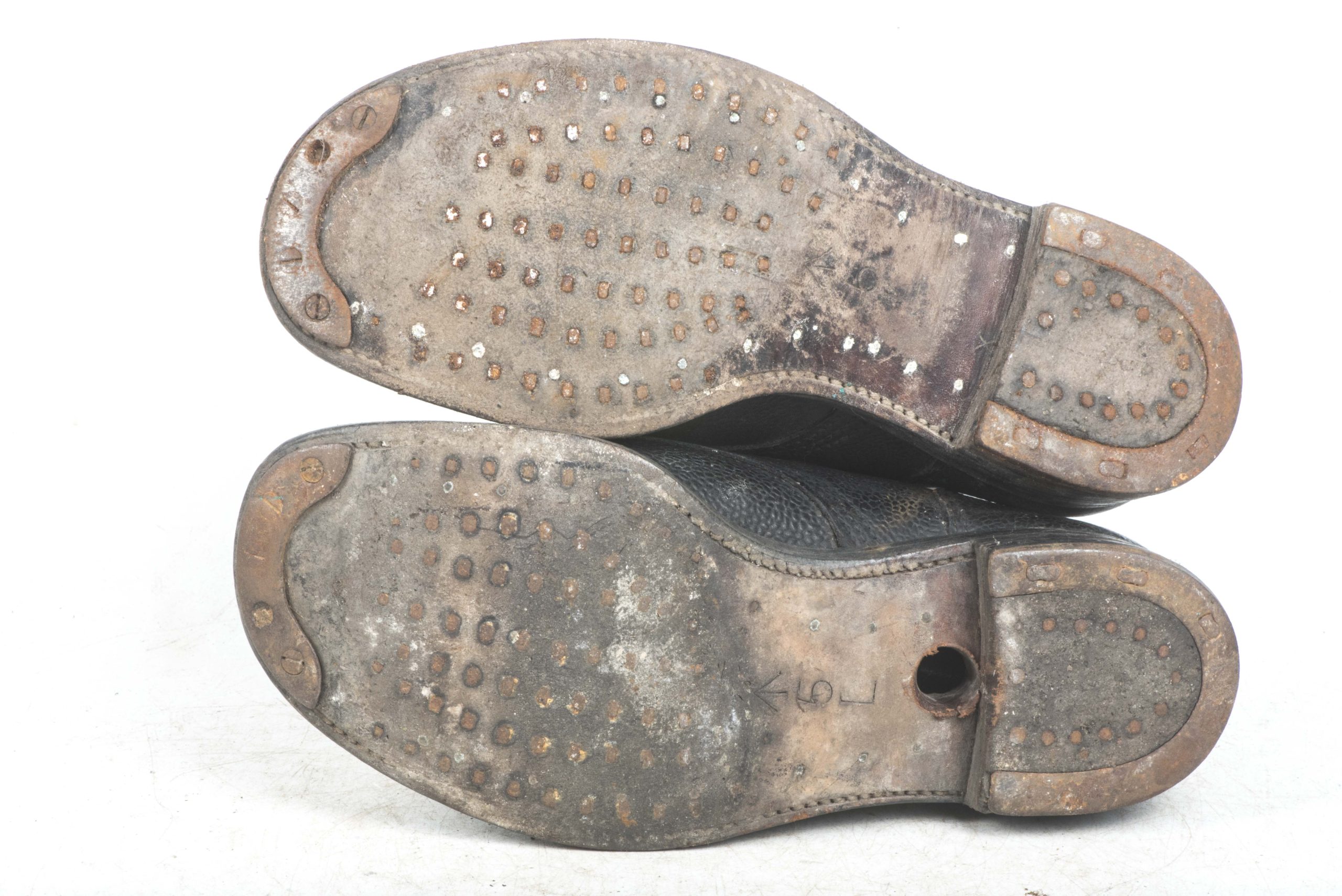 British ammo boots marked Horrell LTD 5L 1944 in good used condition. One hole has been drilled for a mannequin. Otherwise nice pair.