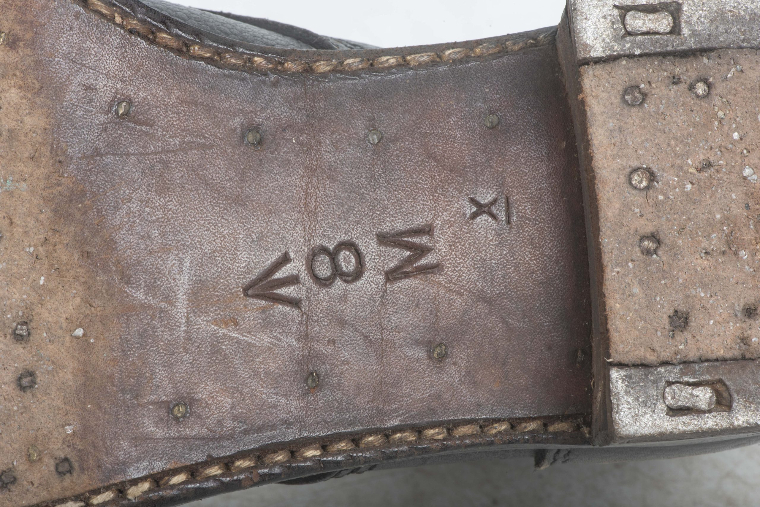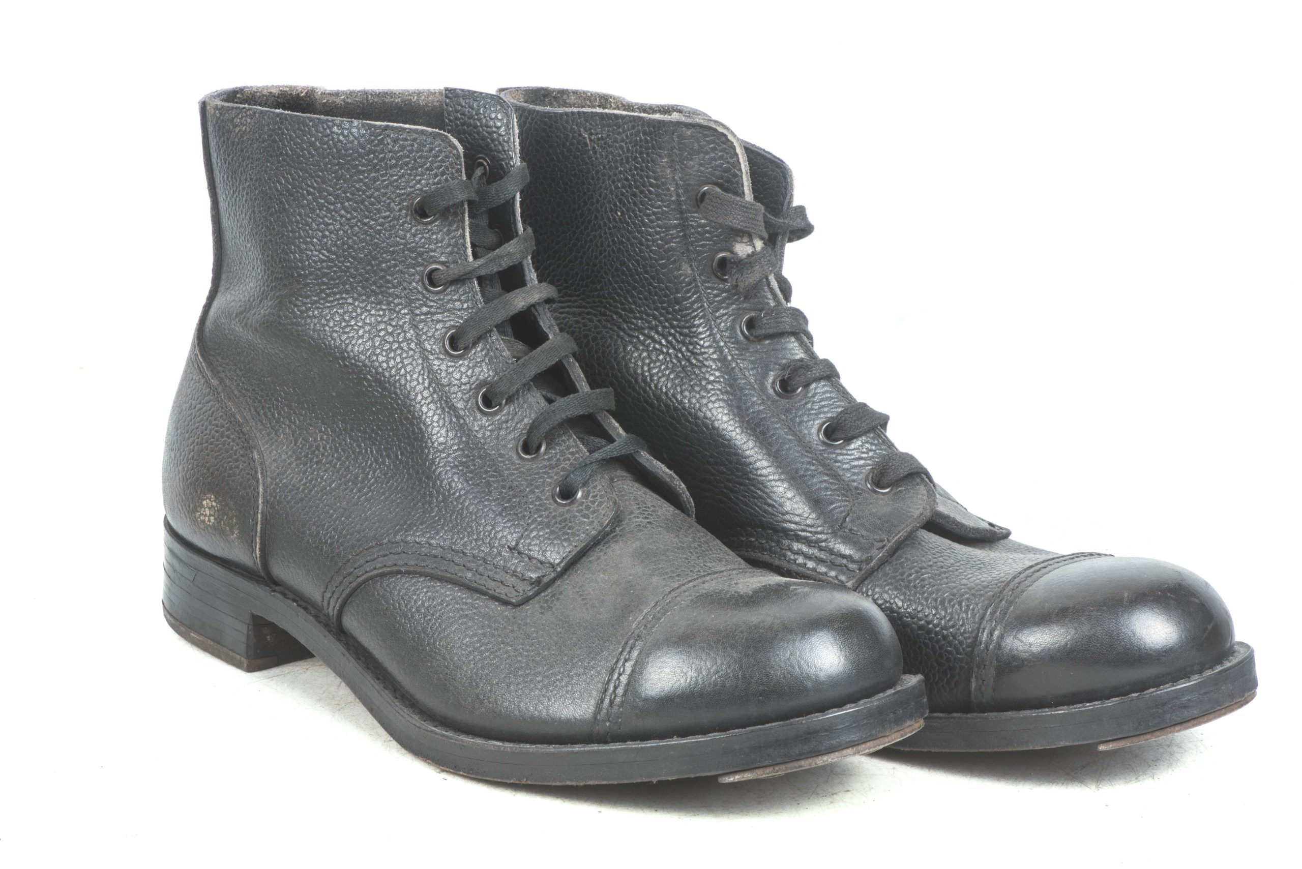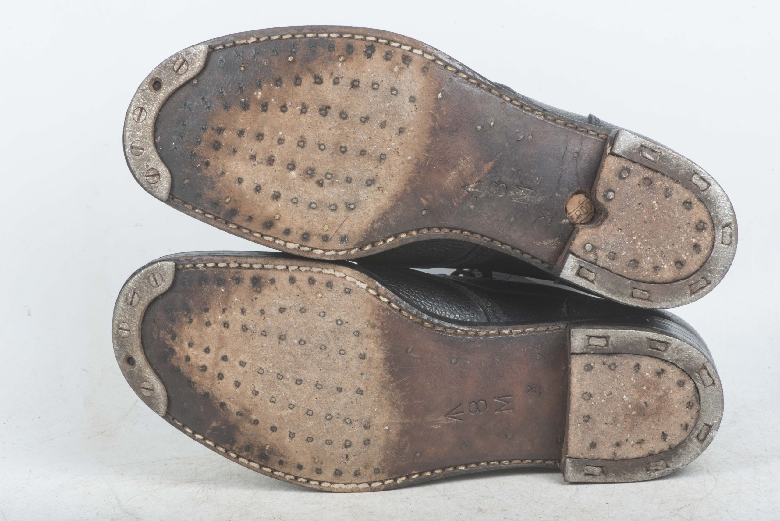 British ammo boots marked W Mason 1945 8M 1945 in good condition. One hole has been drilled in the sole for a mannequin.