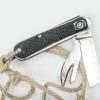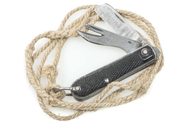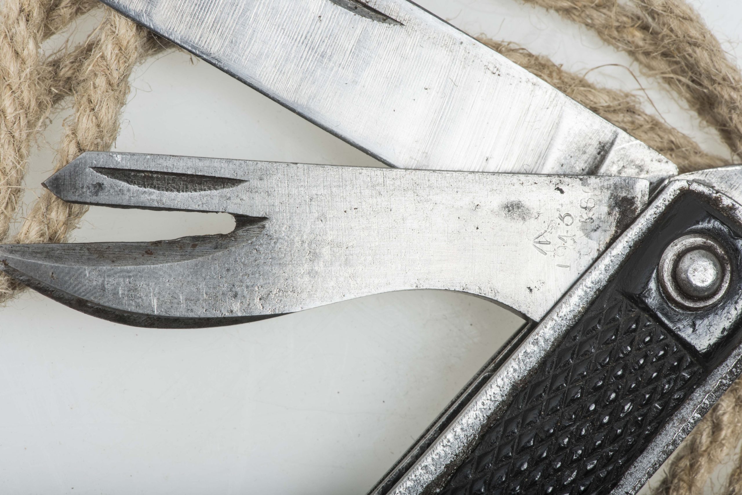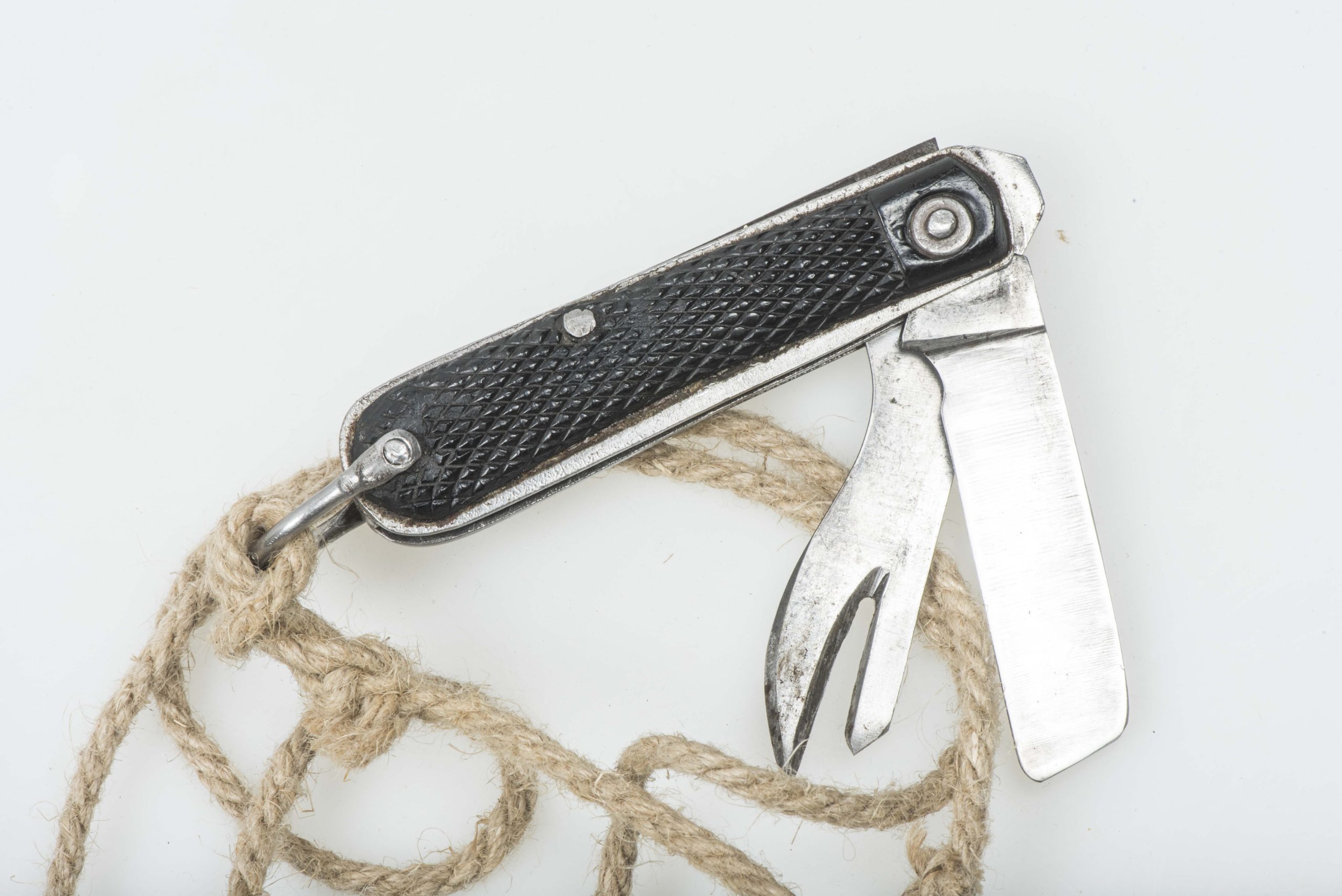 British army jack knife dated 1943 in used condition with its original lanyard. The top rivet is firm but loose allowing some lateral movement of the blade. For a 82 year old collectible this should not be a problem. It works and displays just fine, just some movement on the blade.