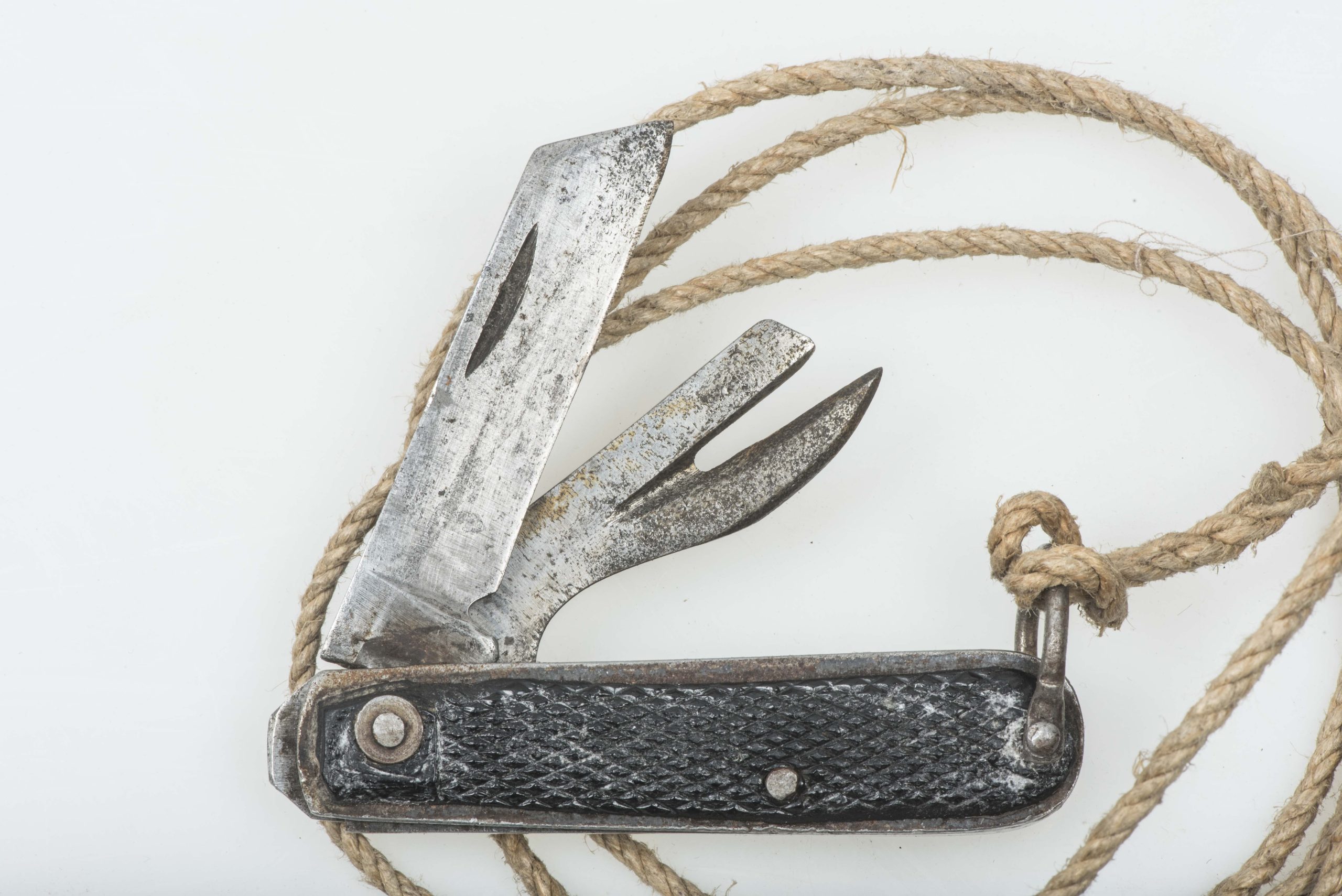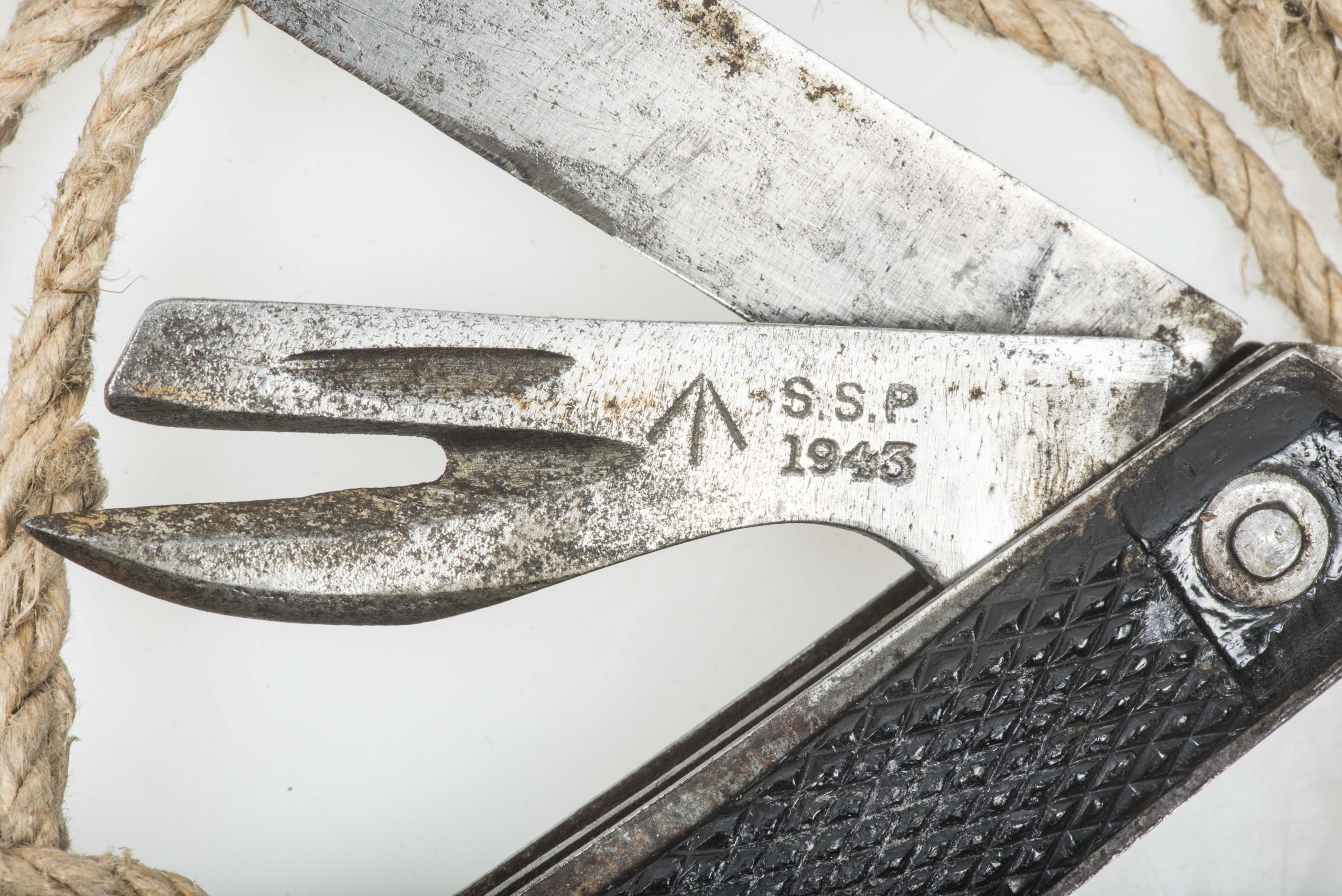 British army jack knife marked SSP 1943 in used condition with original lanyard.