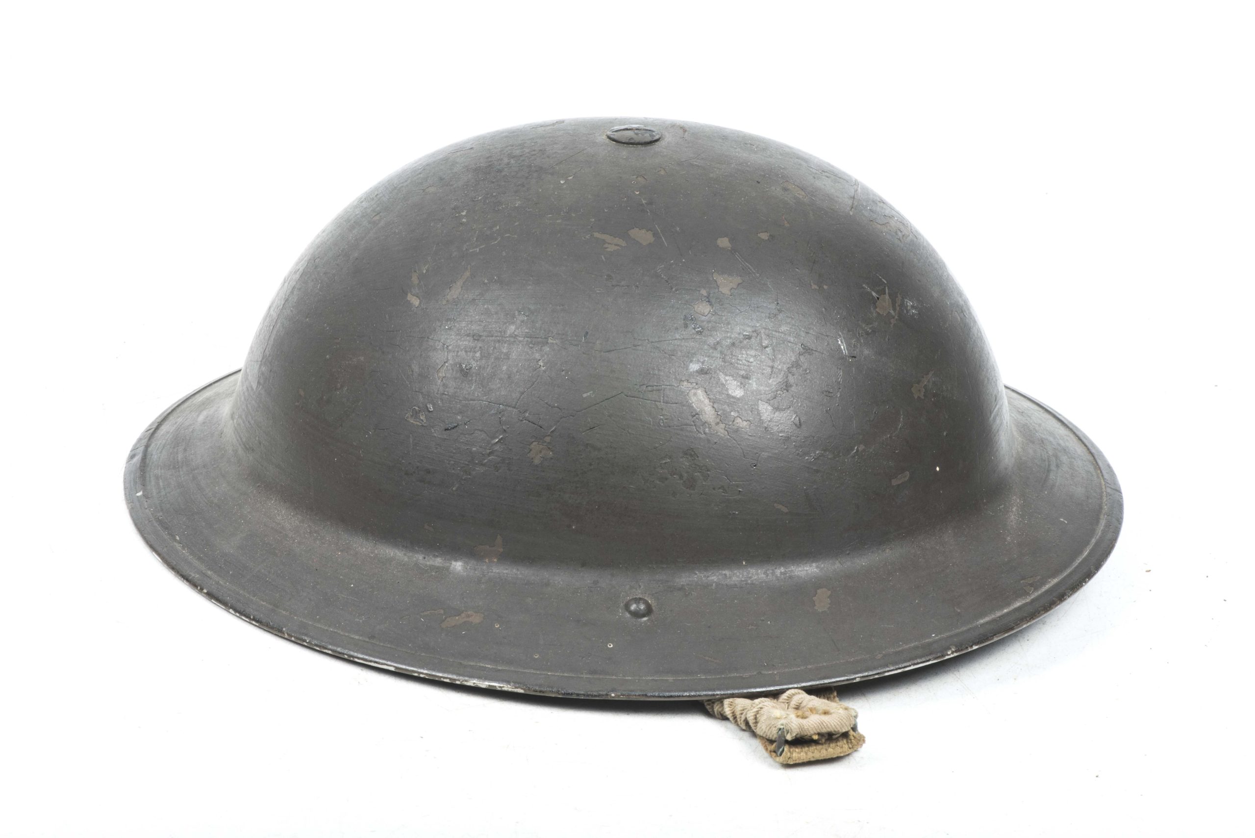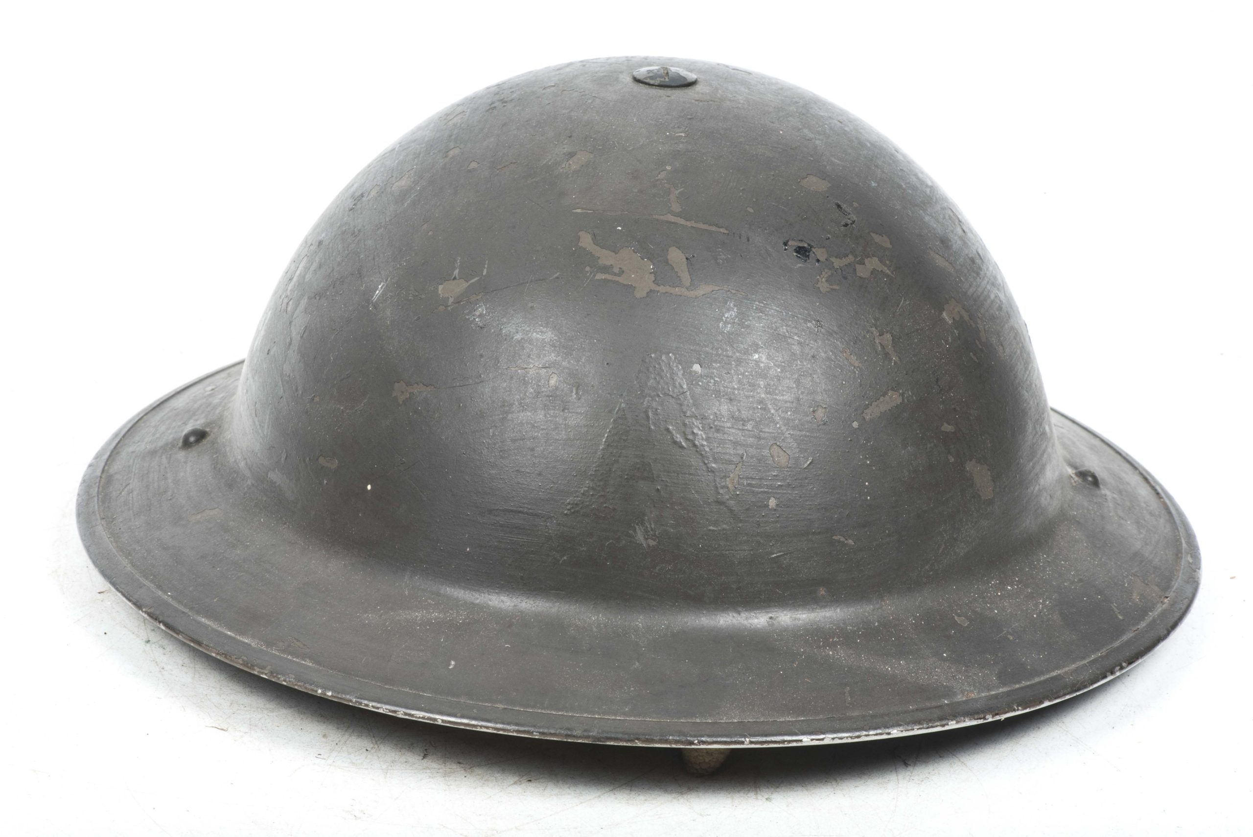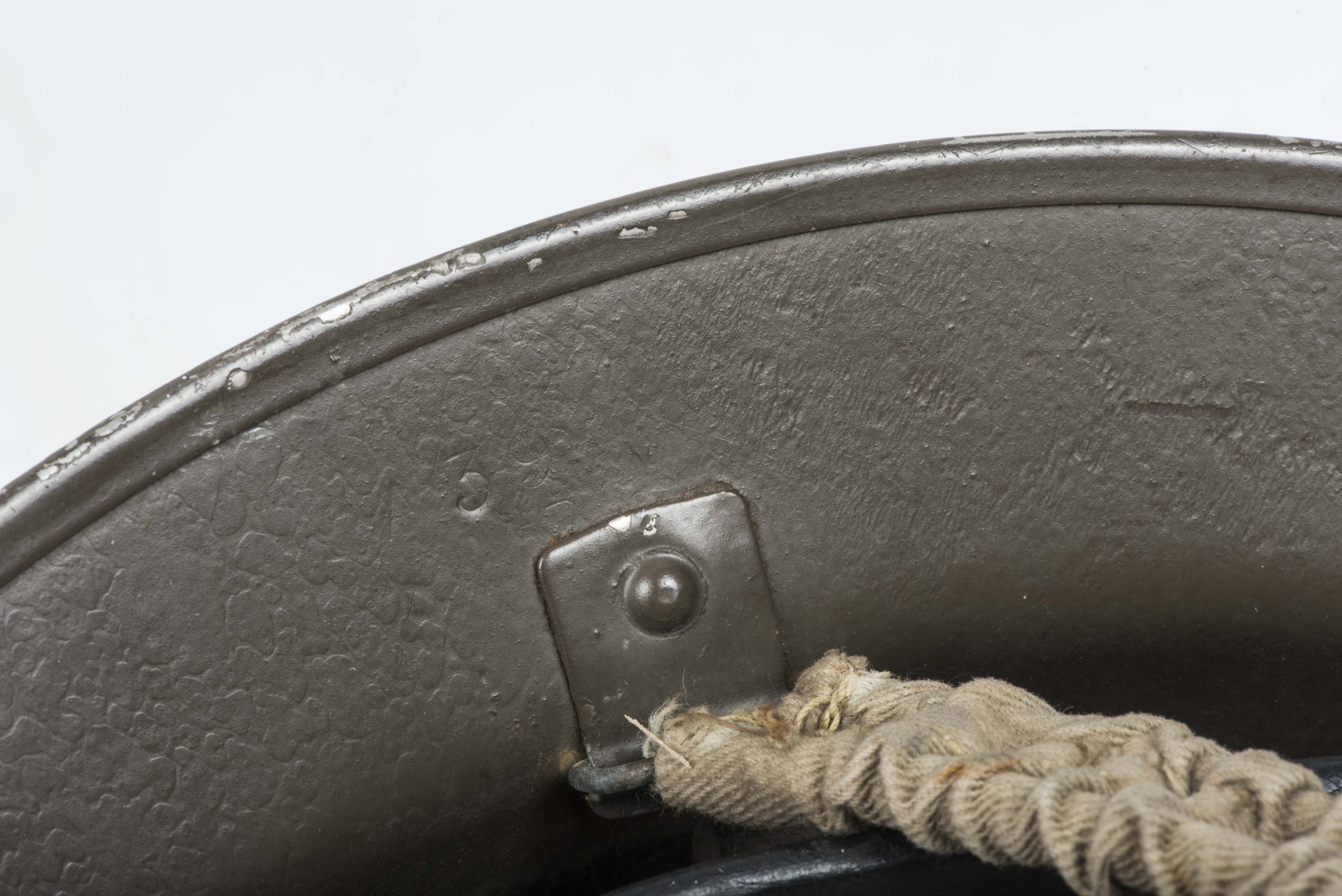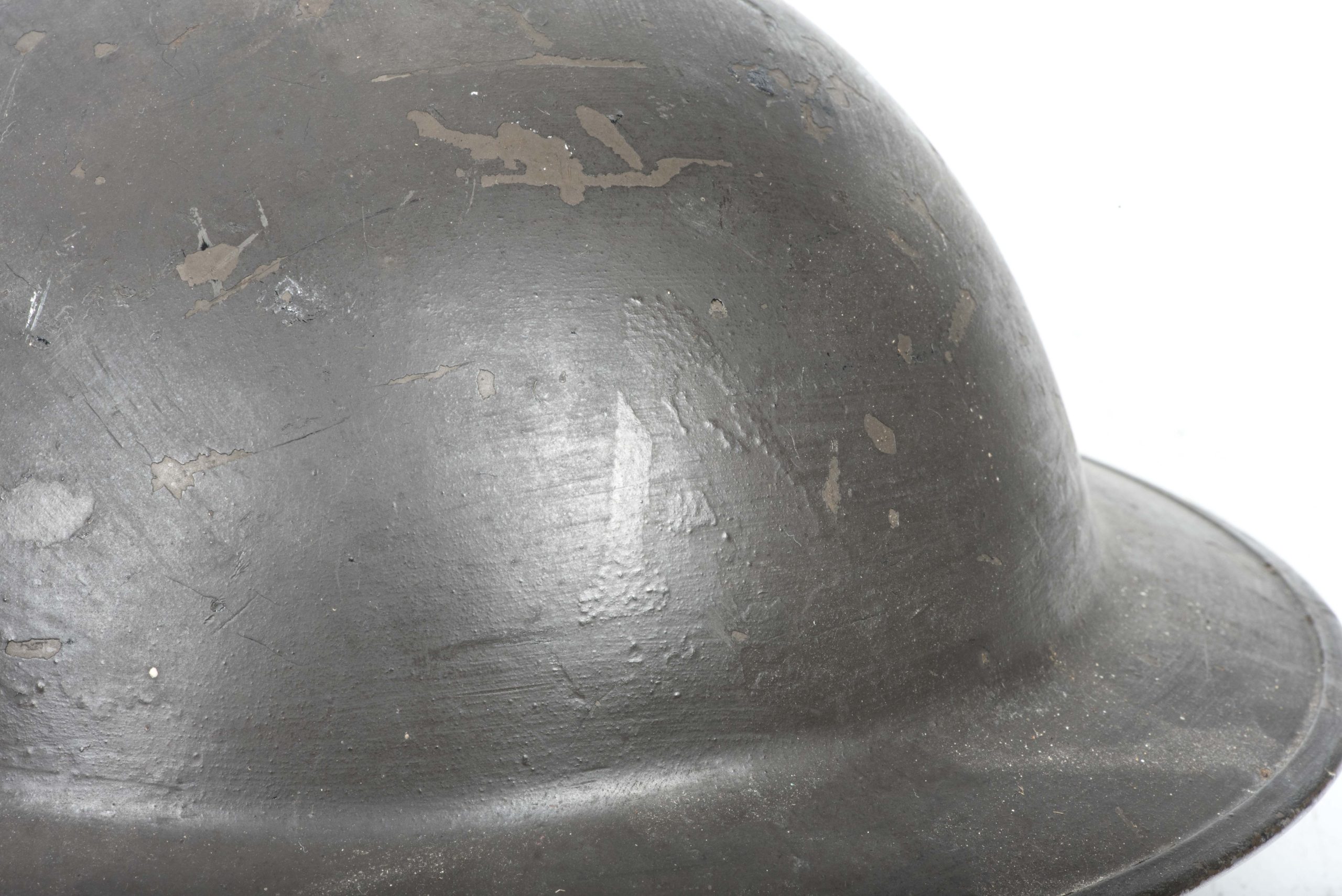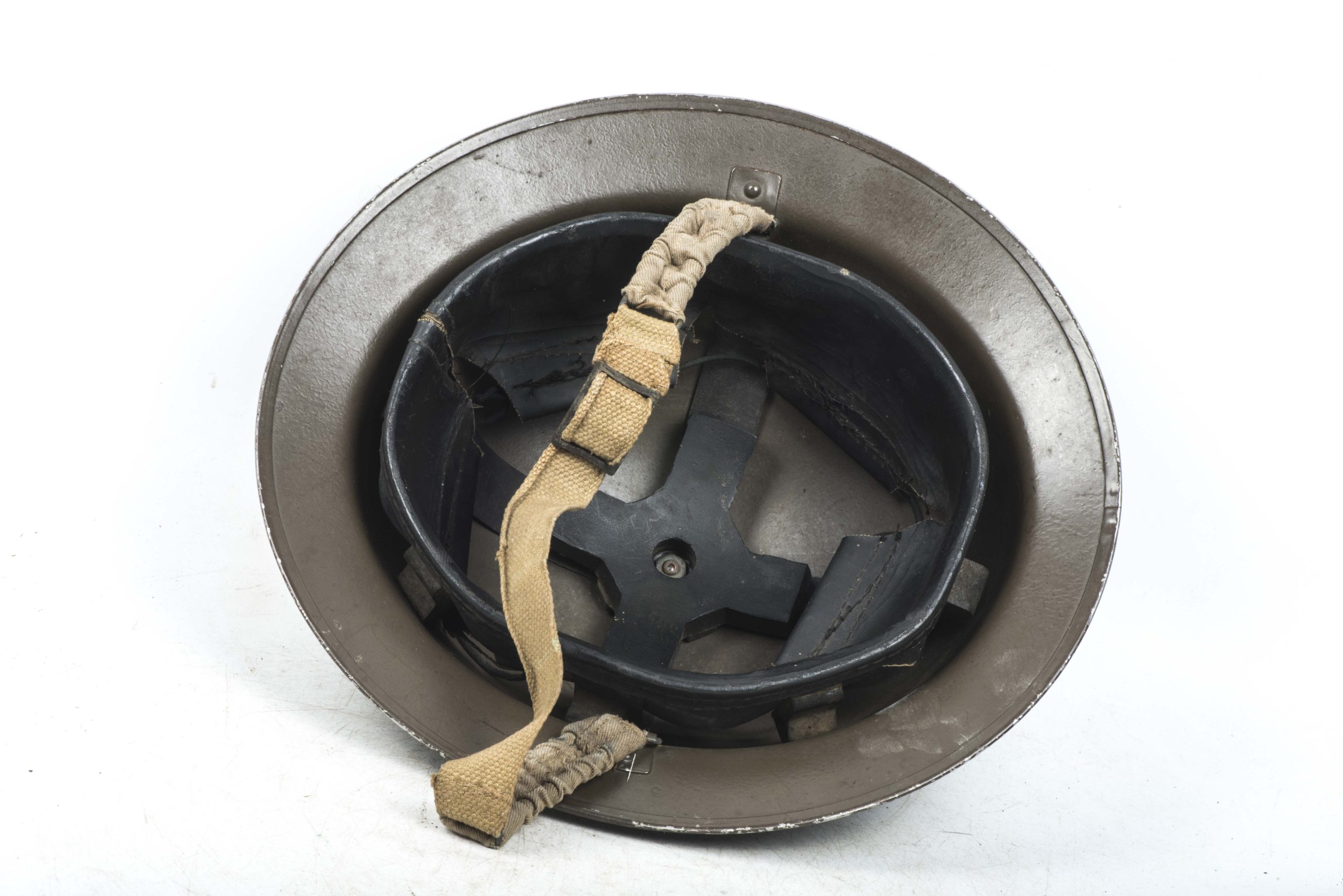 British MKII helmet dated 1939 for a Ambulance driver in good condition. This early helmet is dated 1939 and has several wartime coats of paint. The factory paint had a letter A painted on the front indicating the helmet belonged to a Ambulance. Later in the war it was overpainted in a dark grey green colour covering the insignia but it can be seen right trough the exterior paint. Hard to find early example in good condition!