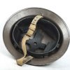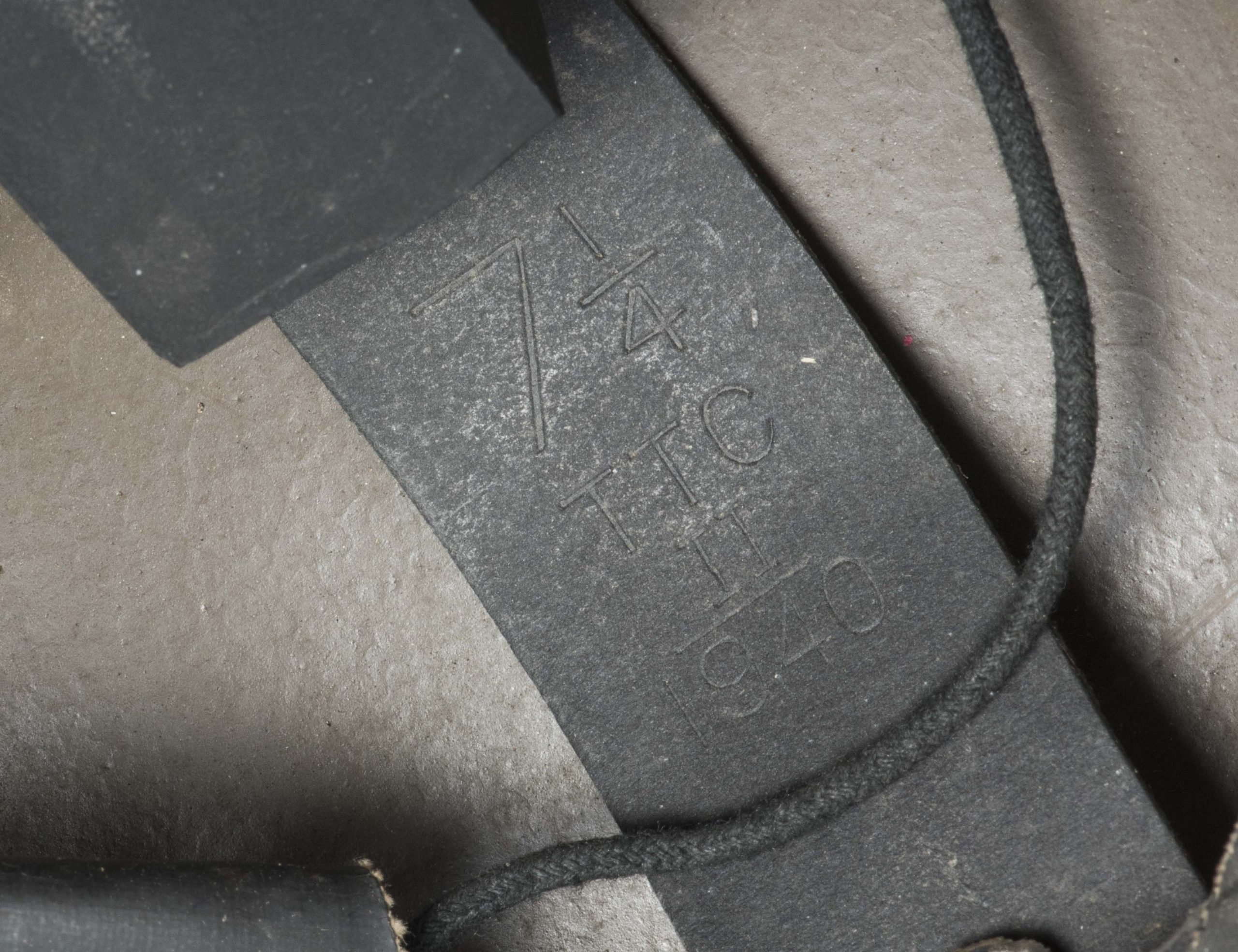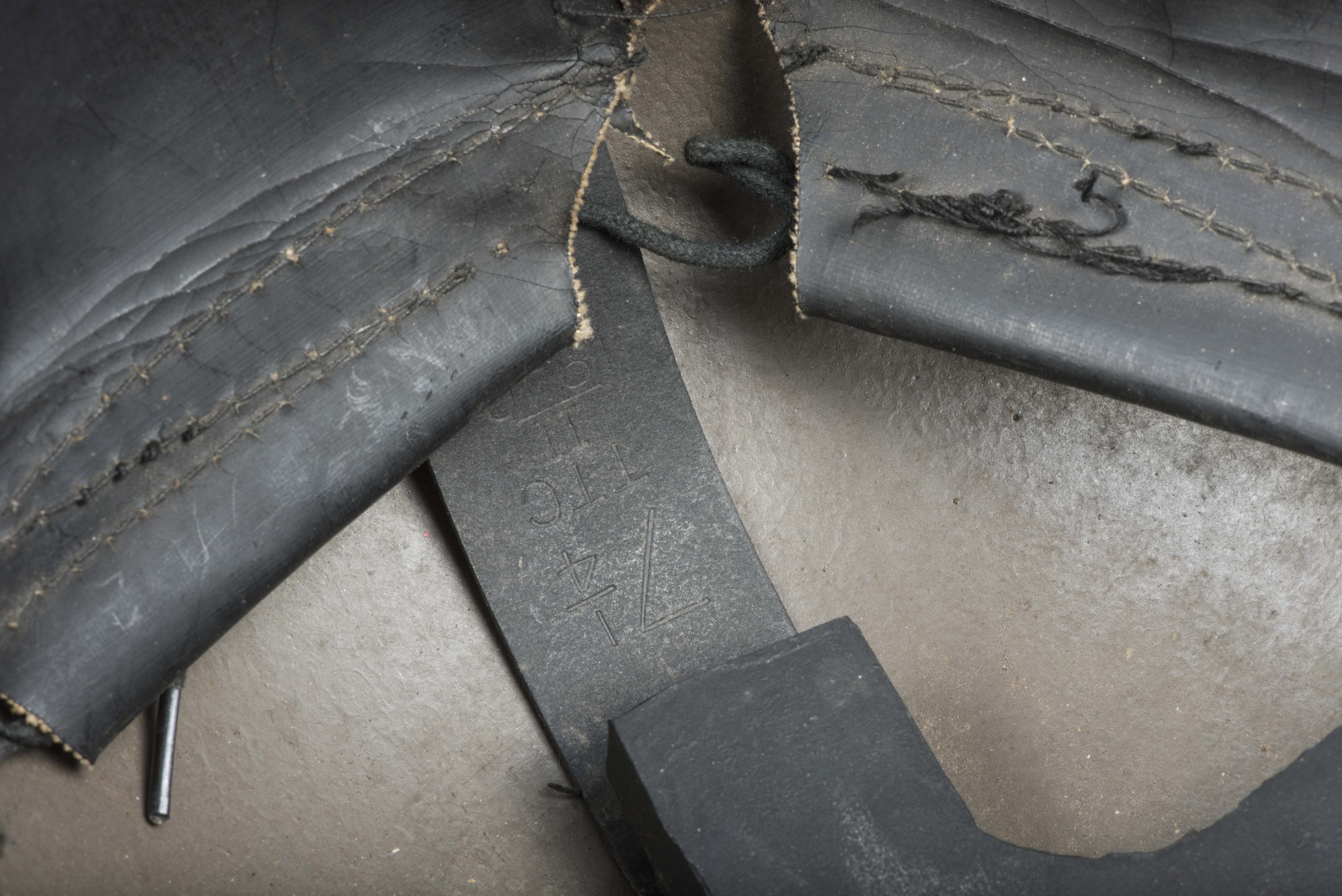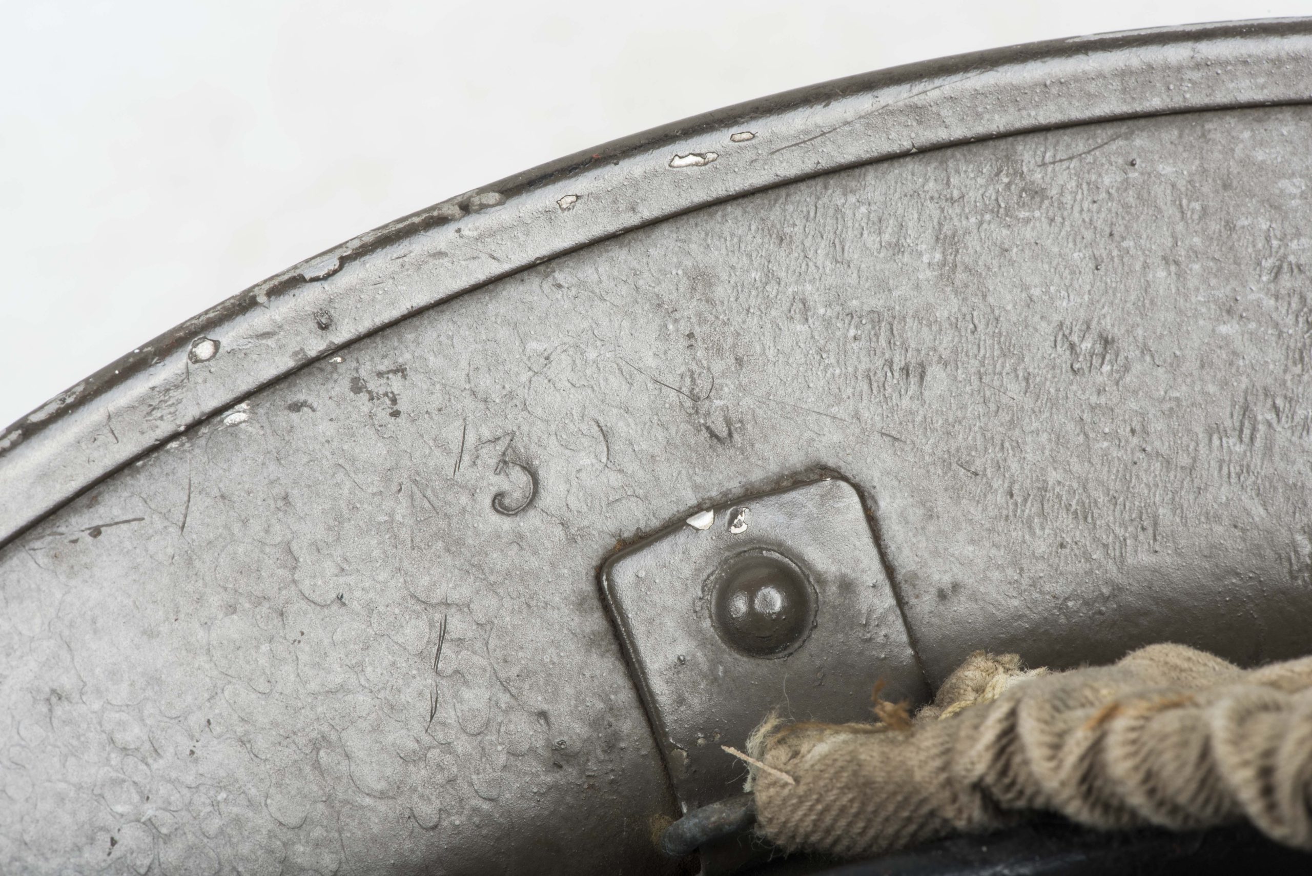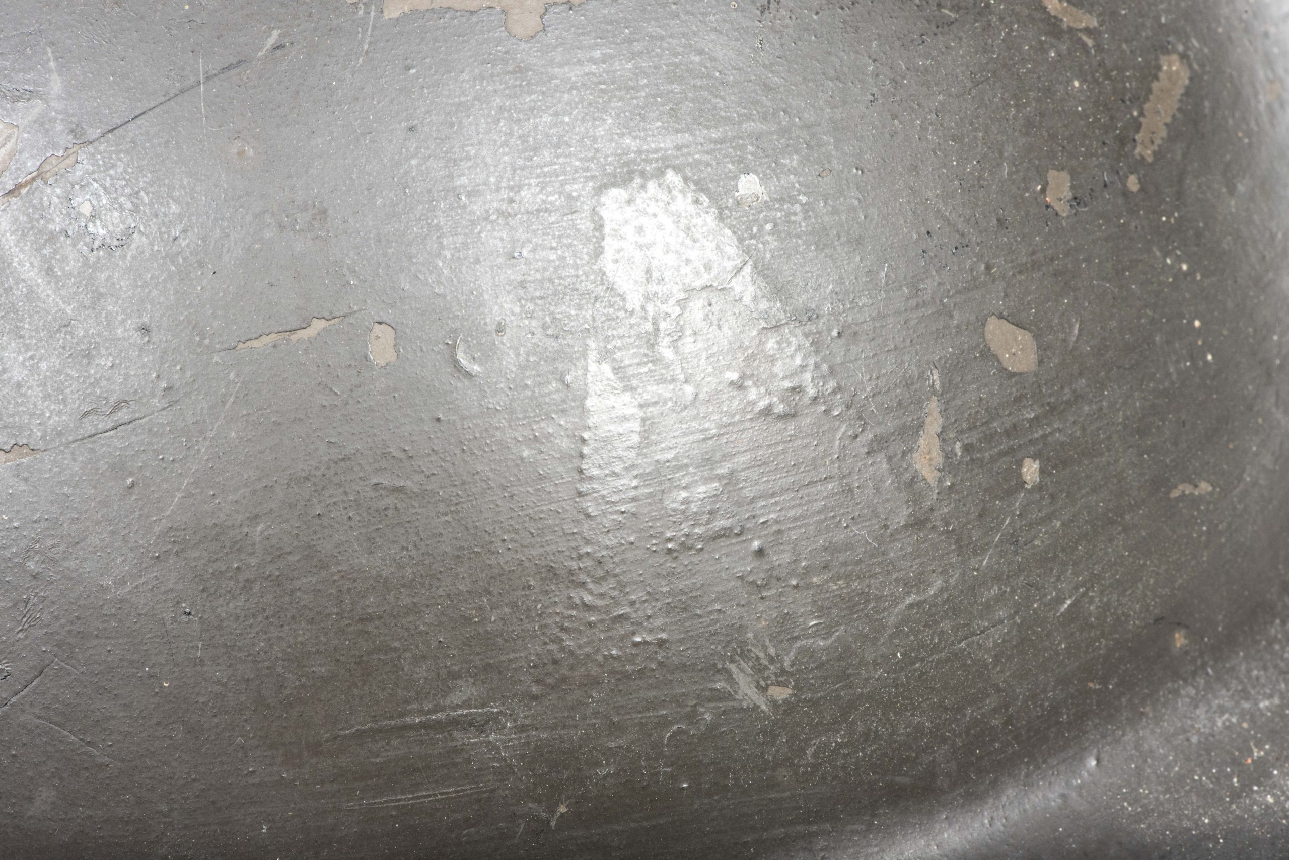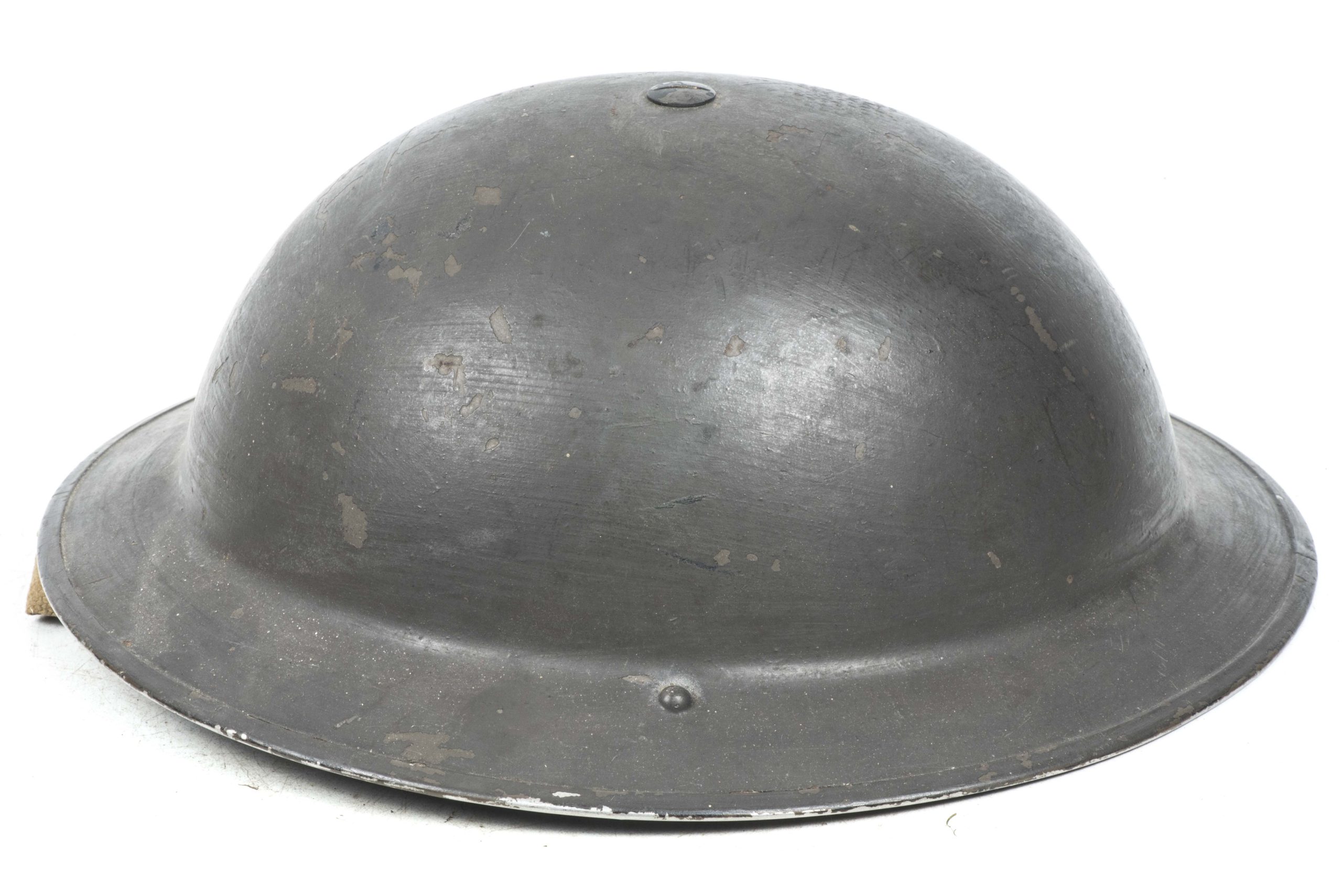 British MKII helmet dated 1939 for a Ambulance driver in good condition. This early helmet is dated 1939 and has several wartime coats of paint. The factory paint had a letter A painted on the front indicating the helmet belonged to a Ambulance. Later in the war it was overpainted in a dark grey green colour covering the insignia but it can be seen right trough the exterior paint. Hard to find early example in good condition!