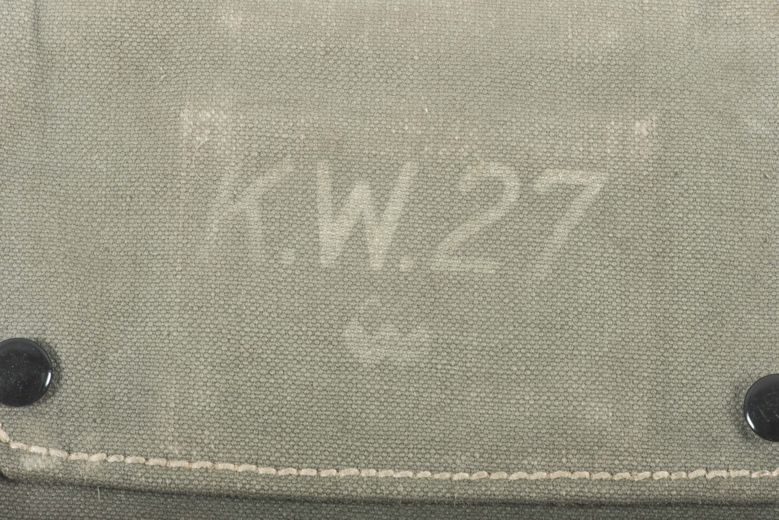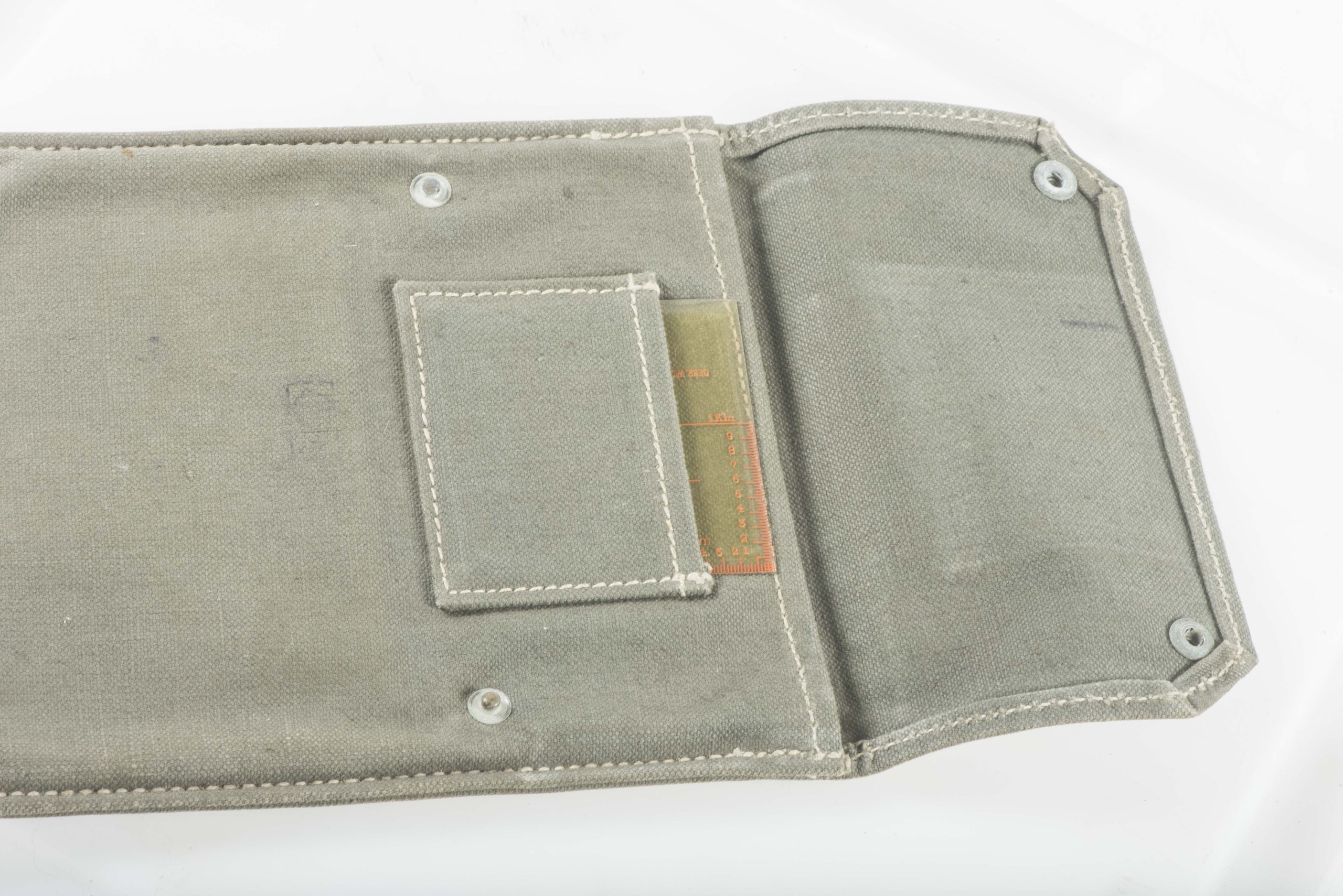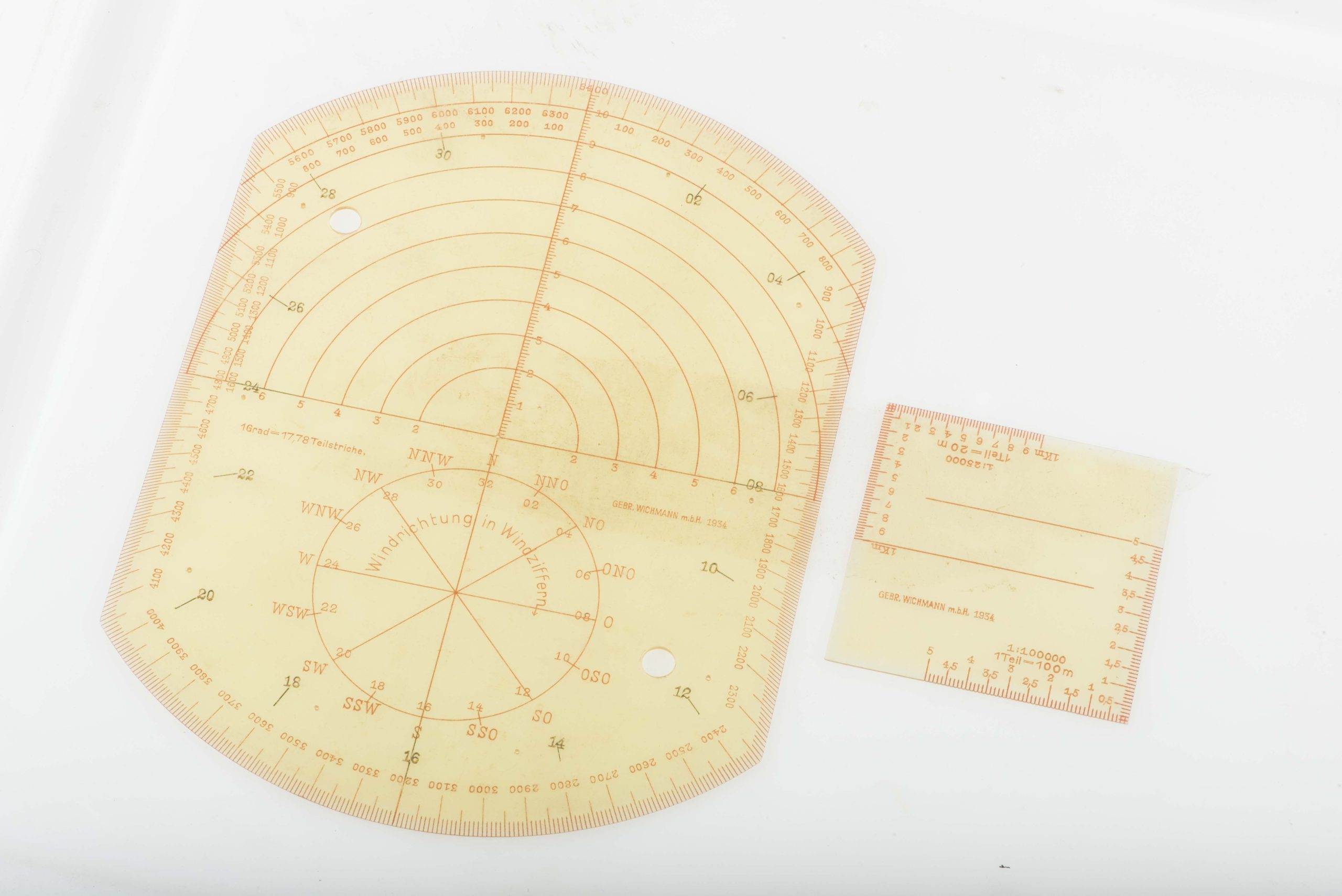 Rare pre war almost complete K.W. 27 (kartenwinkelmesser 27) set in excellent condition. All of the grids are nicely marked Gebr. Wichmann 1934. The set is complete except for the Zielgevierttafel. The set comes with its original pouch which is nicely marked K.W. 27 and features the Wichmann company logo. Rare pre war set which are becoming harder and harder to find!