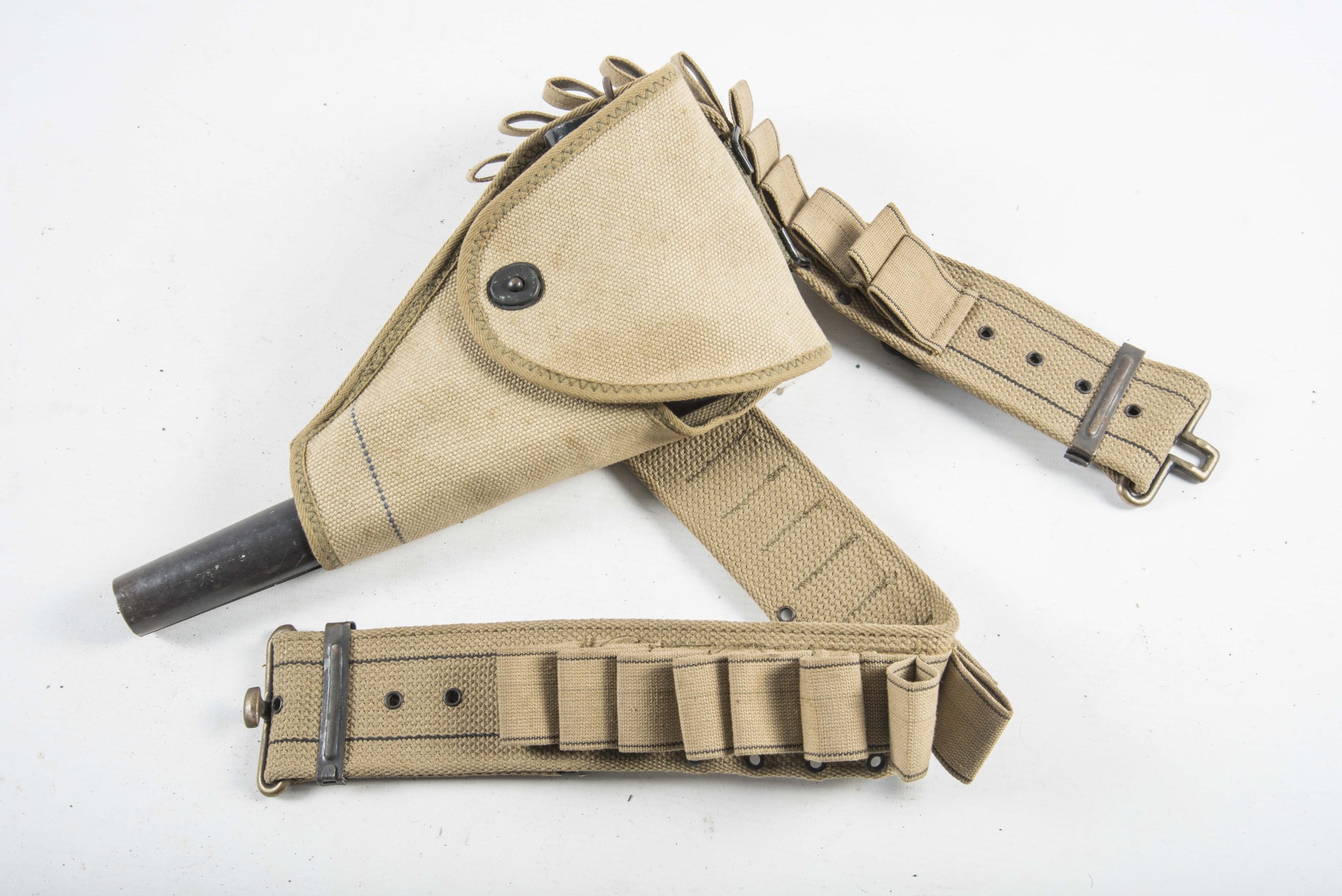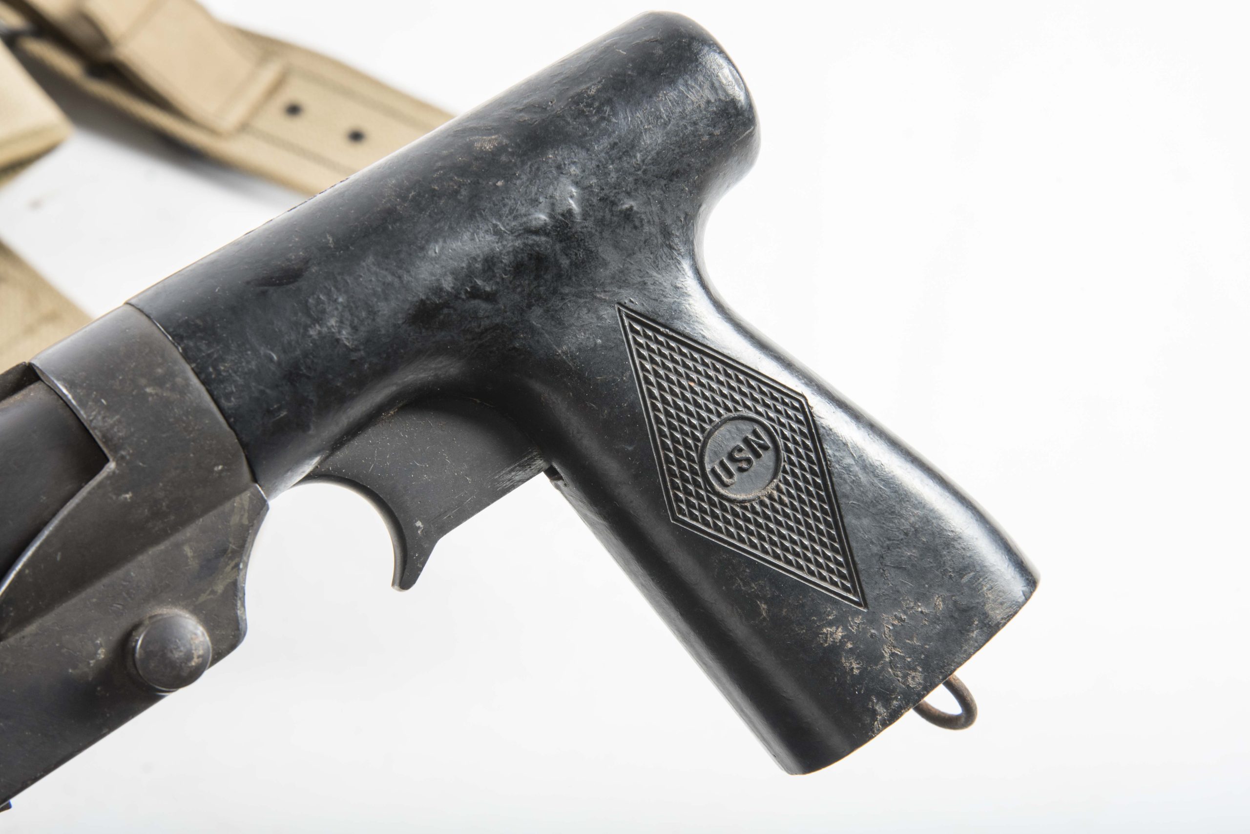Excellent US Navy issue Mark 5 flare gun in very good condition. The flare gun is marked: SIGNAL PISTOL MARK 5 R.F. SEDGLEY, INC. 1942 which indicates production by R.F Sedgley in 1942. The flare gun is complete with its original USN (US Navy) marked early black plastic, most likely bakelite grips. The pistol is complete with its Navy signal cartridge belt and signal pistol holster which are quite hard to find. Nice and hard to find complete set!