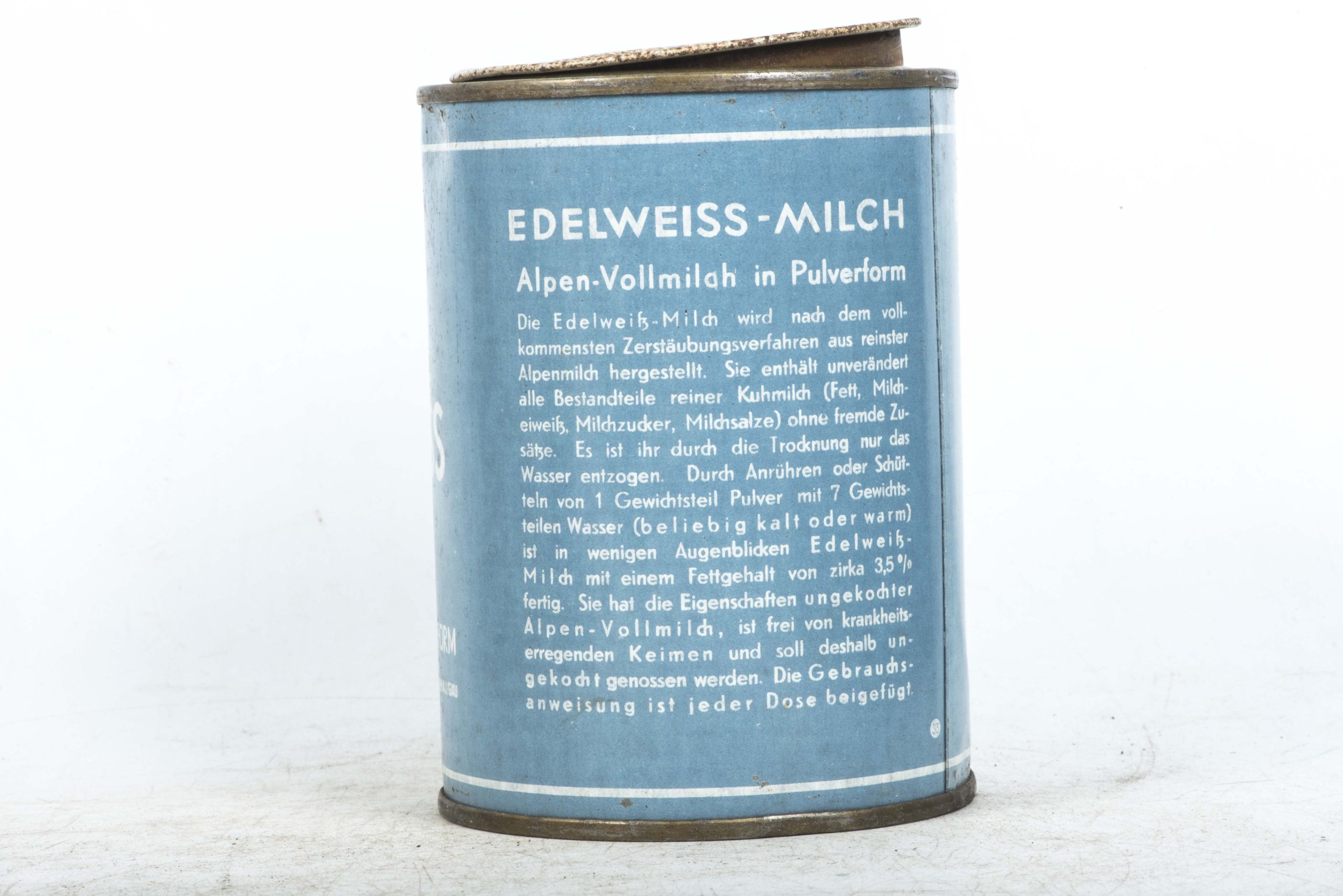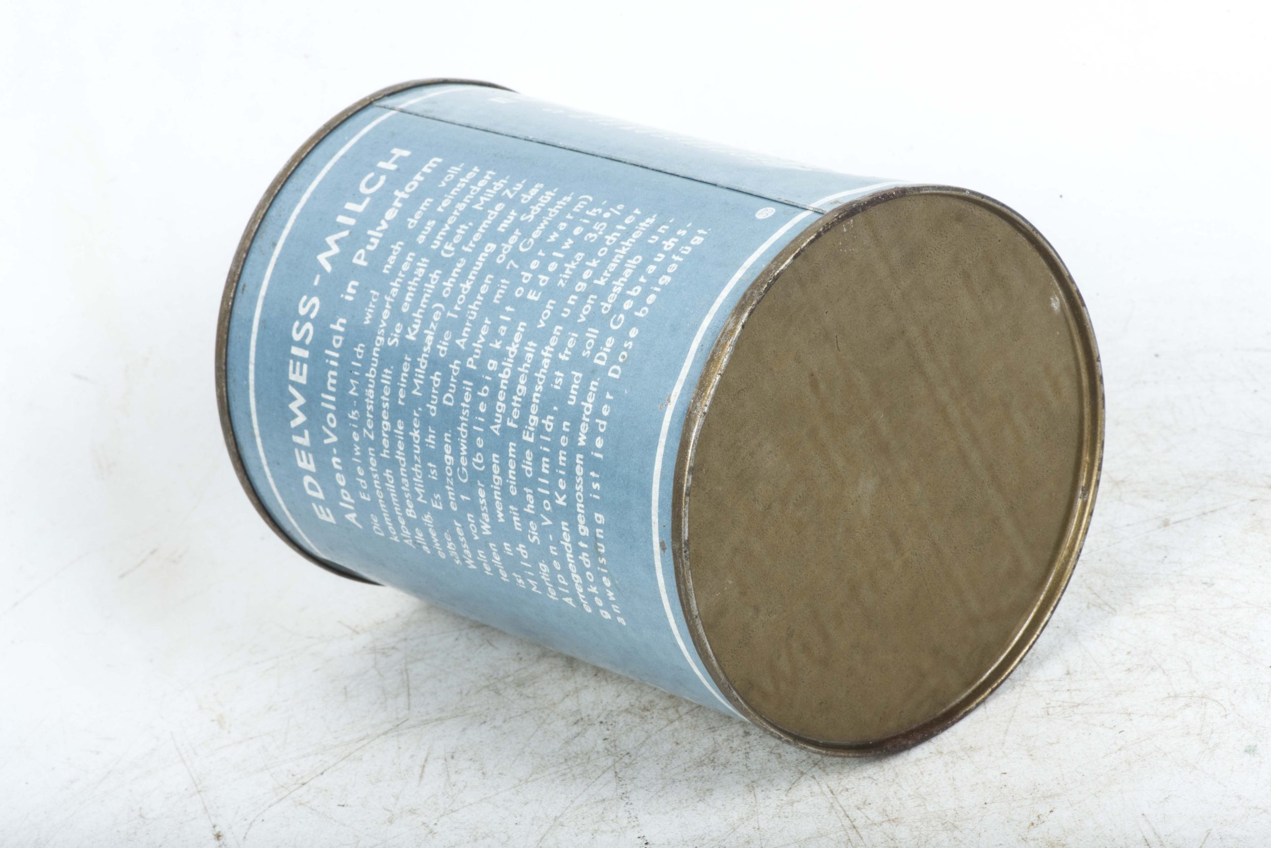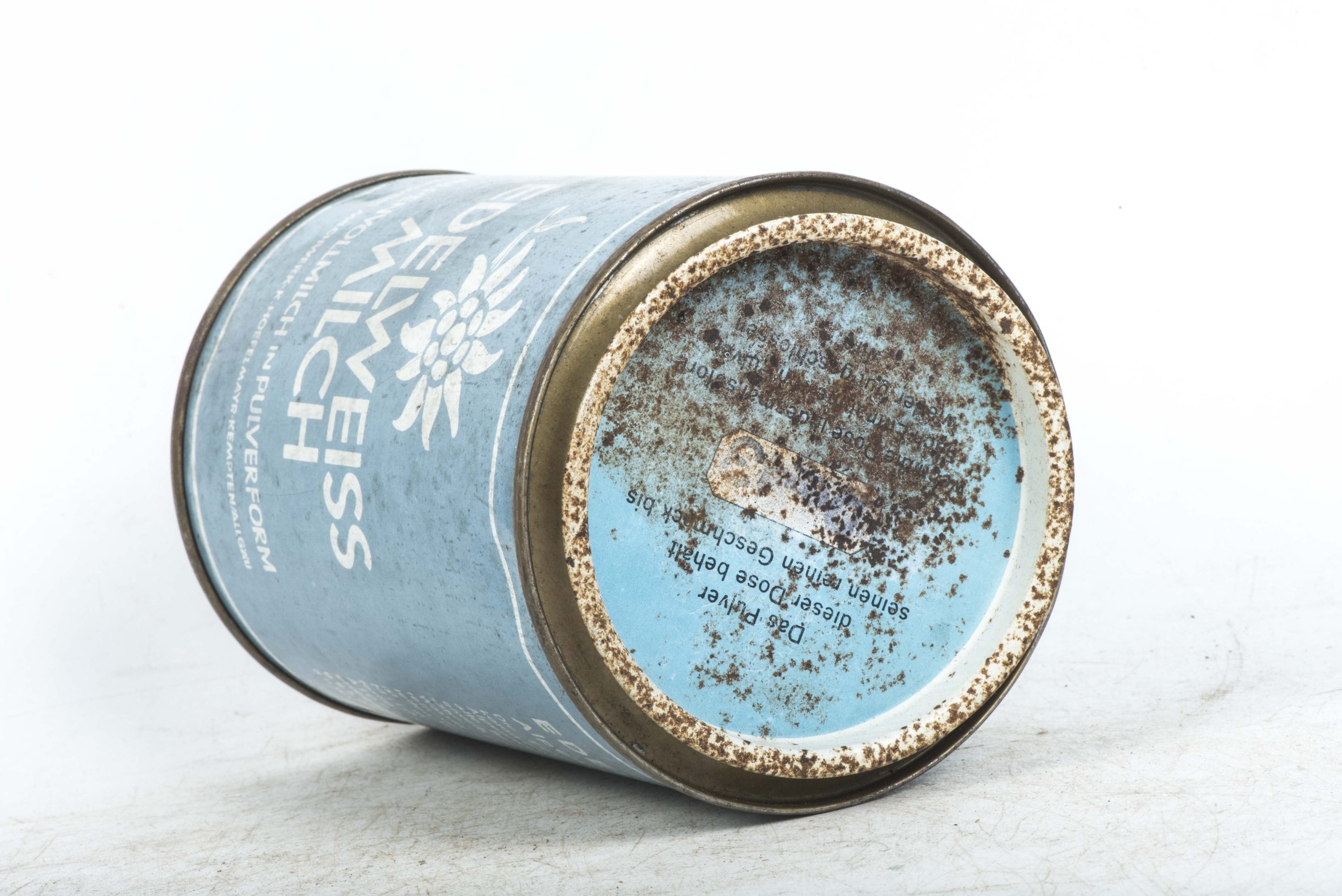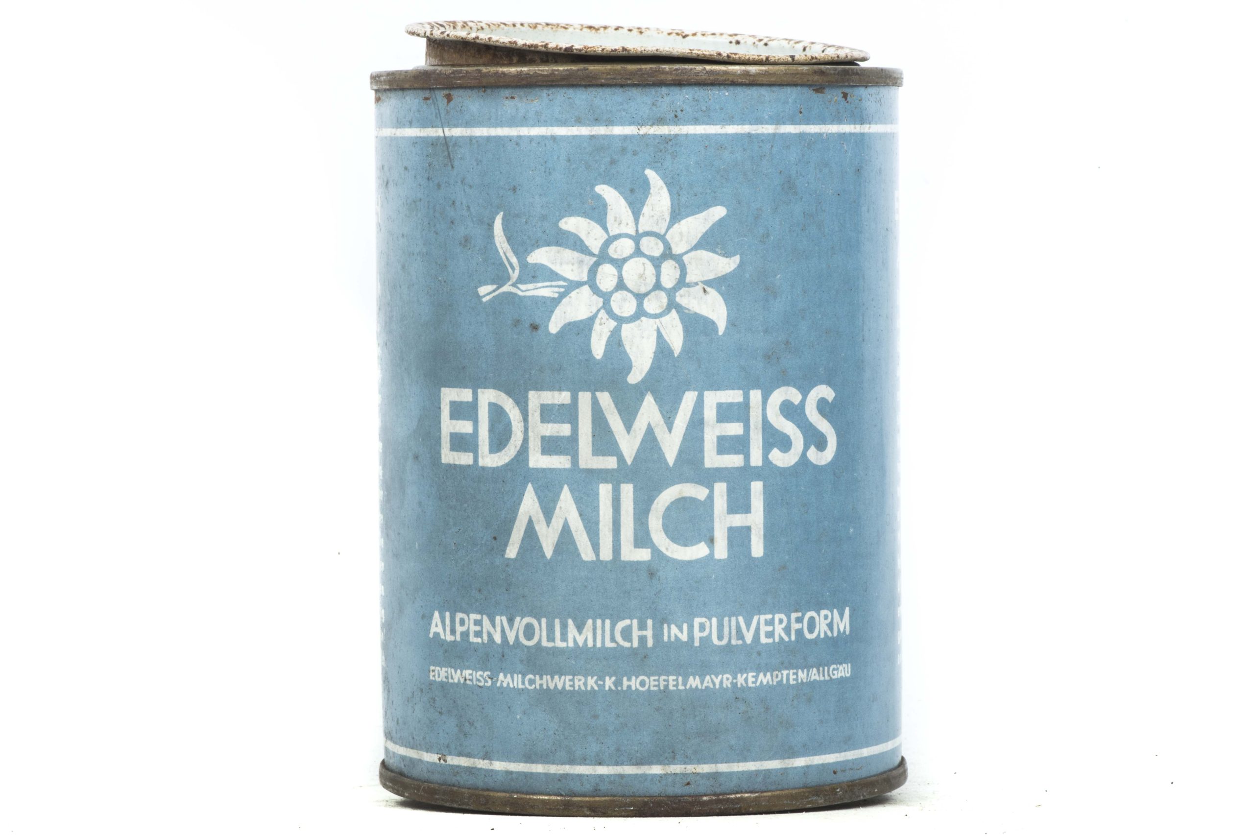 Period powdered milk can by Edelweiss Milchwerk K. Hoefelmayr-Kempten Allgau. This is a pre 1943 produced tin that used to contain powdered milk. These canisters were produced for the civilian market but most probably also found their way into the rucksacks of individual soldiers, bunkers or field kitchens. The can is most probably produced in 1943 or 1944 with its expiry dated reading 1945. These canisters are also shown in the reference book by Jimmy L. Pool, Ruhetag: The Day to Day Life of the German Soldier in WWII, Vol. 1: Health and Hygiene on page 56. Which is a great book for any collector.