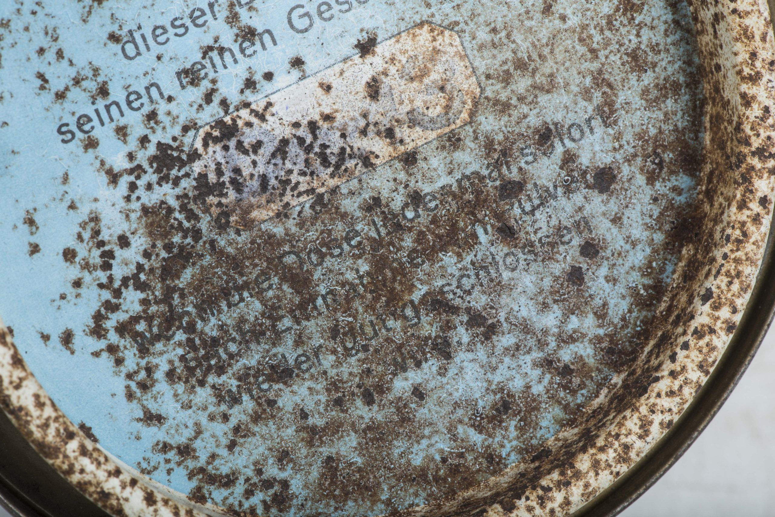 This canister is a period example produced prior to 1943. It is important for me to explain that these in no way have anything to do with the elsewhere offered ‘Edelweiss’ toilet paper rolls which are in fact modern fantasy items. The price on the top reads RM indicating Reichsmarks. Every 6 of these canisters are slightly different in height, colour and print. This is a great indication of the authenticity because a modern copy would be fully identical in all forms. You will get the pictured example which was produced in 1941 or 1942 with the expiry date reading 1943. I have found 6 of these canisters in good condition and I think I will not find more. Hard to find original ration item with a great and iconic image!