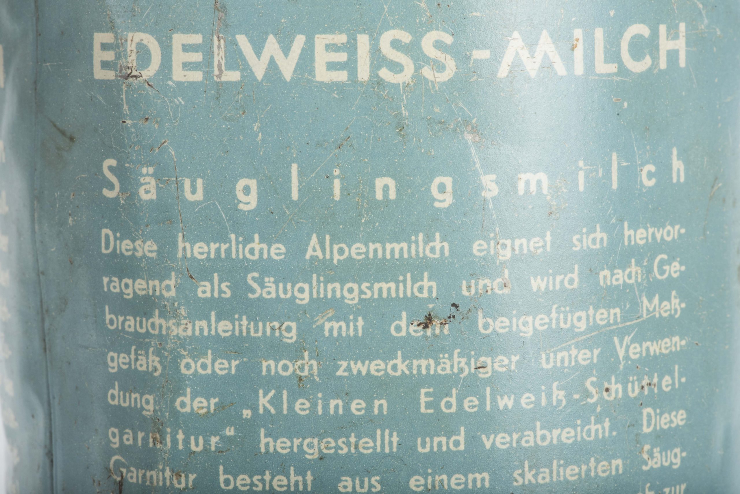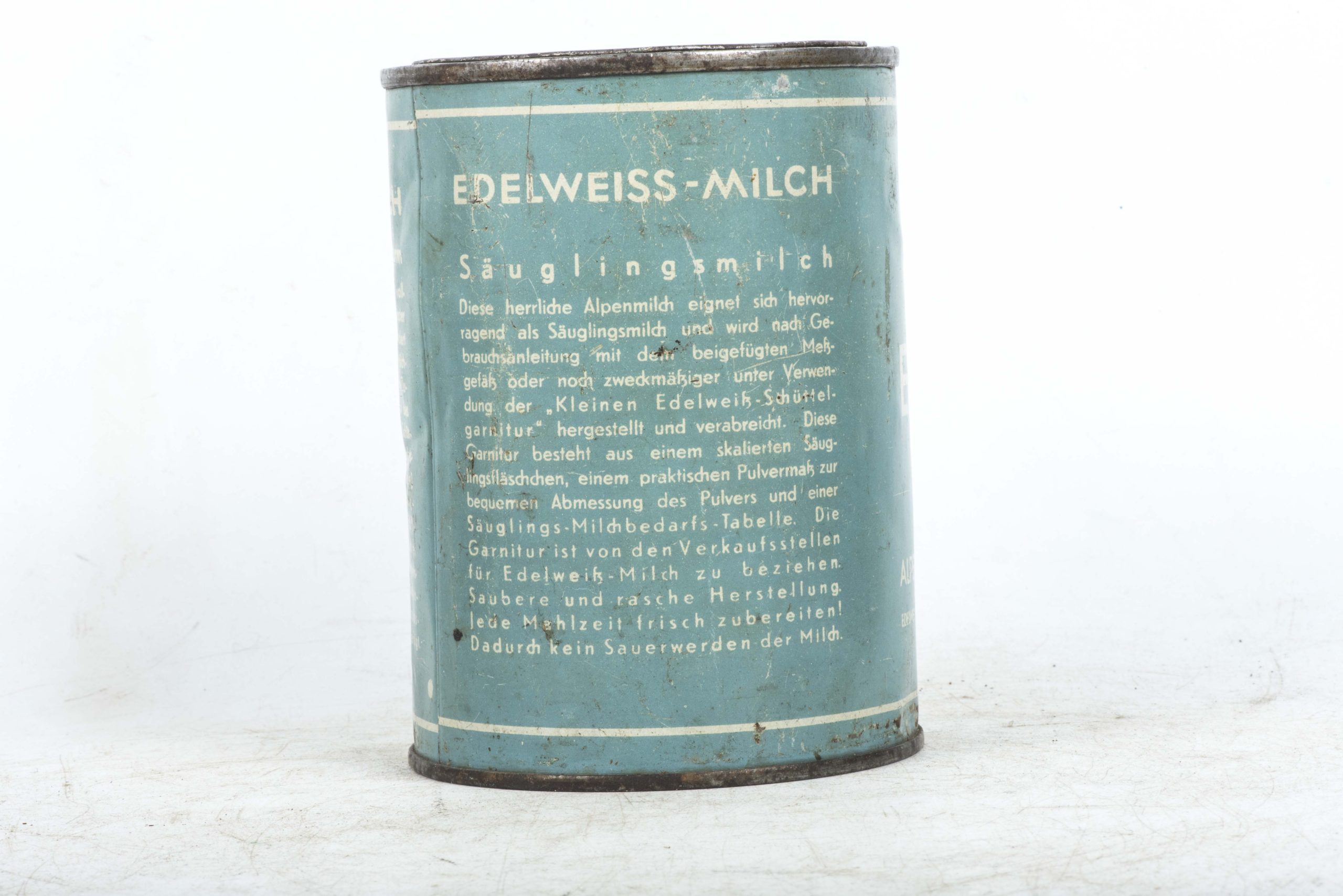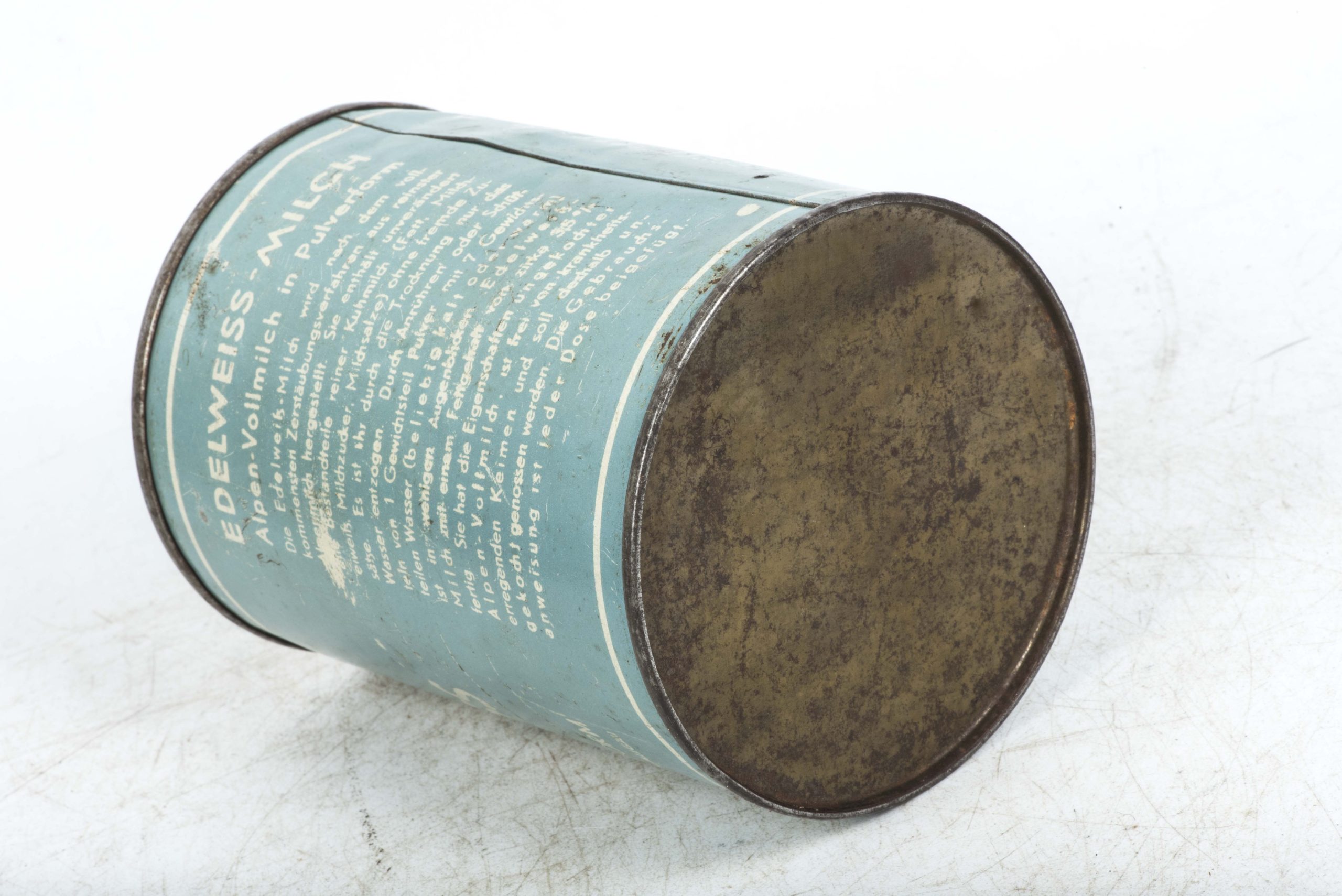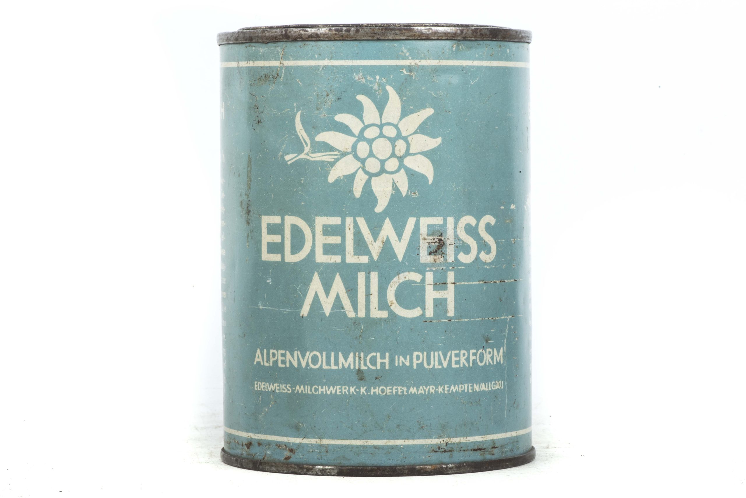 Period powdered milk can by Edelweiss Milchwerk K. Hoefelmayr-Kempten Allgau. This is a pre 1945 produced tin containing powdered milk. These canisters were produced for the civilian market but most probably also found their way into the rucksacks of individual soldiers, bunkers or field kitchens. The can is most probably produced in 1943 or 1944 with its expiry dated reading 1945. These canisters are also shown in the reference book by Jimmy L. Pool, Ruhetag: The Day to Day Life of the German Soldier in WWII, Vol. 1: Health and Hygiene on page 56. Which is a great book for any collector.