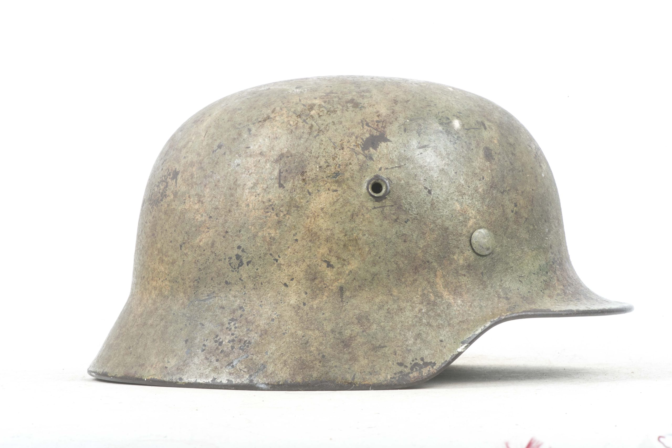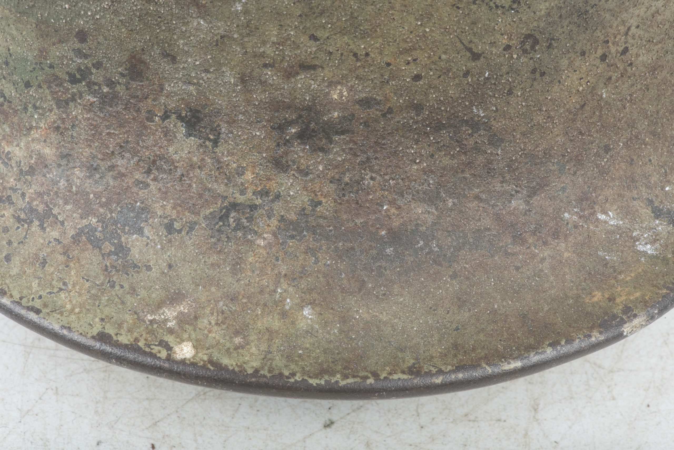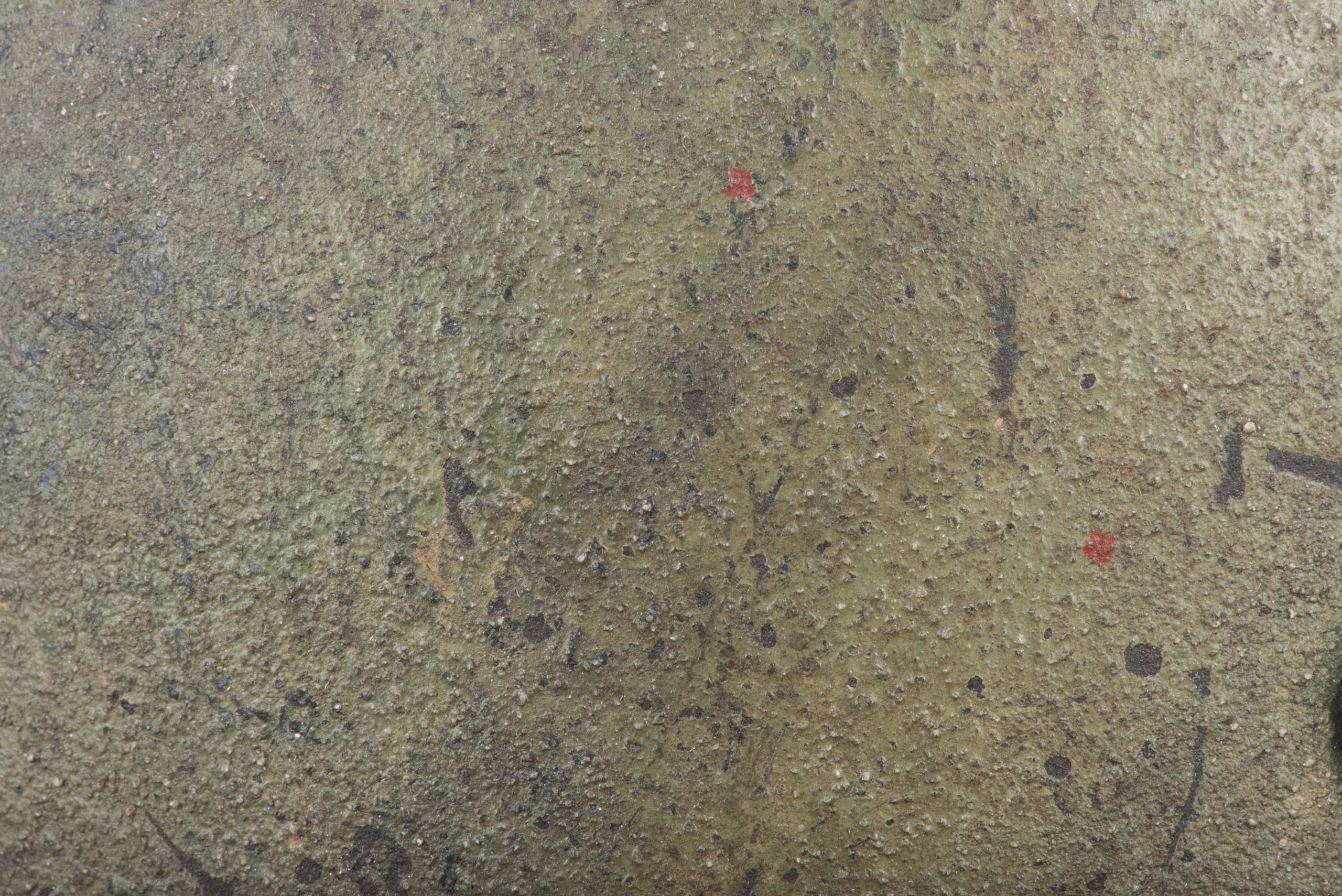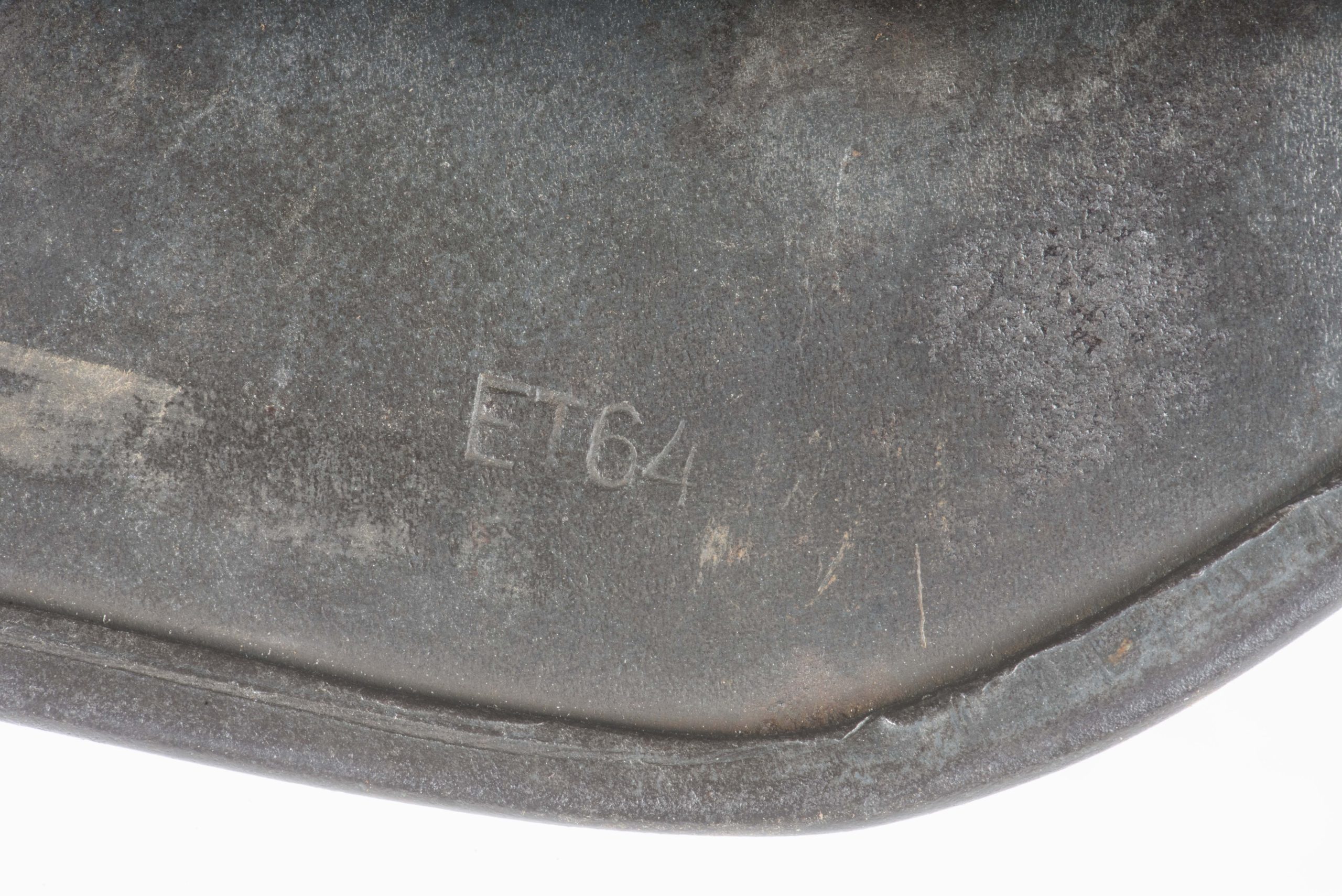 ET64 M40 Luftwaffe helmet in textured and spray painted two tone camouflage. The helmet is marked ET64 indicating production by Eisenhuttenwerke Thale. The helmet is in excellent condition retaining its factory installed liner named Hein. Further there is a painted name inside the dome of the helmet. The helmet retains up to 95% of its period applied camouflage paint finish. The Luftwaffe decal is clearly visible trough the camouflage paint, still in its original position without post war alteration. The helmet is a beautiful and textbook example in a typical camouflage paint pattern that would be very hard to upgrade!