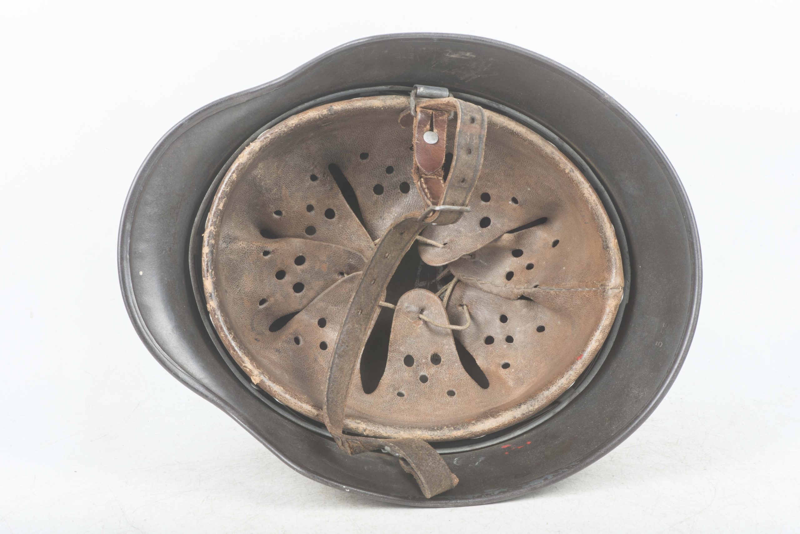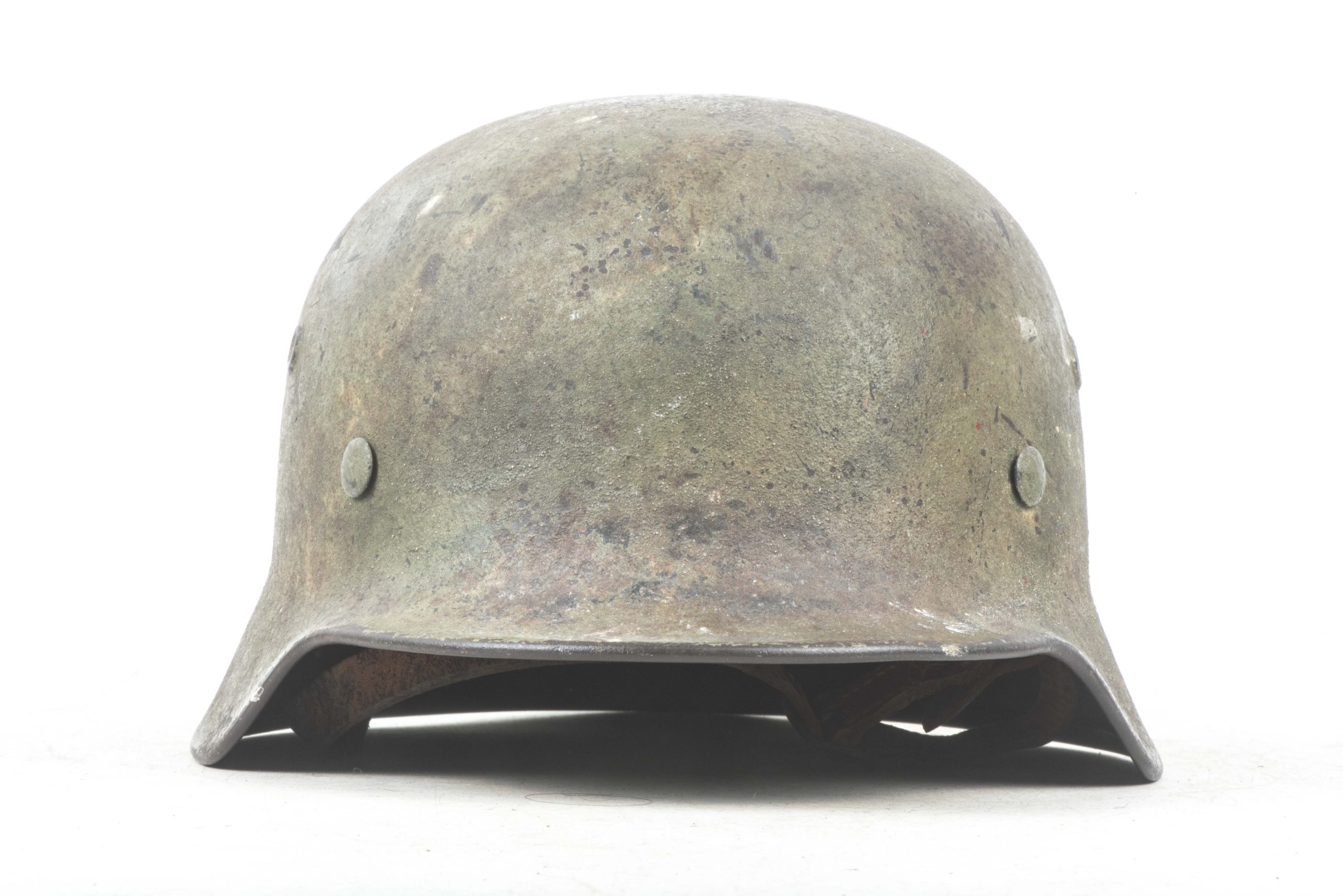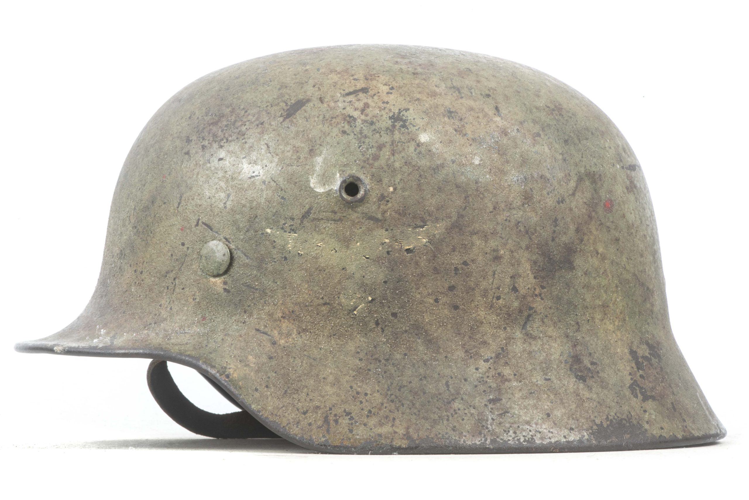 ET64 M40 Luftwaffe helmet in textured and spray painted two tone camouflage. The helmet is marked ET64 indicating production by Eisenhuttenwerke Thale. The helmet is in excellent condition retaining its factory installed liner named Hein. Further there is a painted name inside the dome of the helmet. The helmet retains up to 95% of its period applied camouflage paint finish. The Luftwaffe decal is clearly visible trough the camouflage paint, still in its original position without post war alteration. The helmet is a beautiful and textbook example in a typical camouflage paint pattern that would be very hard to upgrade!