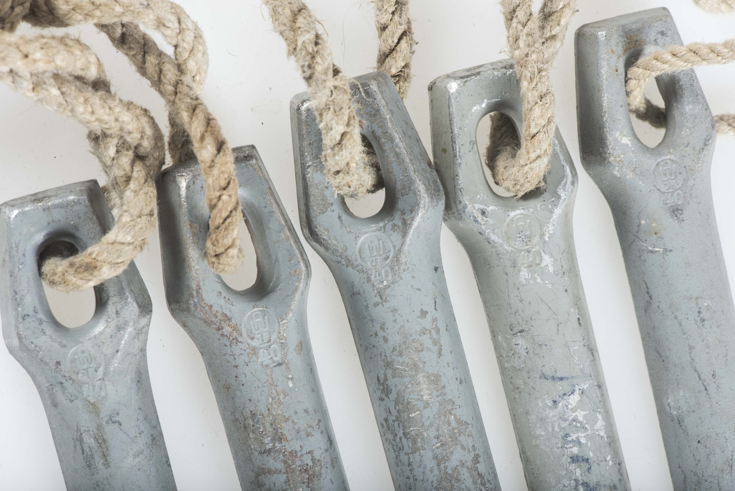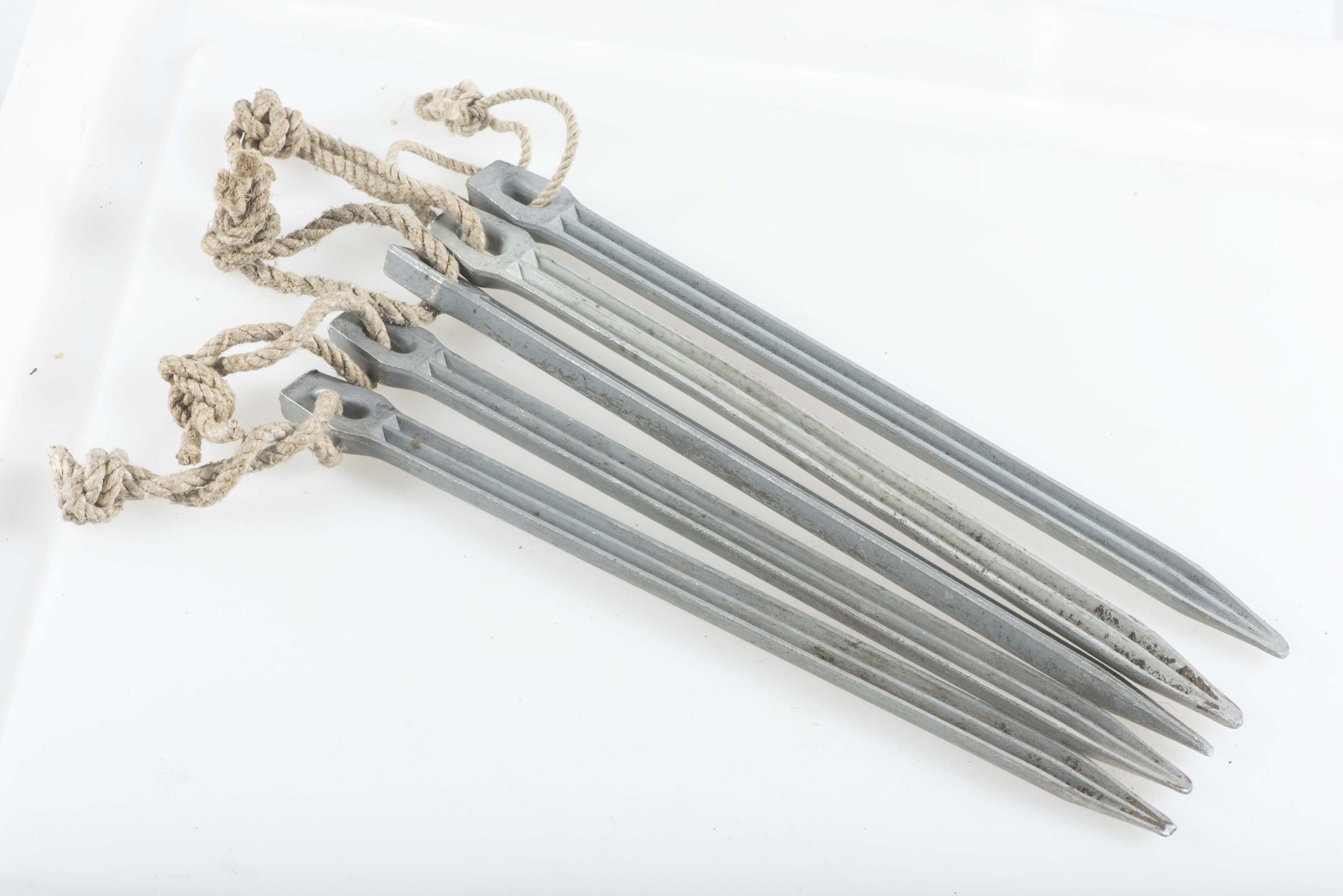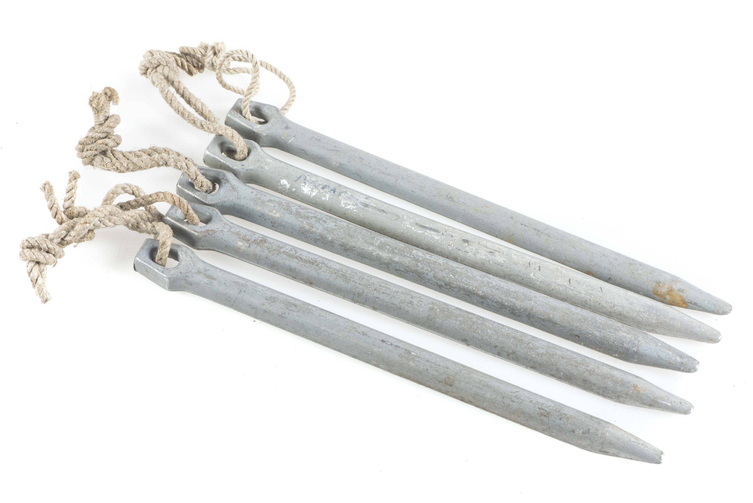 Excellent set of four matching grey painted steel tent pegs in very good condition. The tent pegs are all nicely marked with a manufacturers logo/mark; AW JE 40, which indicates a still unknown manufacturer. Virtually seen these steel tent pegs are way harder to find than the aluminium examples, especially painted grey in this condition. The pegs are original with over 95% of the grey factory finish and complete with its factory attached cord! Impossible to upgrade set to complete a Zeltbahn.