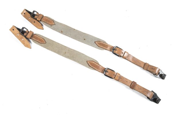 Scarce mint webbing with leather straps for the large Wehrmacht issue food container. Both straps are matching and thereby both nicely marked ftq 1943. These webbing carrying straps are virtually always missing from the food containers and are very hard to find as a spare, surely in this condition! Excellent spare set to complete a food container!