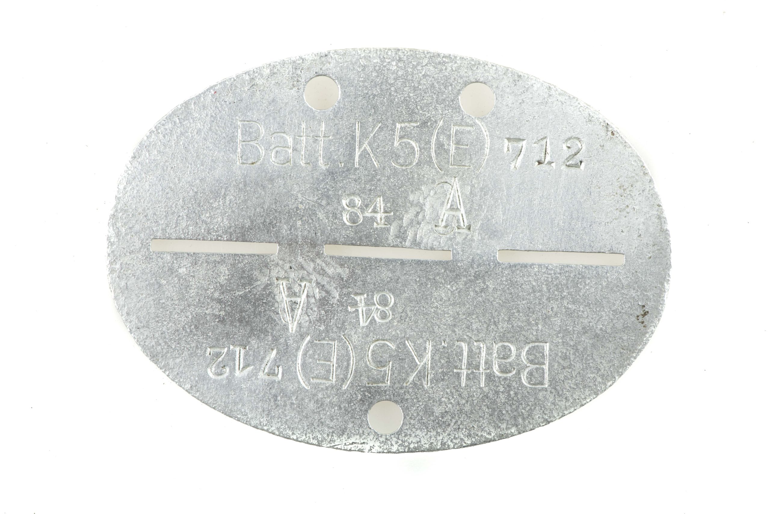 Rare German ID disc or Erkennungsmarke marked Batt. K5 (E) 712 indicating Eisenbahn-Batterie 712 which was equipped with two 28 cm (E) 5 guns. This battery was part of the 16. Armee during the Westfeldzug. After that it was stationed as a coastal defence unit near the English channel. In february 1944 it was moved to Italy with Heeresgruppe C. There it saw action positioned at Ciampino south of Rome. It delivered 278 shots aimed at Anzio and Nettuno. After the Allies marched on Rome both guns retreated on june 6 1944 and where subsequently destroyed at Civititaveccia due to destroyed railroads. They were captured by the Americans and sent to the USA for research. They used the two destroyed wrecks to build one functioning example. The Eisenbahn batterie 712 was then outfitted with two captured French 24 CM (E) 557(f) guns. September 1944 it was refitted with two 28 cm guns and would see action in Italy again. This is a rare to find Erkennungsmarke!