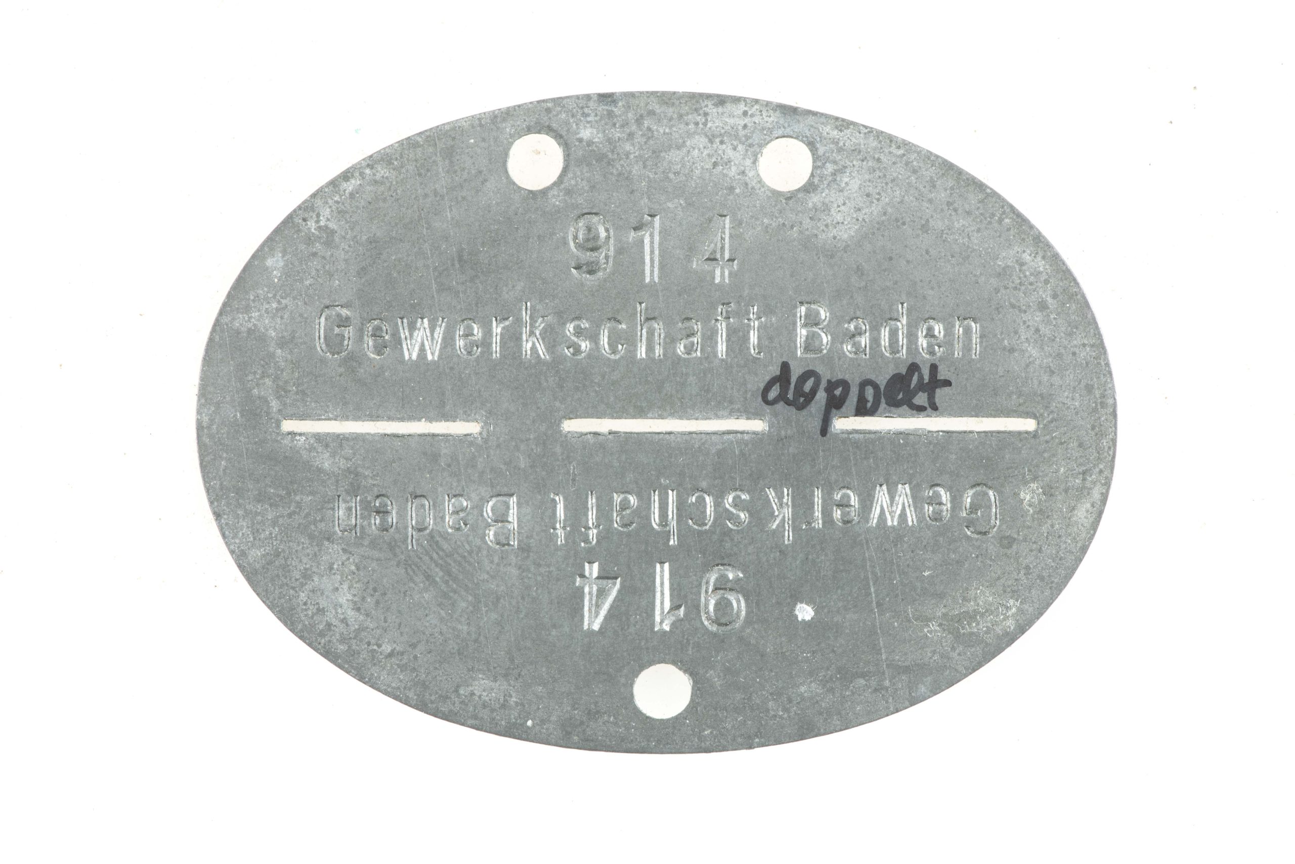 German ID disc or Erkennungsmarke marked Gewerkschaft Baden 914 or the Baden Trade union. Worn by a miner during the war in the shafts of Baden, Markgraf and Heitersheim. It would have been worn by a foreign labourer interned at the barracks camp. A lot of these ’employees’ would have been forced to work at the Westwall and later drafted in the Volkssturm. A rare example!