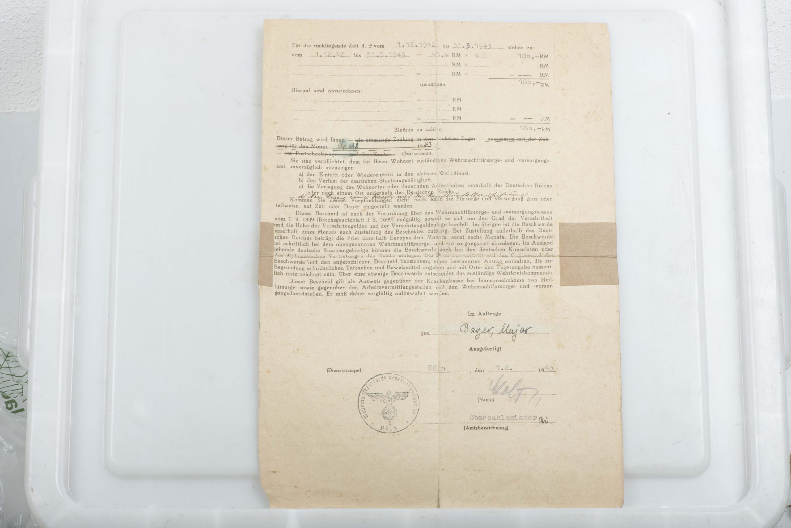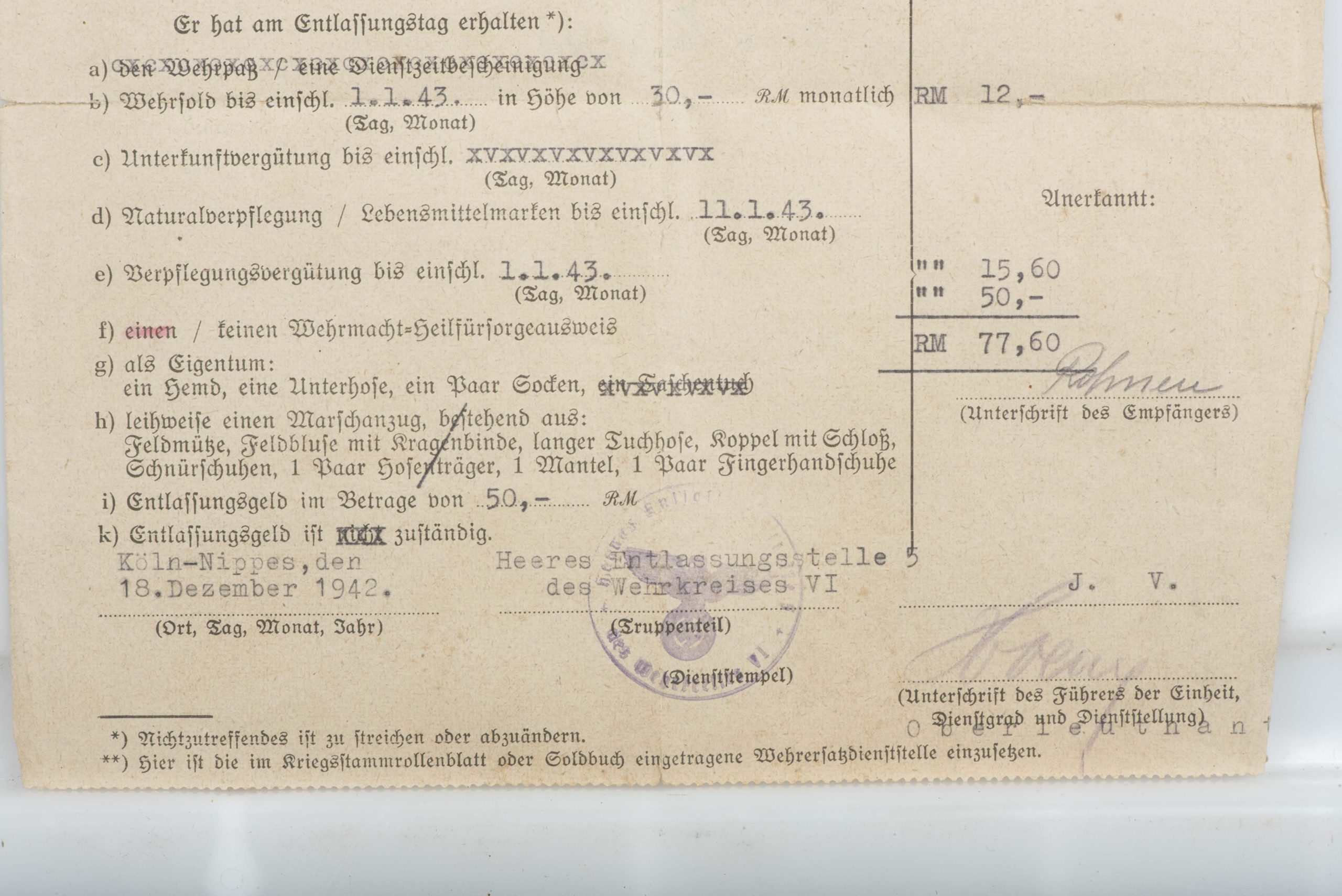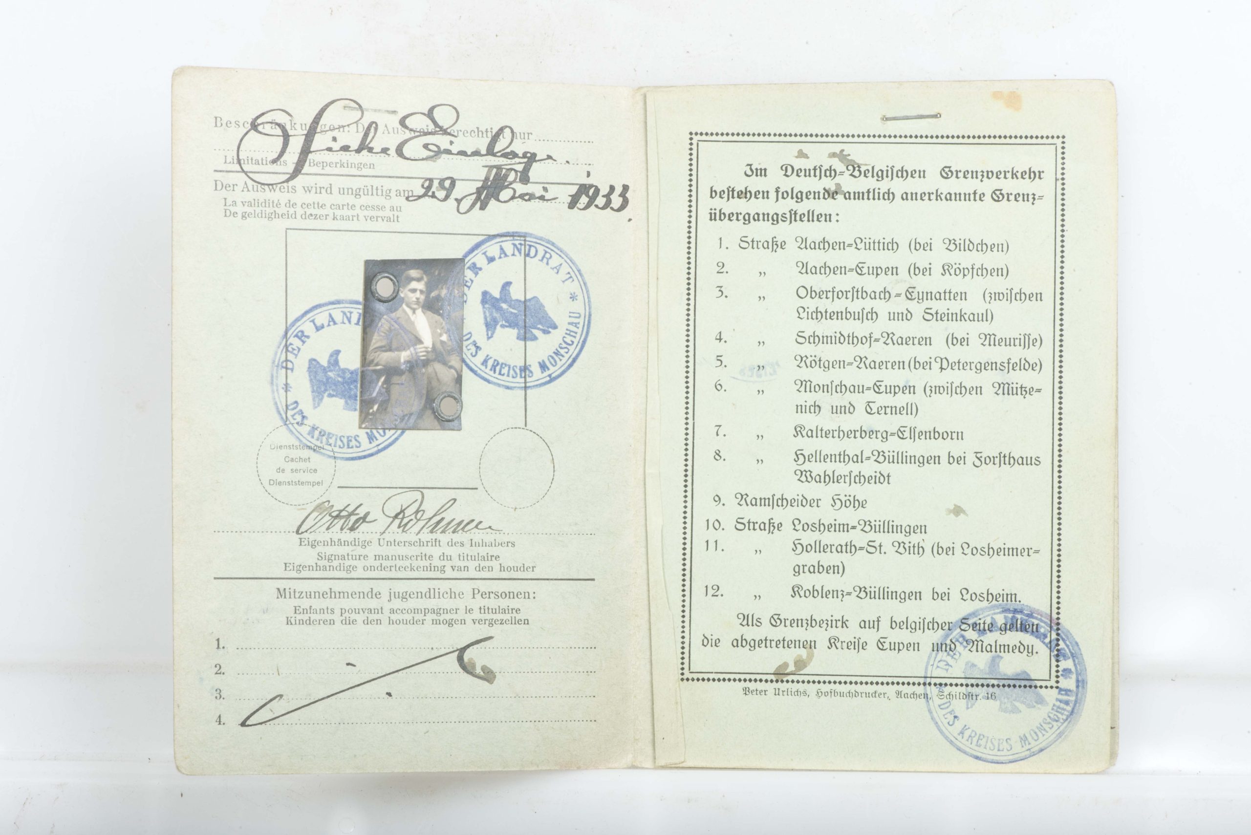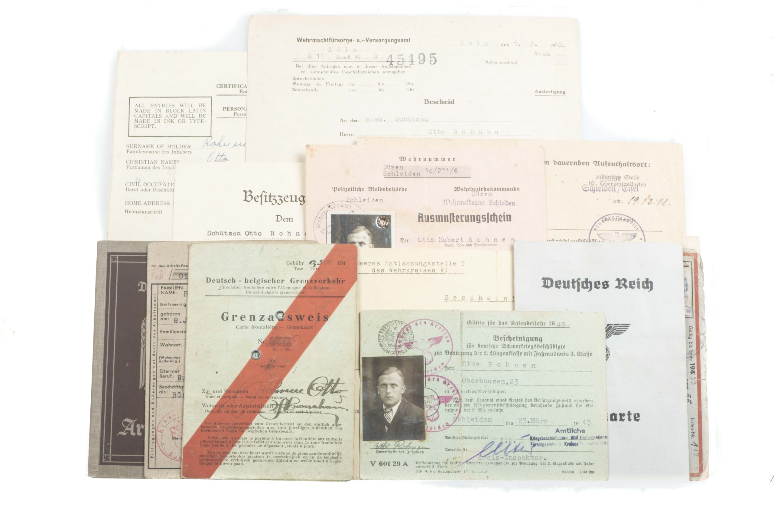 You have a comprehensive and chronological collection of German civilian, military, medical, and employment records belonging to Otto Rohnen. Otto Rohnen was born and raised in Monschau which was on the Belgian border. That is why he has a Belgian border crossing pass. He served with 8 Kompanie Infanterie Regiment 473. Otto lost 7 toes, most probably due to frostbite on 18.03.1942 and was awarded the black wound badge on 17.07.194 in Prague. He was discharged from service in December 1942.