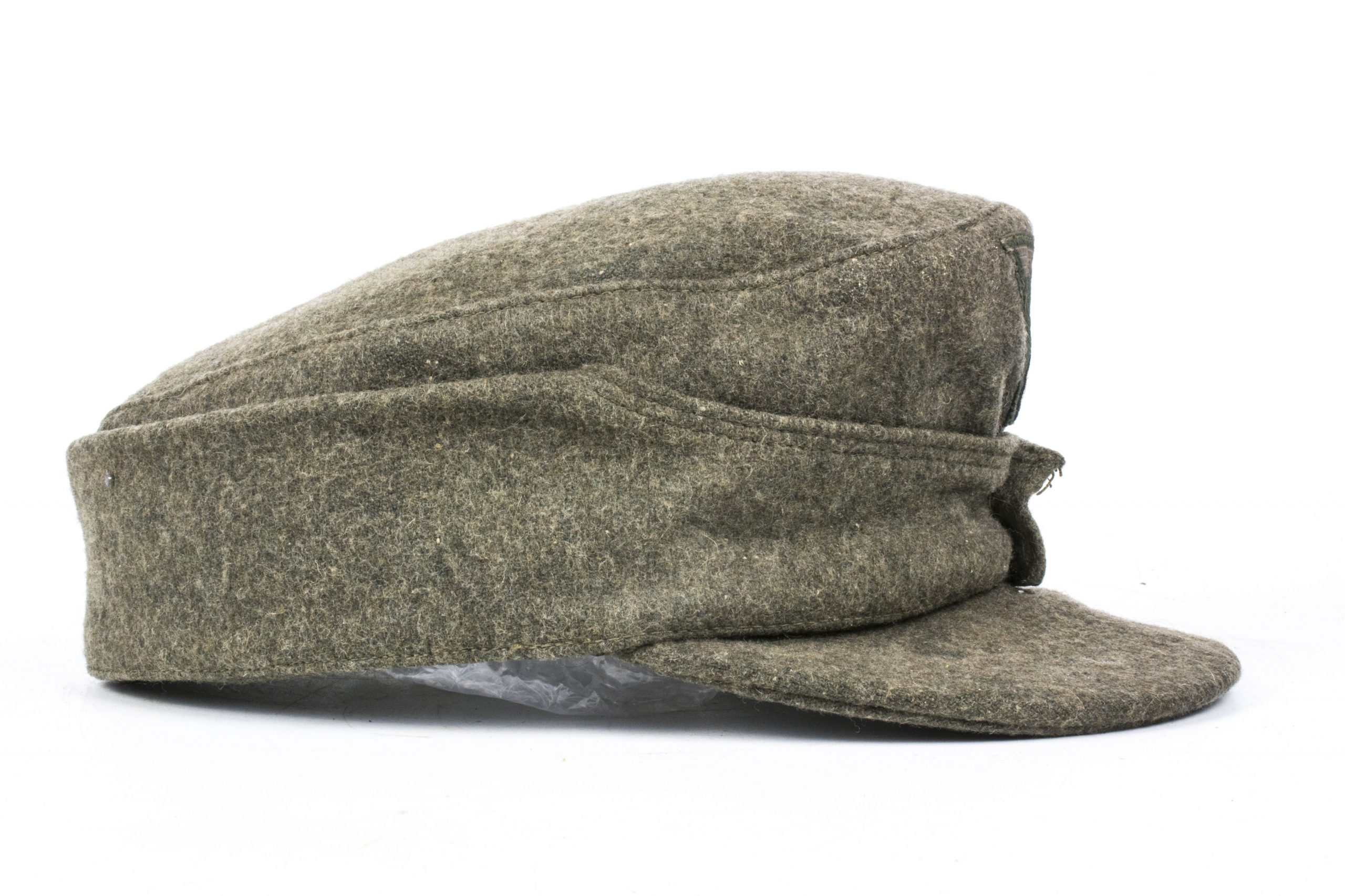A suberb original Heer EM/NCO M43 field cap dated 1943 and marked 1/0450/0272. The cap is a desirable size 56 and is in good lightly worn condition. The cap retains its factory zigzag sewn trapezoid. The buttons are also factory sewn. The nap of the wool is still present 99%. A nice and textbook detail in this cap is the stitching lines in multiple colours, running all over the place like it should in a late war manufactured garment. Surely one of the best Heer M43 caps I’ve had to offer in very good condition!