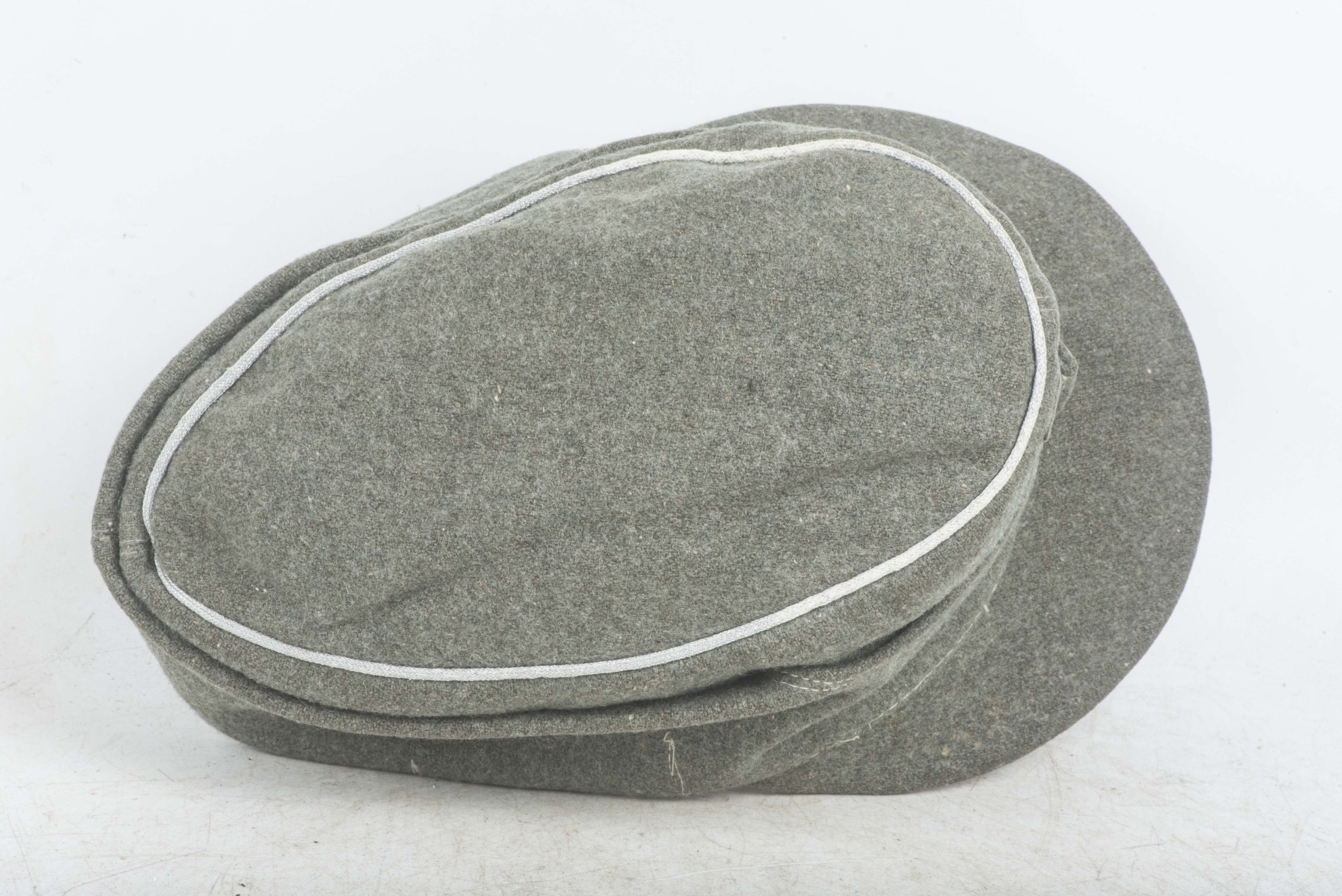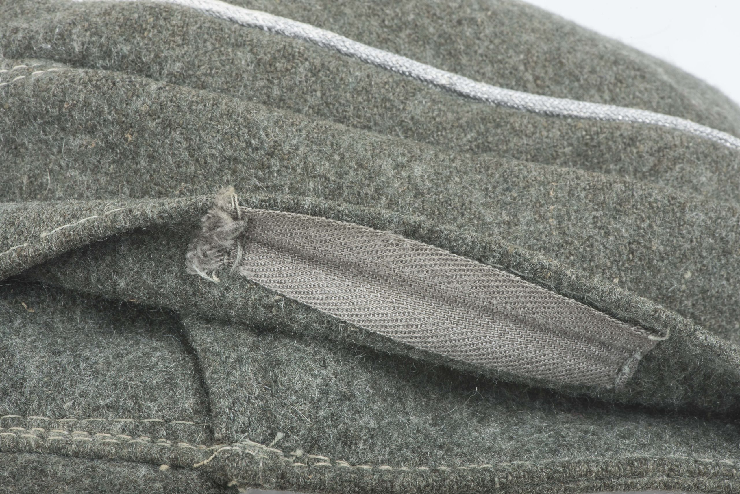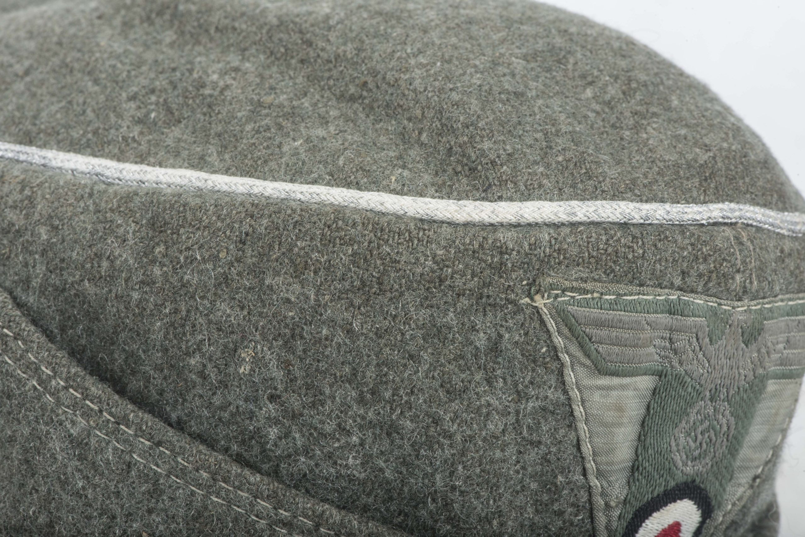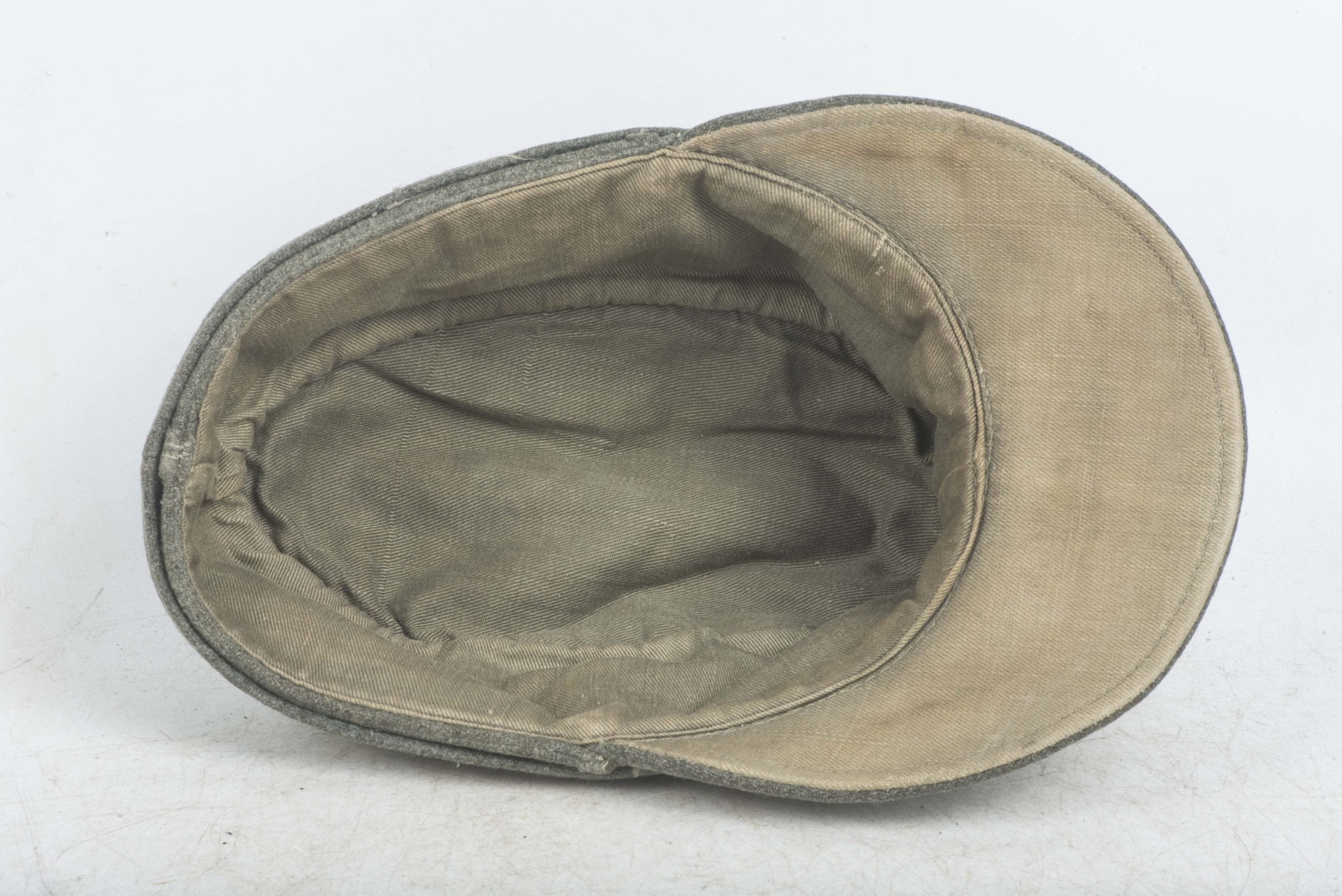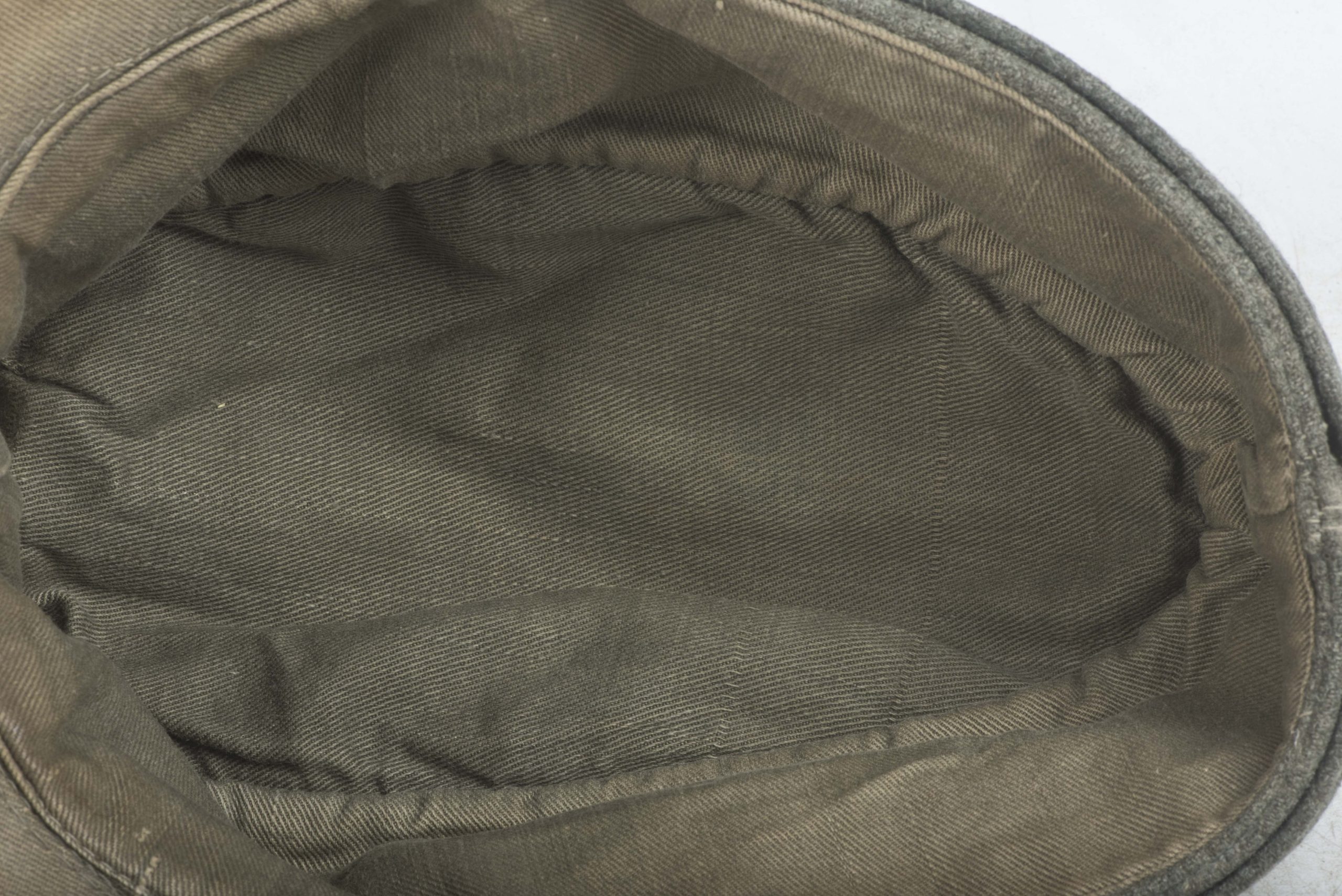 Heer officer M43 field cap with factory sewn T-eagle. The cap is a textbook late war officer field cap with silver piping along the top. The T-shaped EM/NCO eagle is factory applied and typical for this type of cap with the canvas visor lining. The interior and the visor lining are both made of the same material. The cap is size marked 55 or 56. Nice untouched cap!