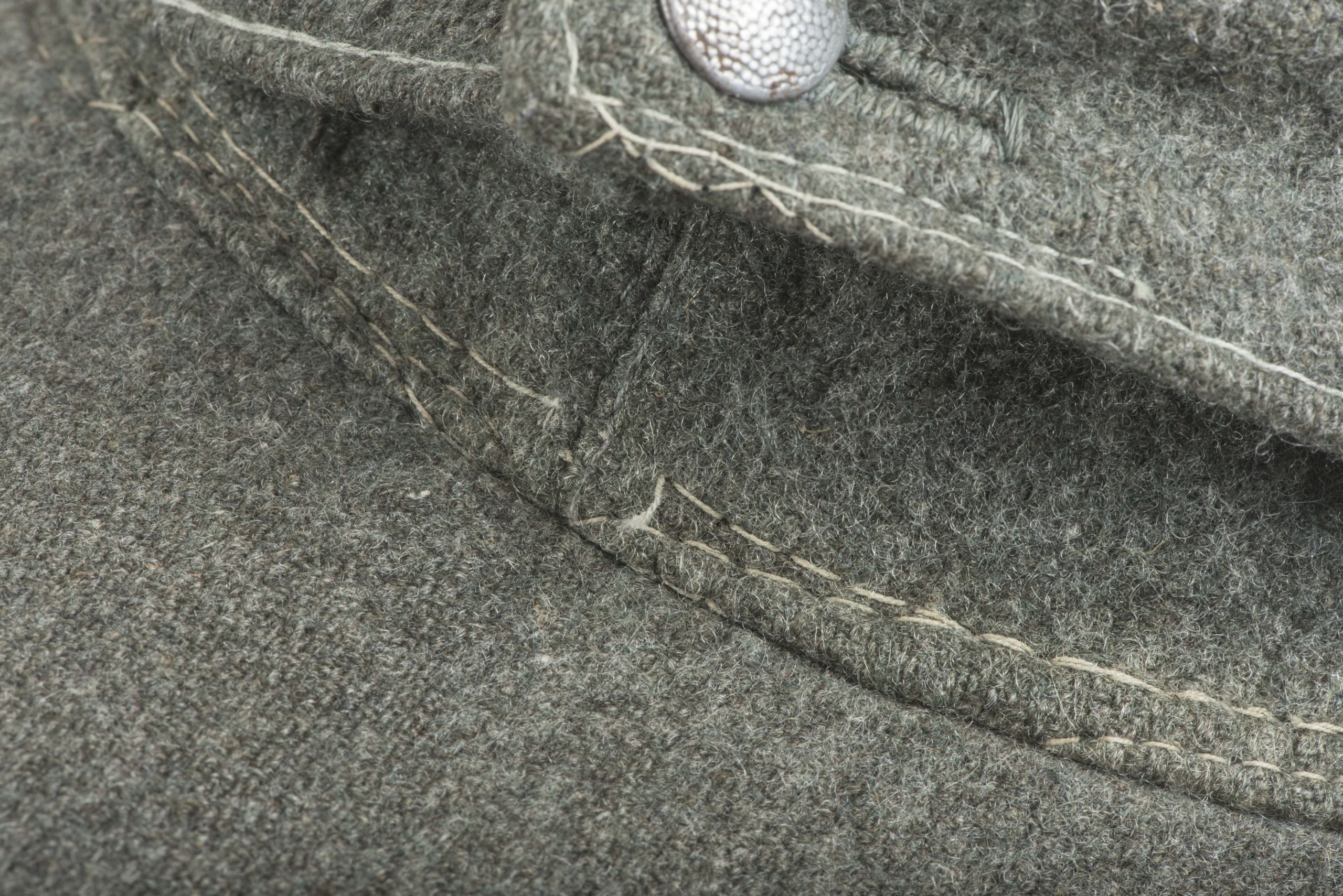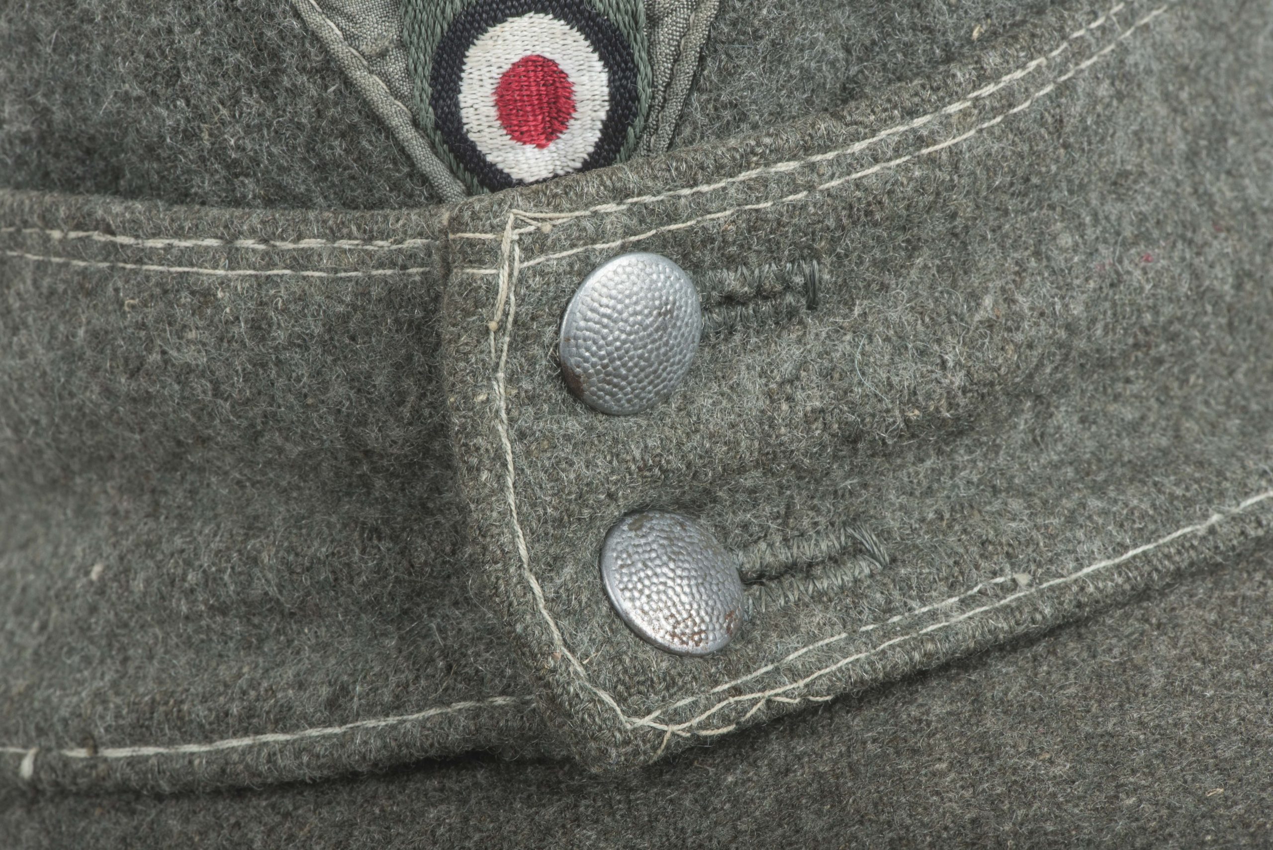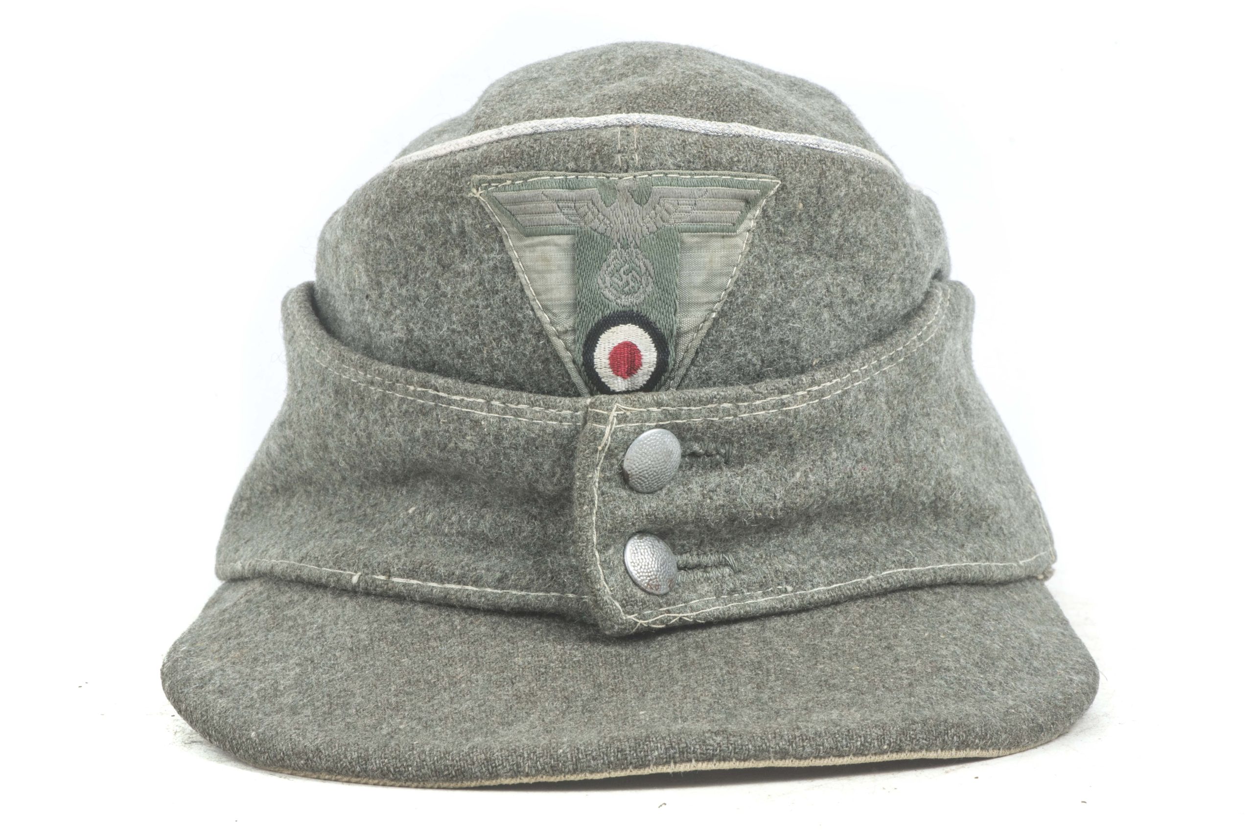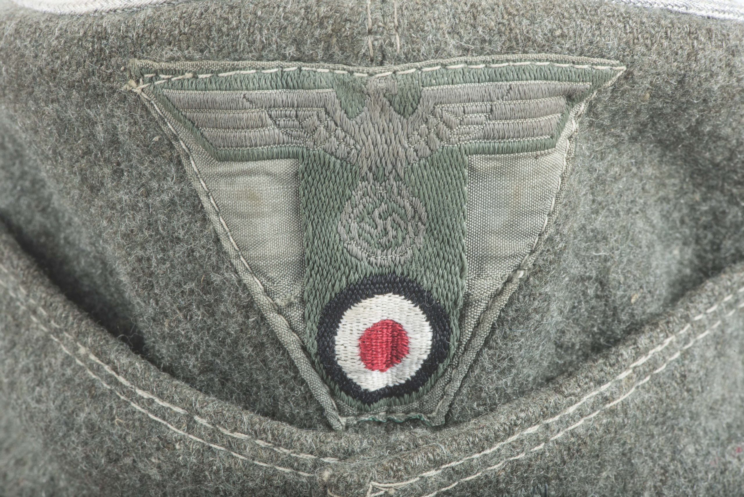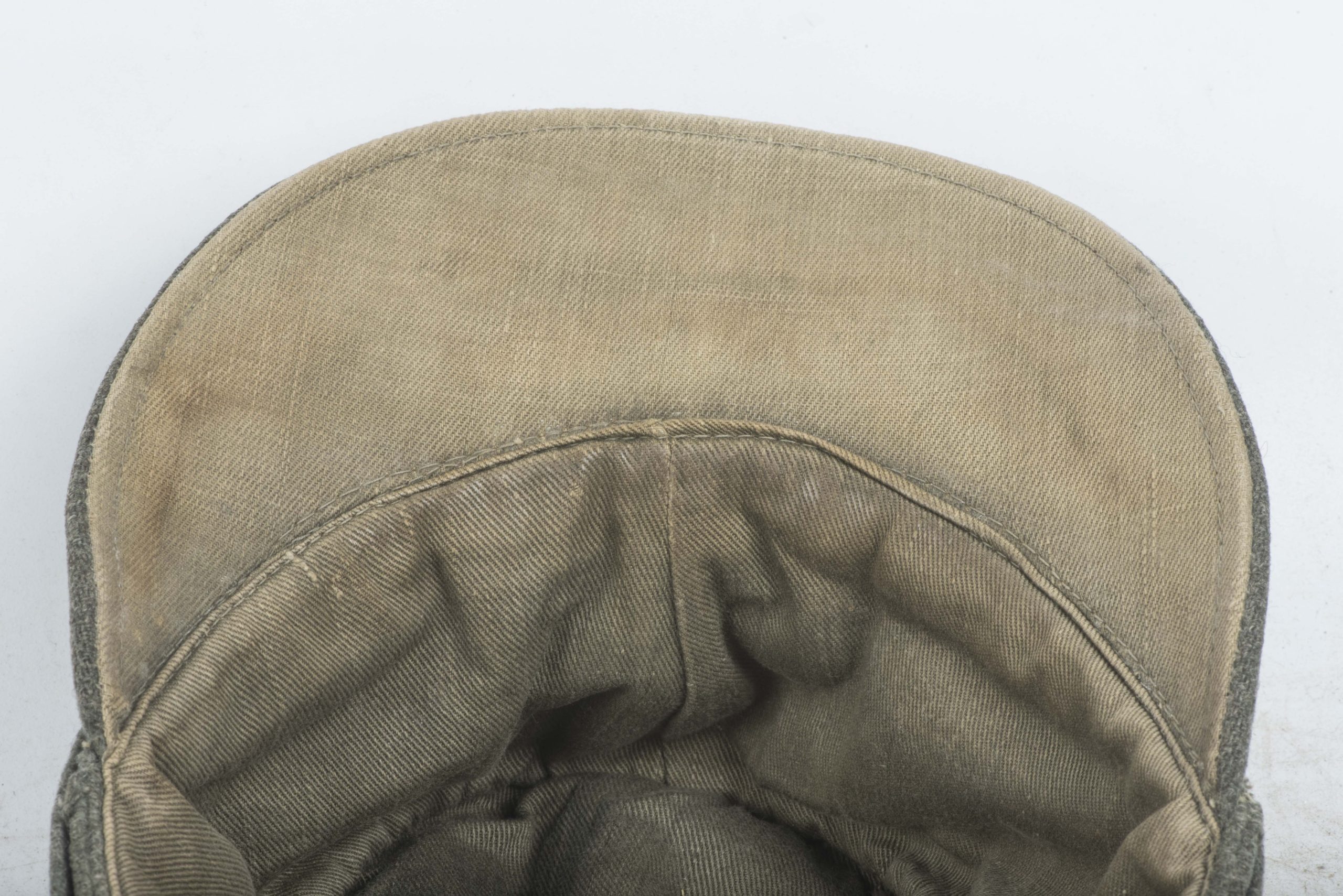 Heer officer M43 field cap with factory sewn T-eagle. The cap is a textbook late war officer field cap with silver piping along the top. The T-shaped EM/NCO eagle is factory applied and typical for this type of cap with the canvas visor lining. The interior and the visor lining are both made of the same material. The cap is size marked 55 or 56. Nice untouched cap!