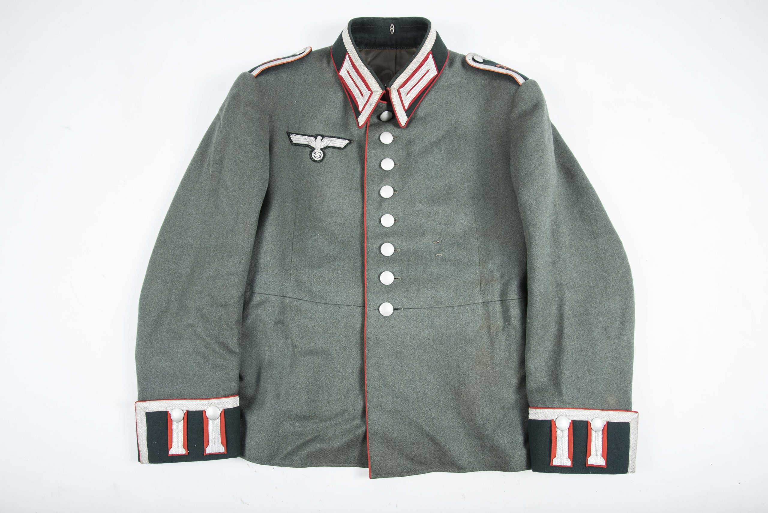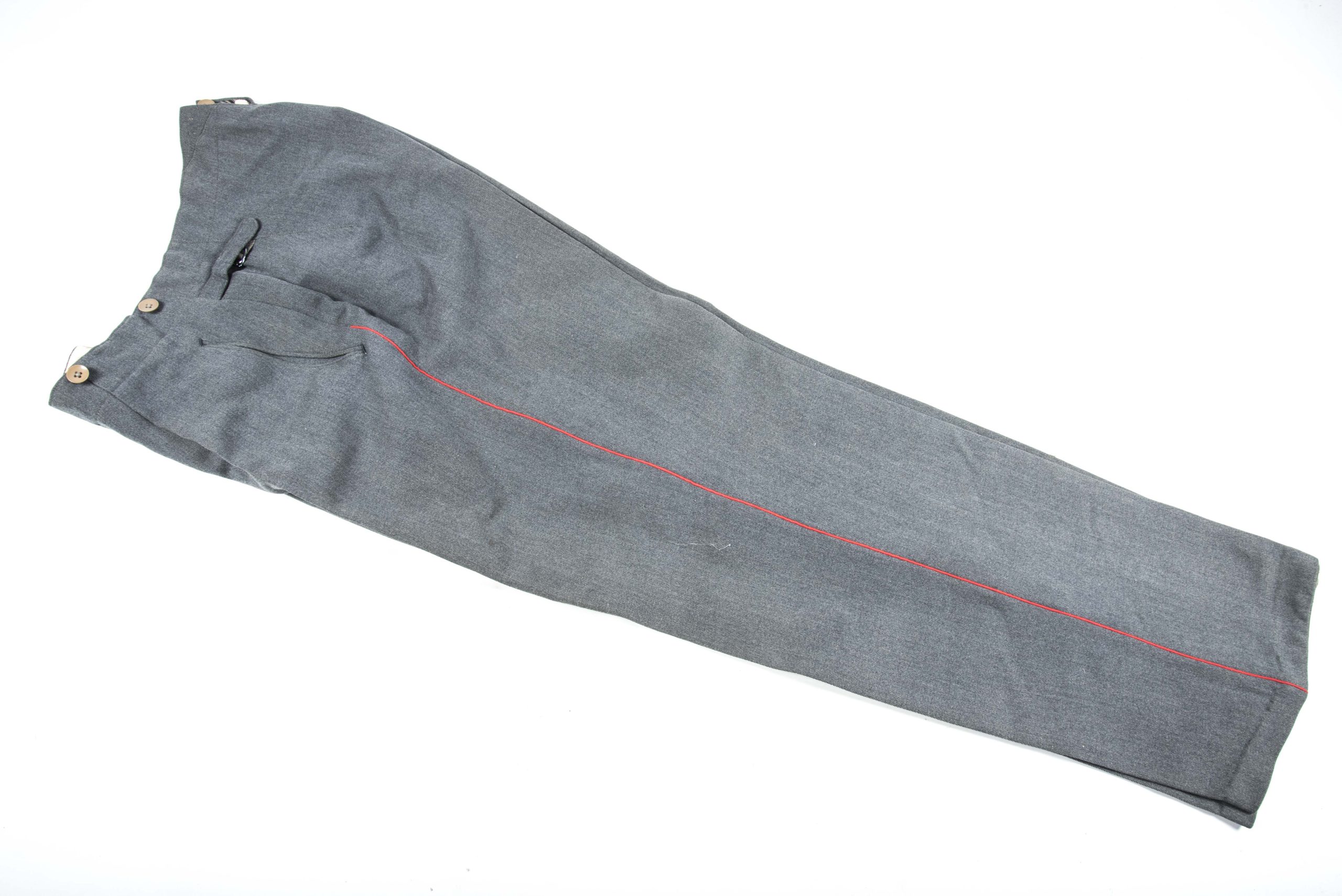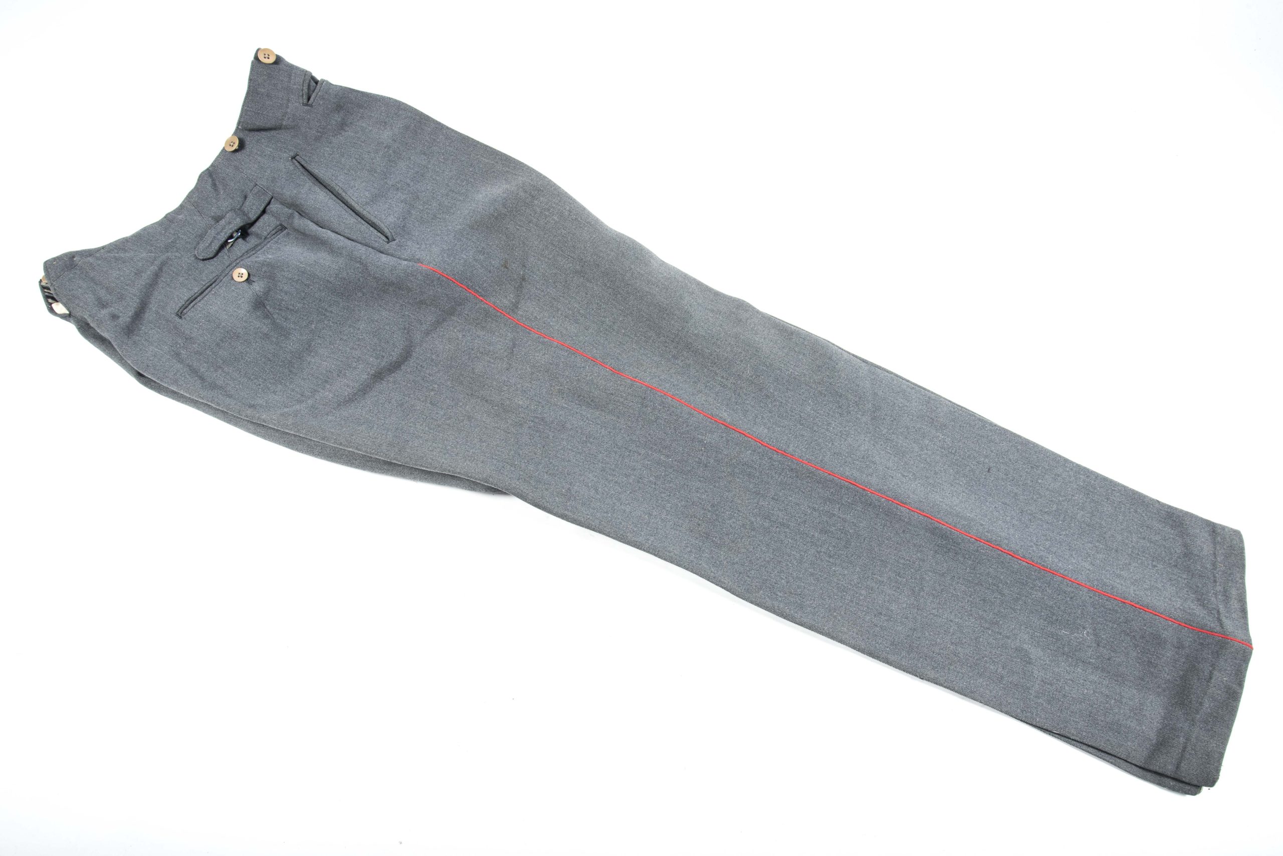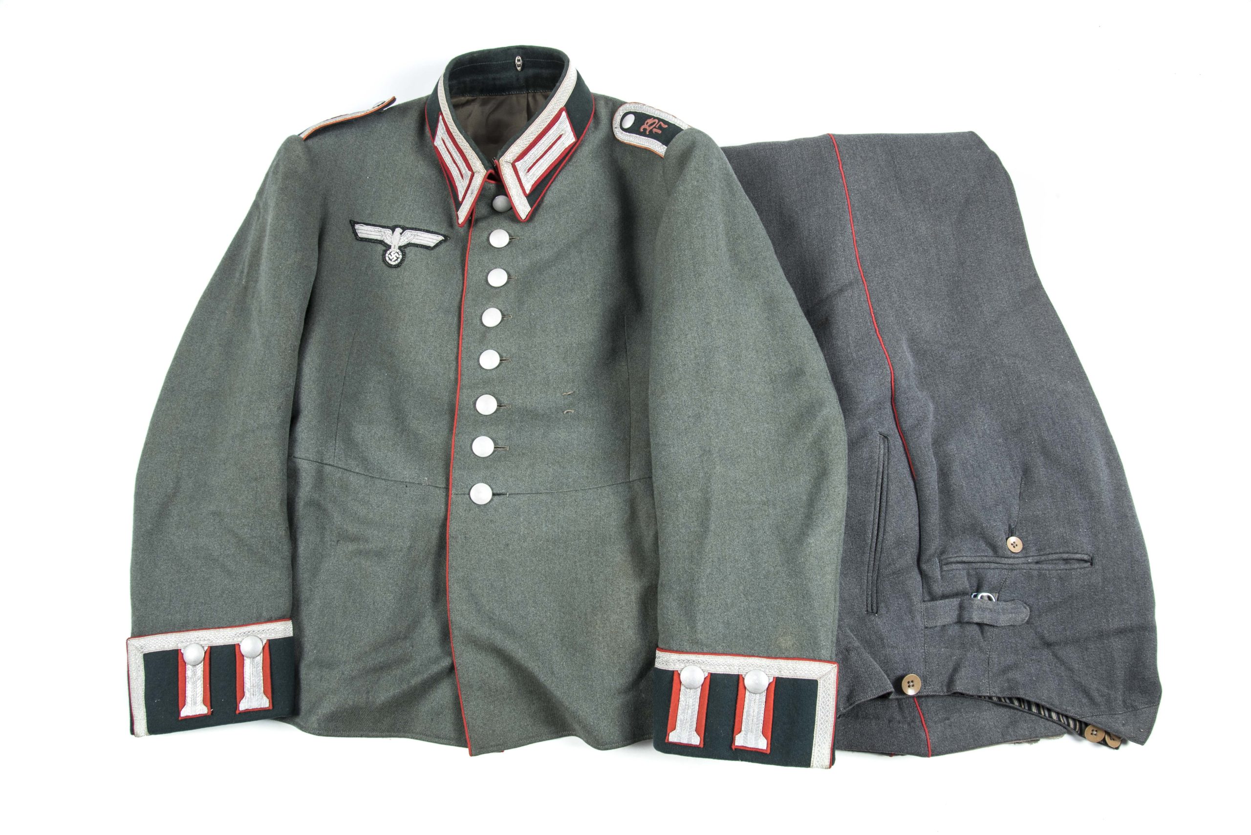 Heer Waffenrock set for a Unteroffizier in Beobachtungsabteilung 17 in good condition. This is a beautiful and matching set consisting of a Waffenrock complete with its typical pre war Steingrau, red piped Waffenrock trousers. The garment retains its original insignia for Beobachtungsabteilung 17 which was part of the 17. Infanteriedivision. The garments are in good, lightly worn condition. A Beobachtungsabteilung was a reconnaissance and observing section for German Artillery units. This unit was serving in the front line 99% of the time, even some times in front of the infantry. This is a very nice matching set!
