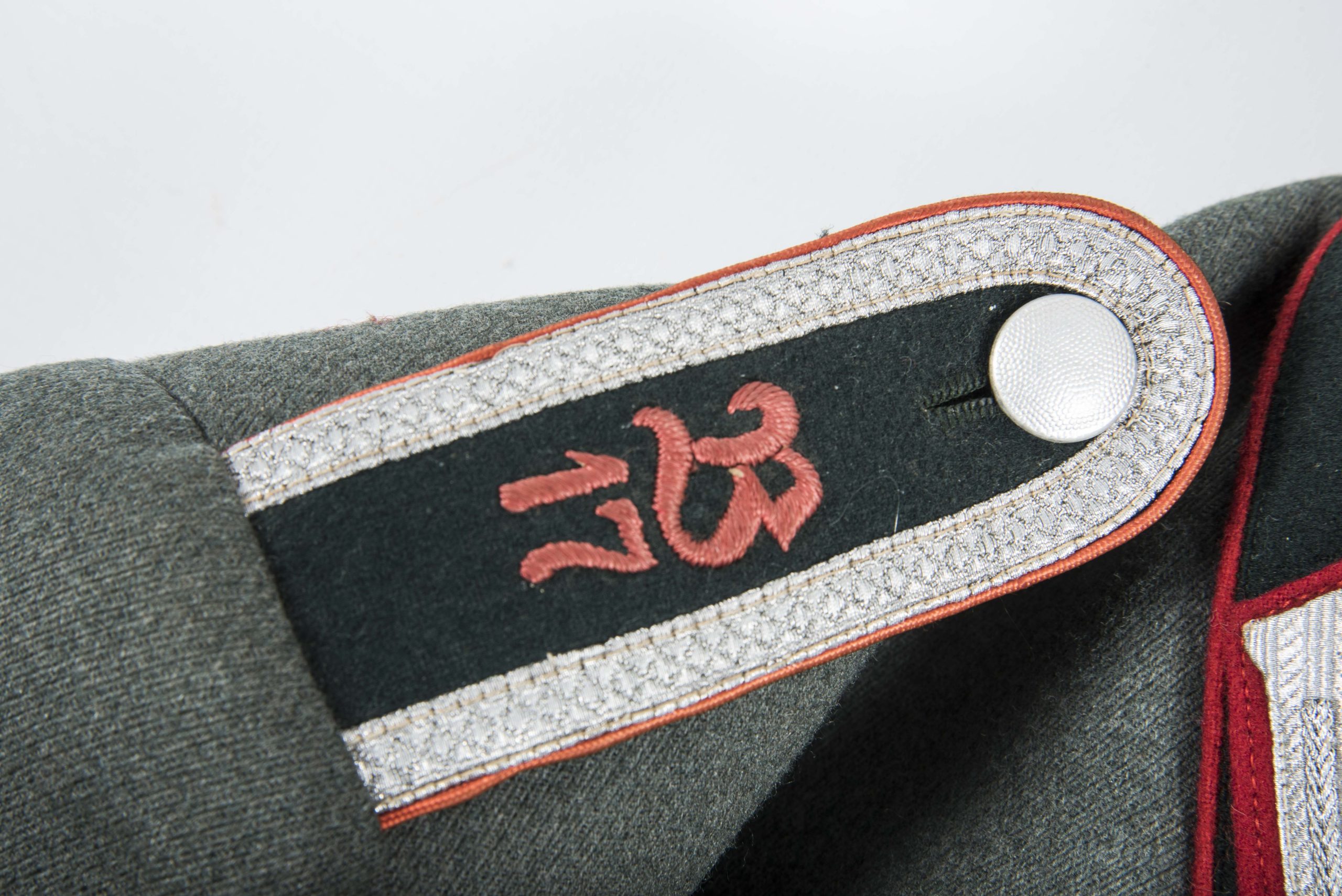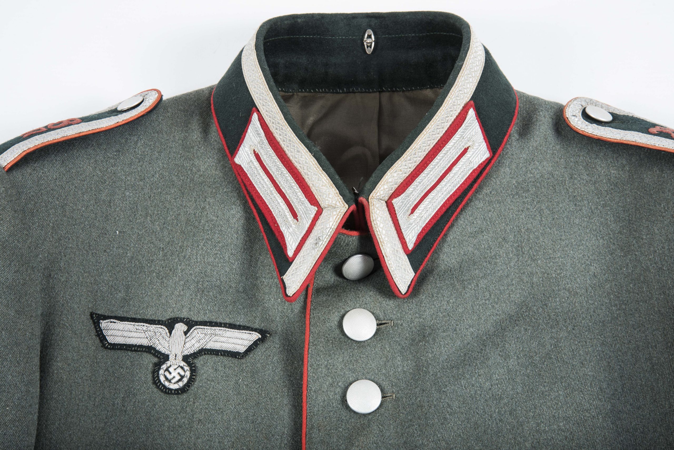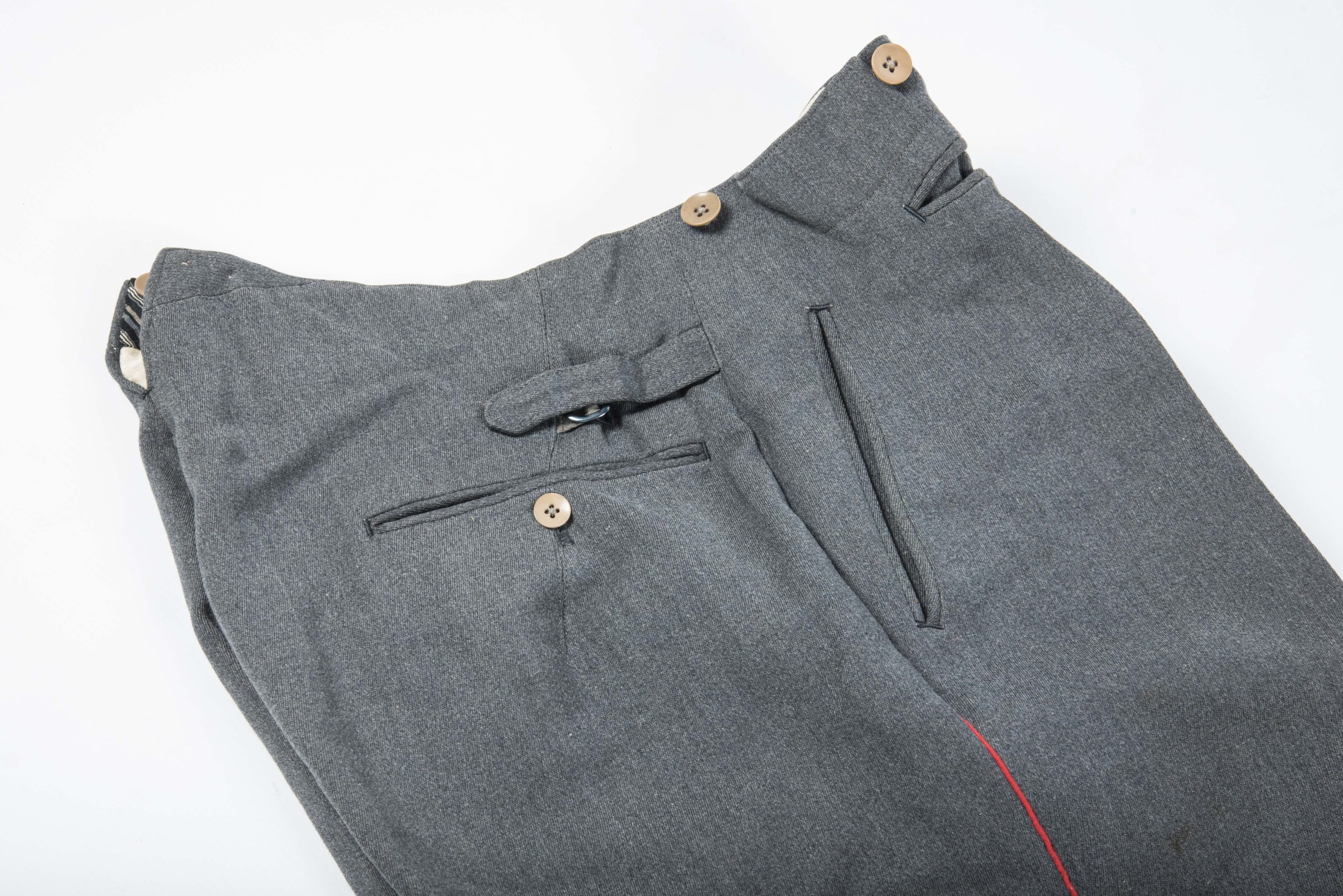 Heer Waffenrock set for a Unteroffizier in Beobachtungsabteilung 17 in good condition. This is a beautiful and matching set consisting of a Waffenrock complete with its typical pre war Steingrau, red piped Waffenrock trousers. The garment retains its original insignia for Beobachtungsabteilung 17 which was part of the 17. Infanteriedivision. The garments are in good, lightly worn condition. A Beobachtungsabteilung was a reconnaissance and observing section for German Artillery units. This unit was serving in the front line 99% of the time, even some times in front of the infantry. This is a very nice matching set!
