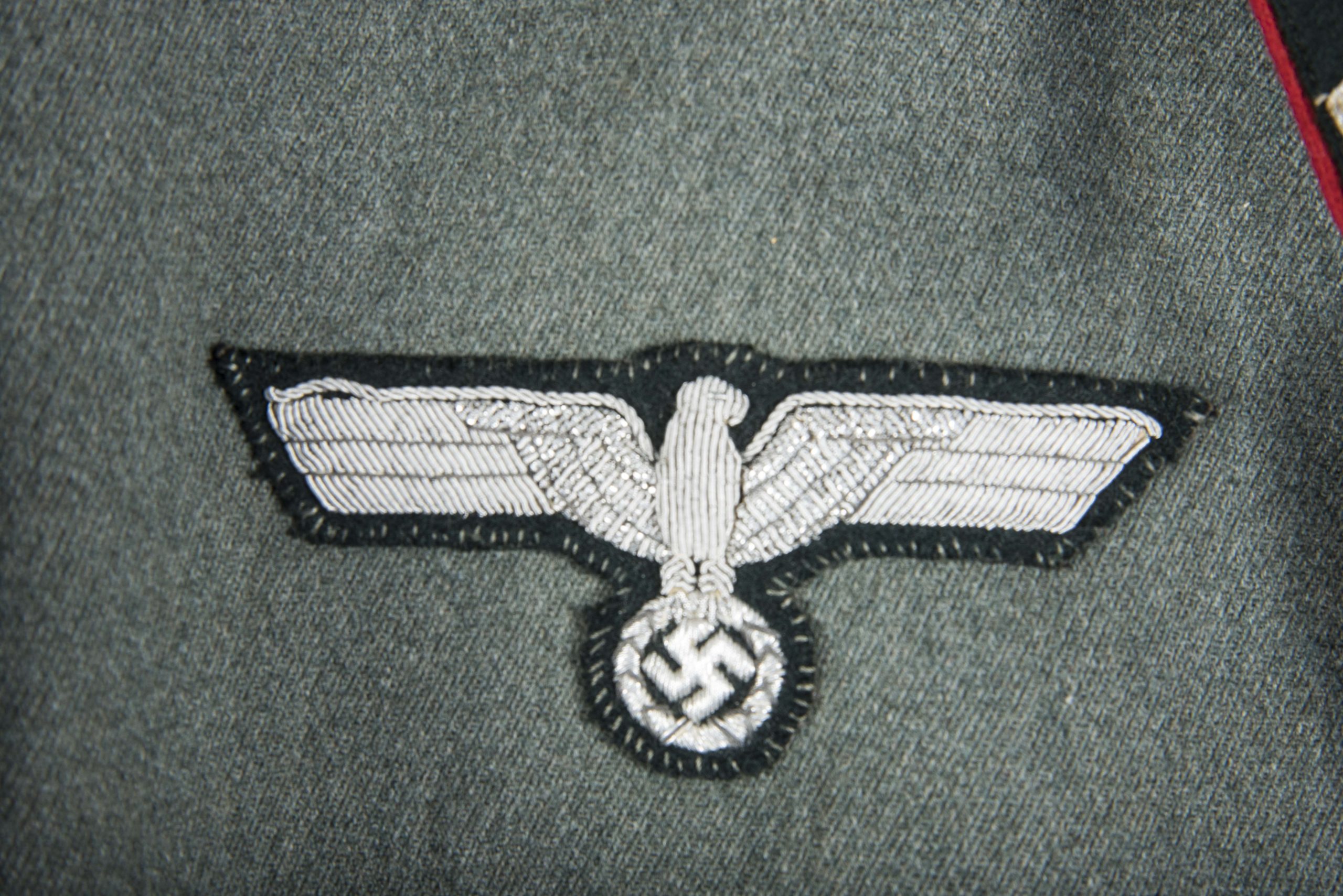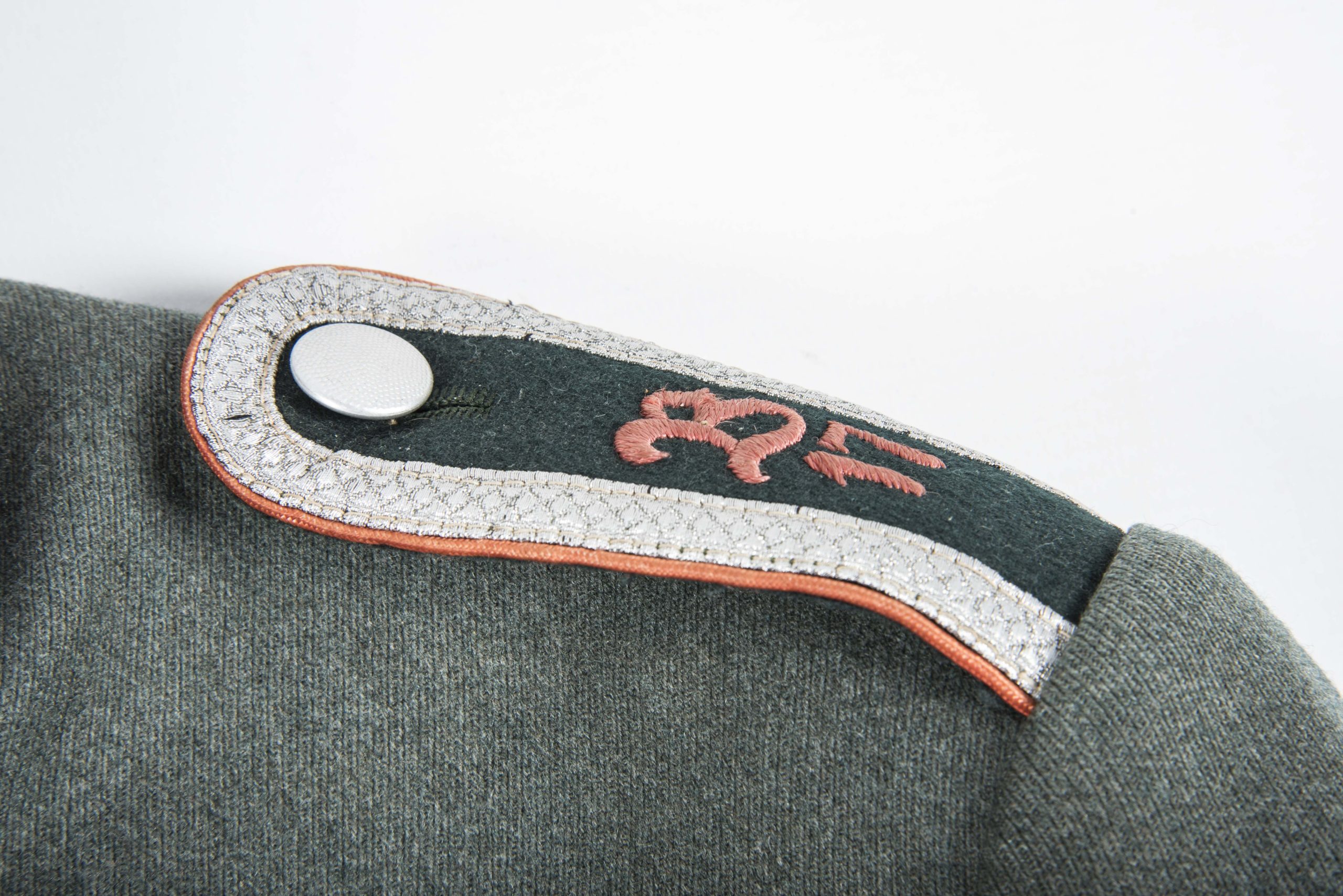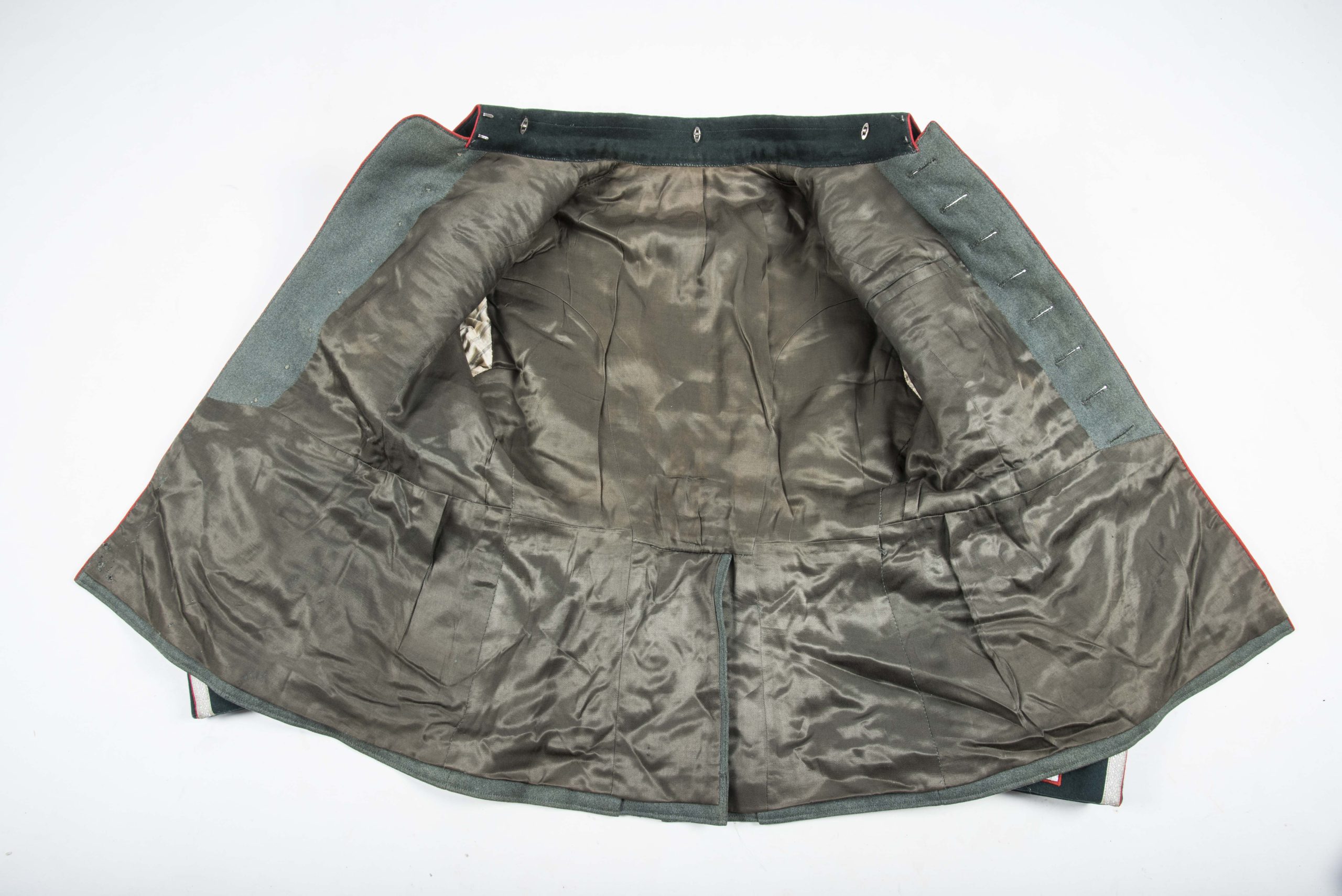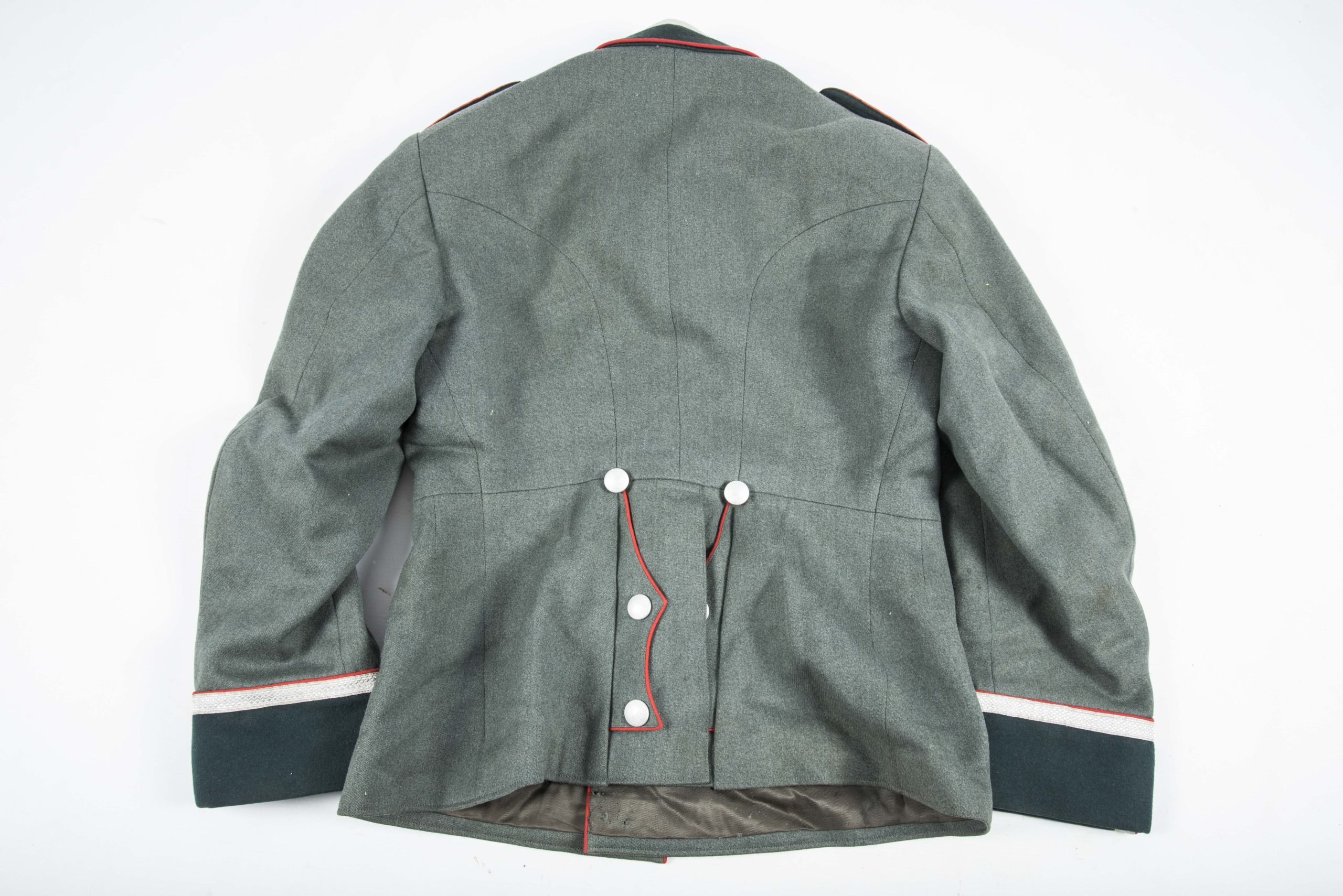 Heer Waffenrock set for a Unteroffizier in Beobachtungsabteilung 17 in good condition. This is a beautiful and matching set consisting of a Waffenrock complete with its typical pre war Steingrau, red piped Waffenrock trousers. The garment retains its original insignia for Beobachtungsabteilung 17 which was part of the 17. Infanteriedivision. The garments are in good, lightly worn condition. A Beobachtungsabteilung was a reconnaissance and observing section for German Artillery units. This unit was serving in the front line 99% of the time, even some times in front of the infantry. This is a very nice matching set!