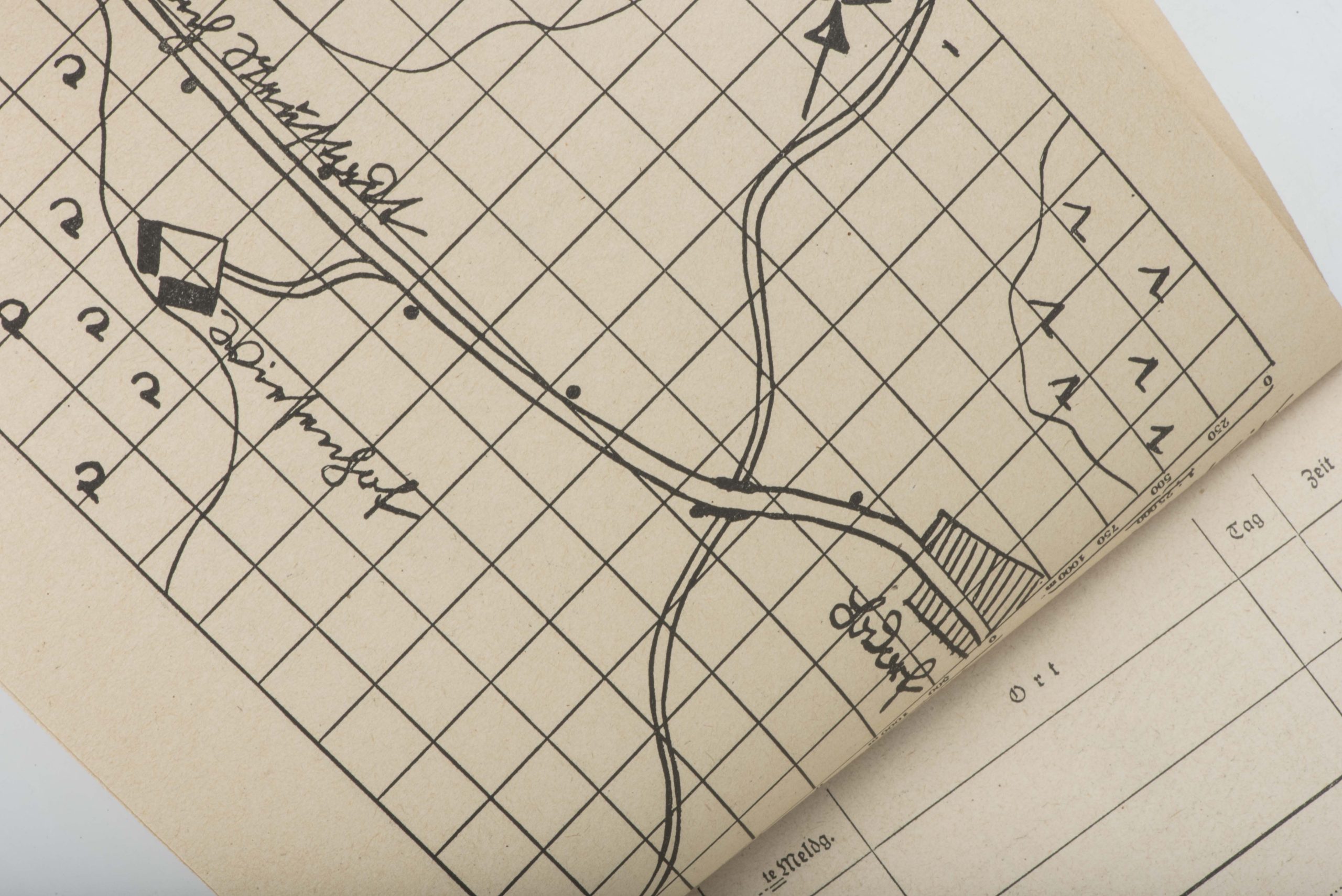 One of the rarest mapcase accessories: an original paper notebook for map sketching, taking notes and write down findings and messages. This is a beautiful period example for military use! The Helm Meldeblock is one of the most sought after type of these note books. Hard to find example in very good condition designed for military use!