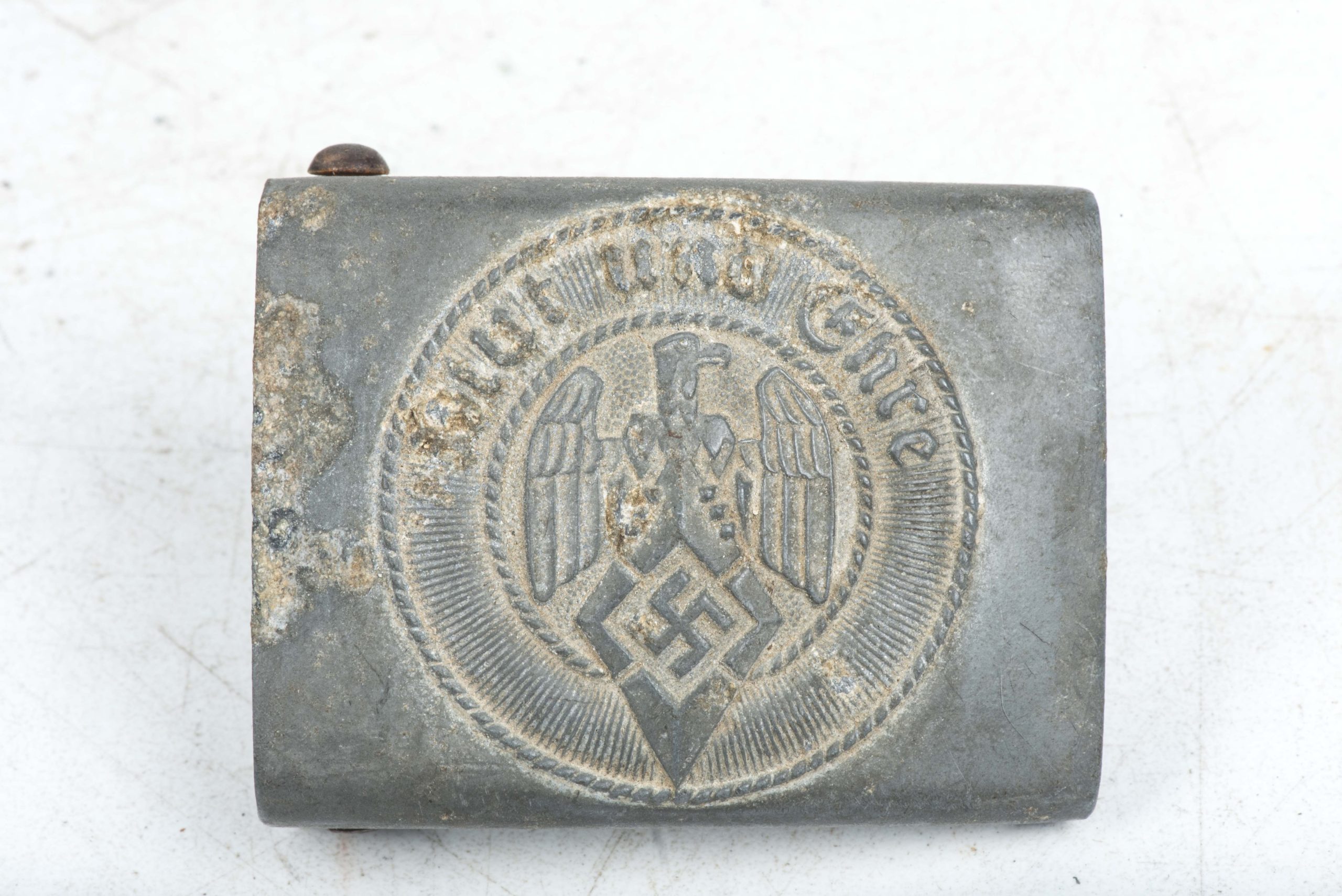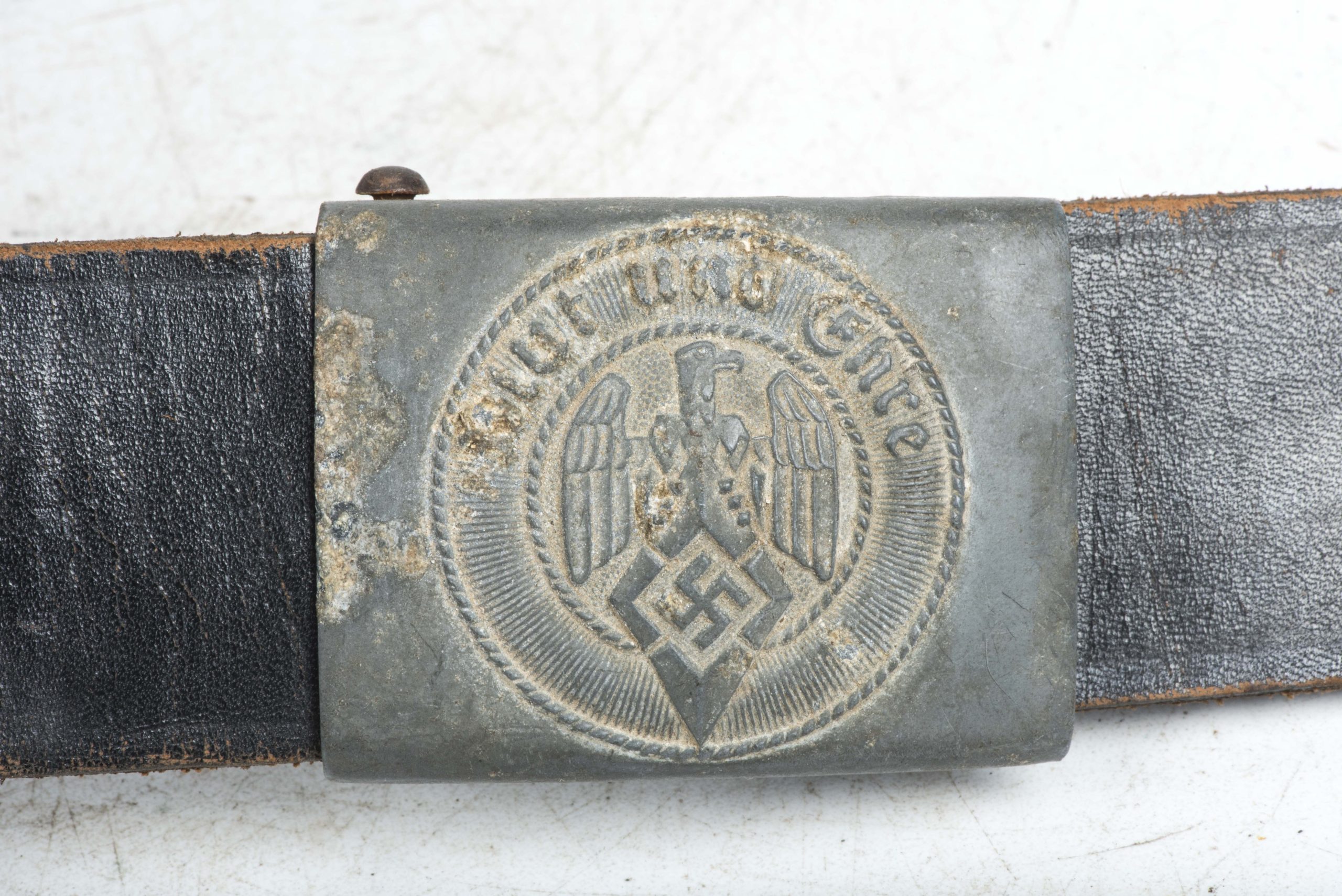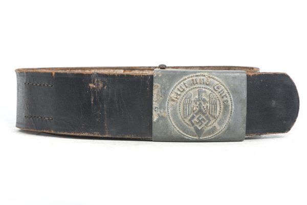 Rare zinc injection mold Hitlerjugend belt buckle marked M4/39 indicating production by Assmann & Sohne. The belt buckle is complete with its original leather belt which is nicely marked 85 which indicates the length in centimeters. Nice and hard to find set with a zinc injection mold Hitlerjugend belt buckle!
