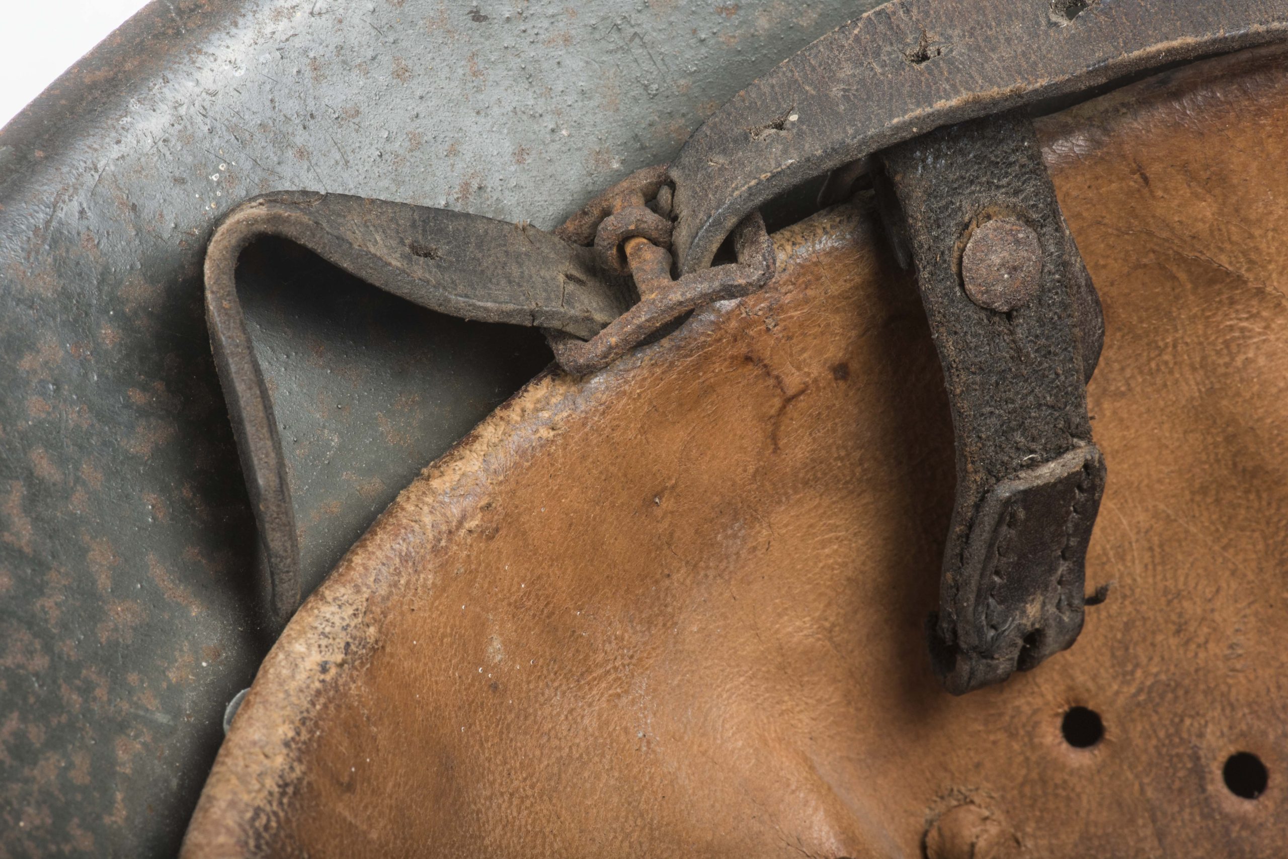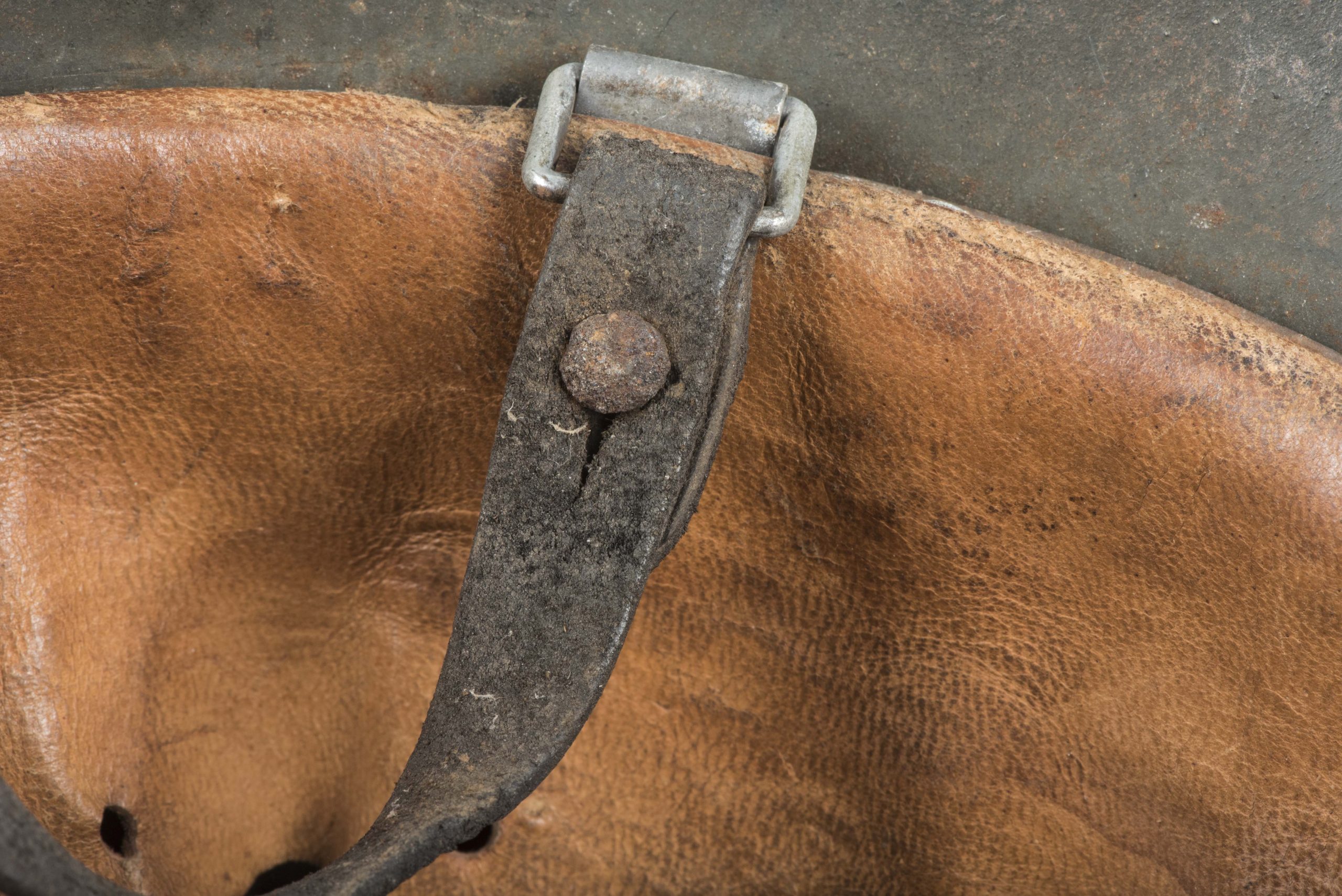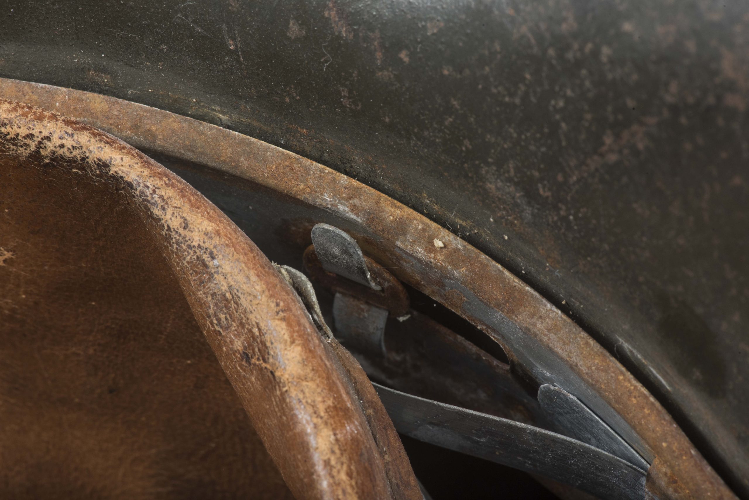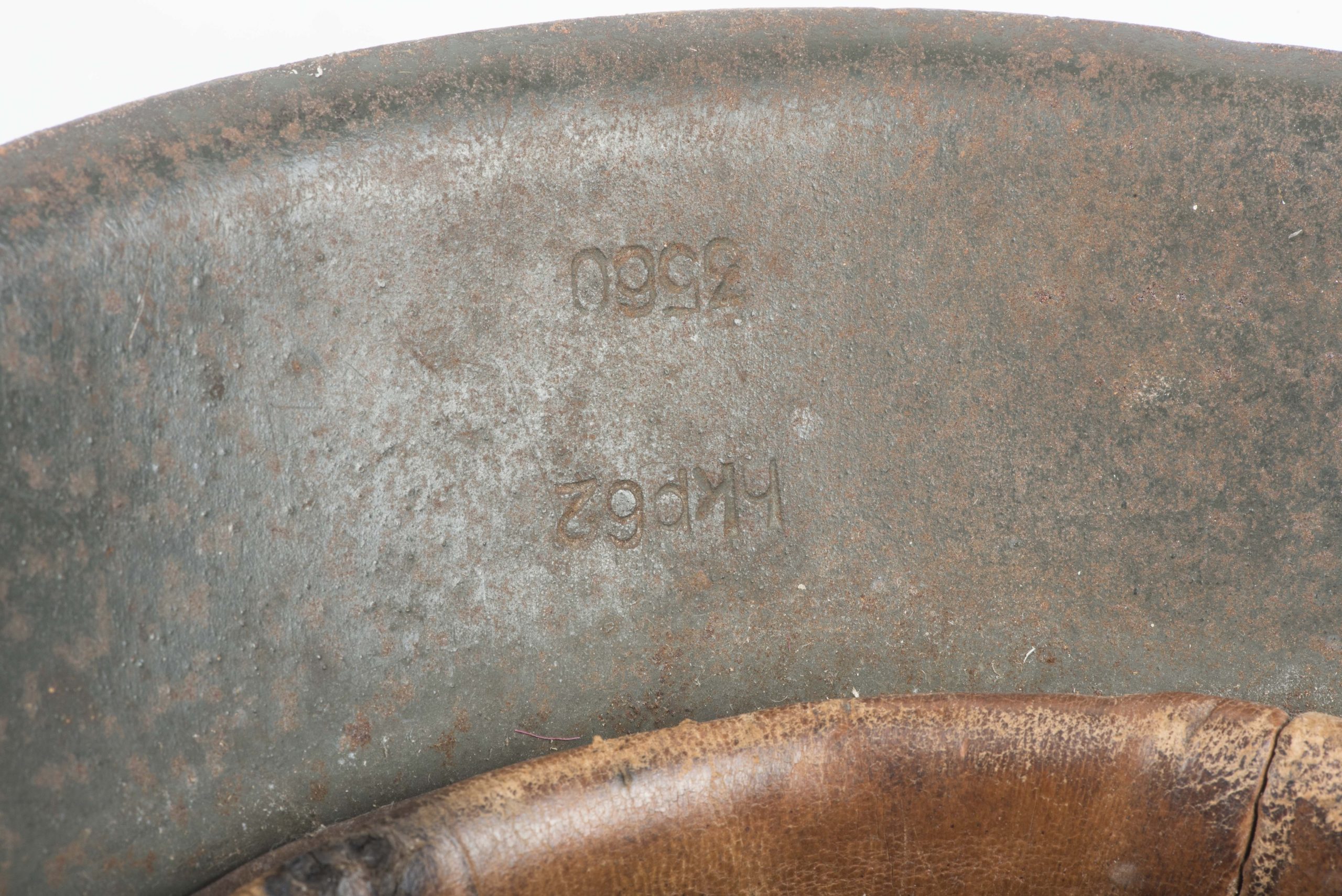 hkp62 M42 no decal helmet in good used condition. Typical late war example without decal. Complete with its original factory installed liner and damaged chinstrap. Nice piece!