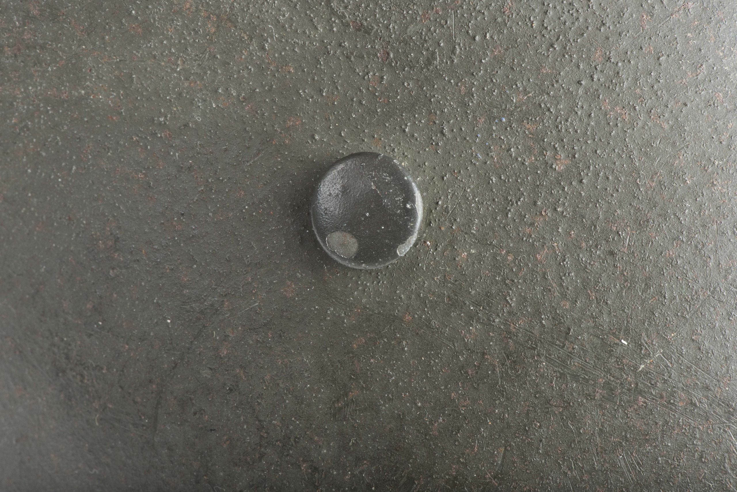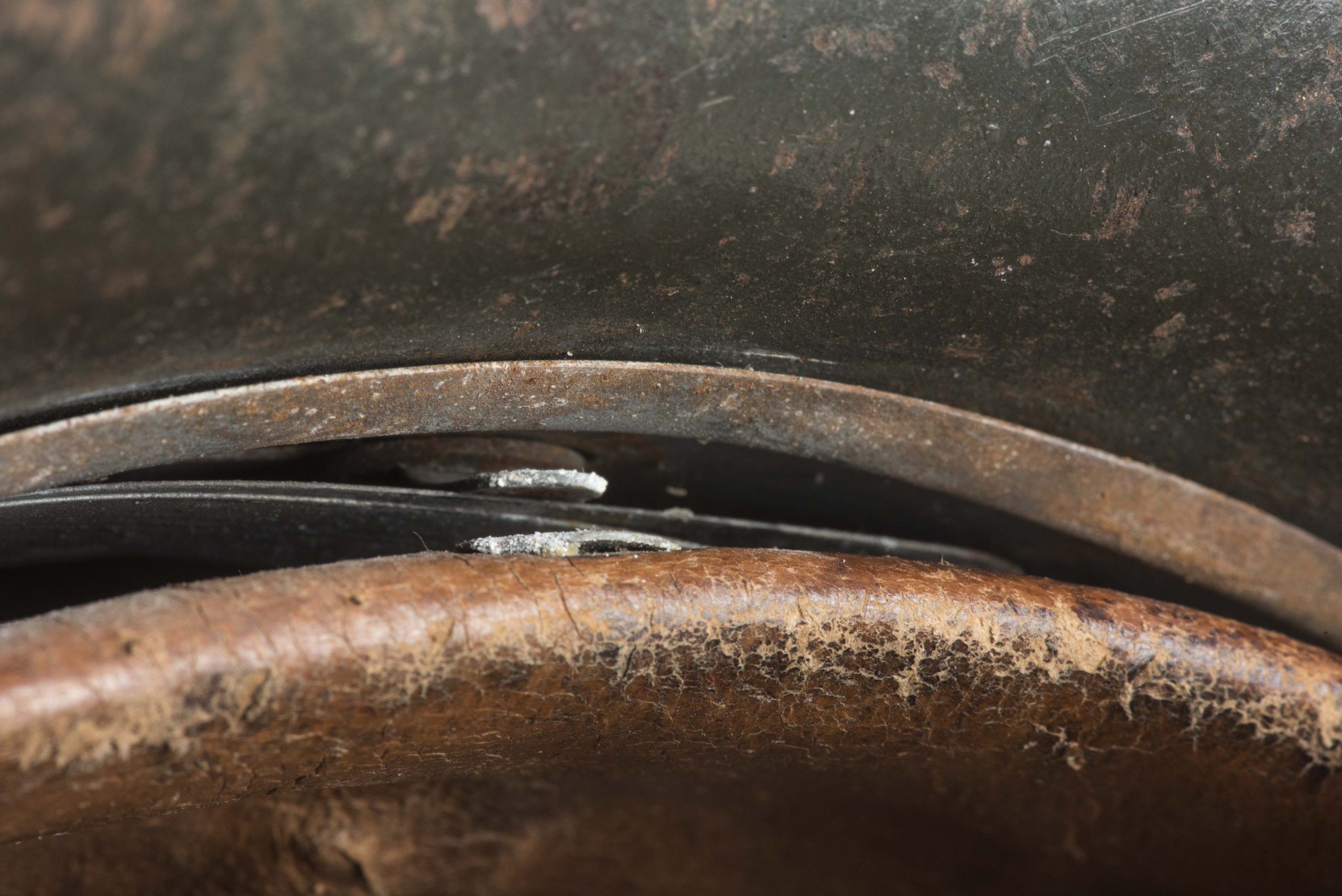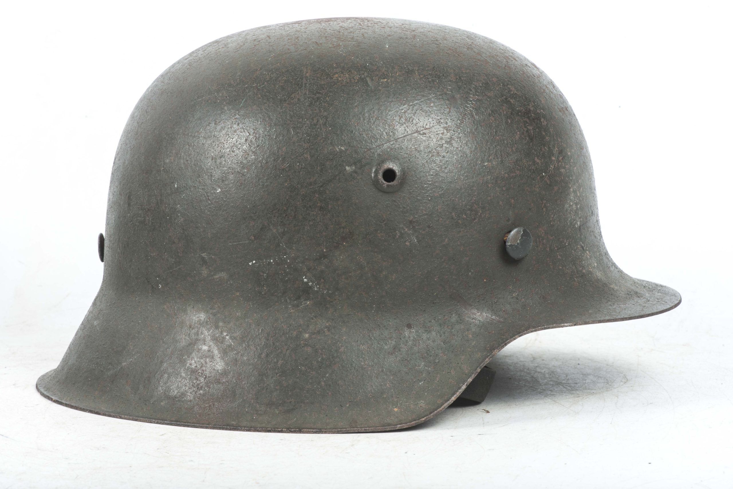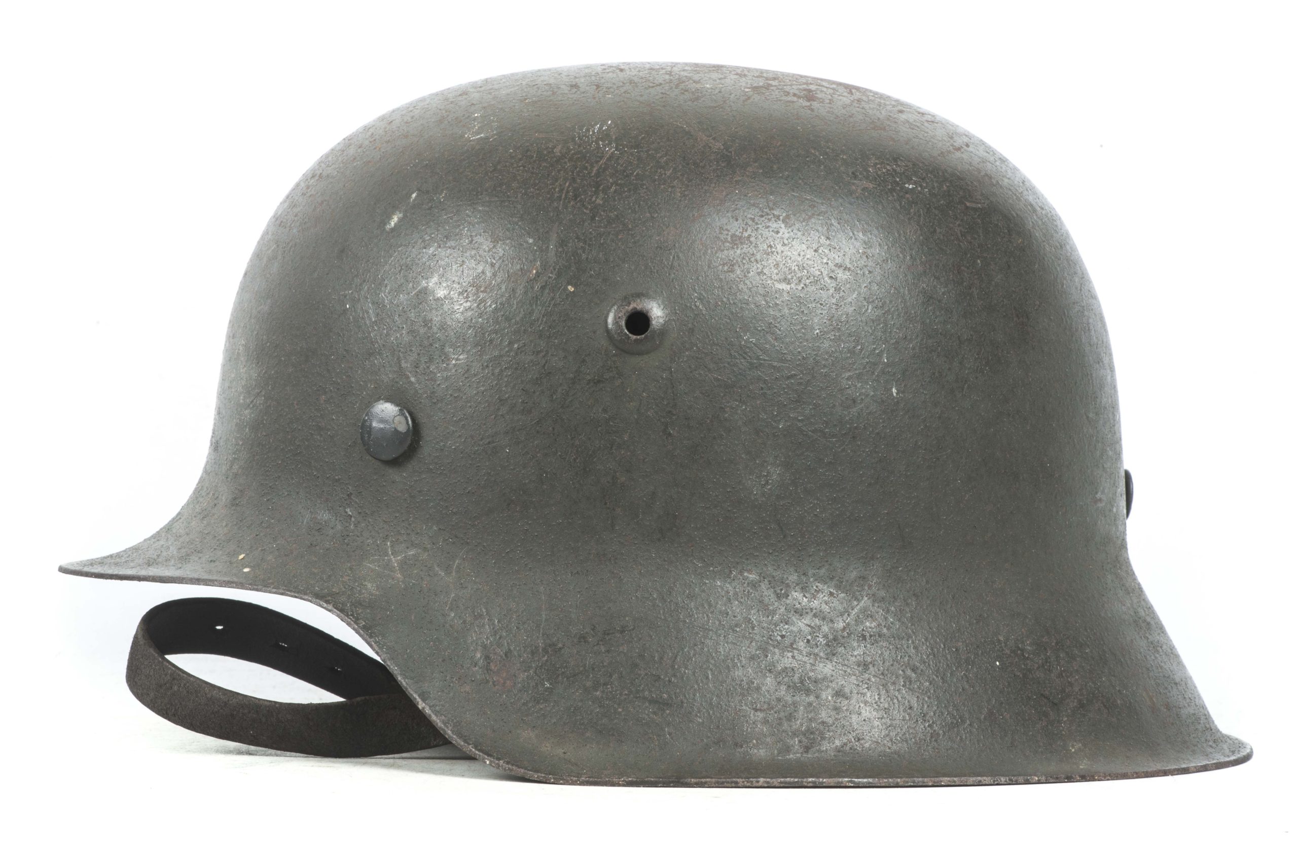 hkp62 M42 no decal helmet in good used condition. Typical late war example without decal. Complete with its original factory installed liner and damaged chinstrap. Nice piece!