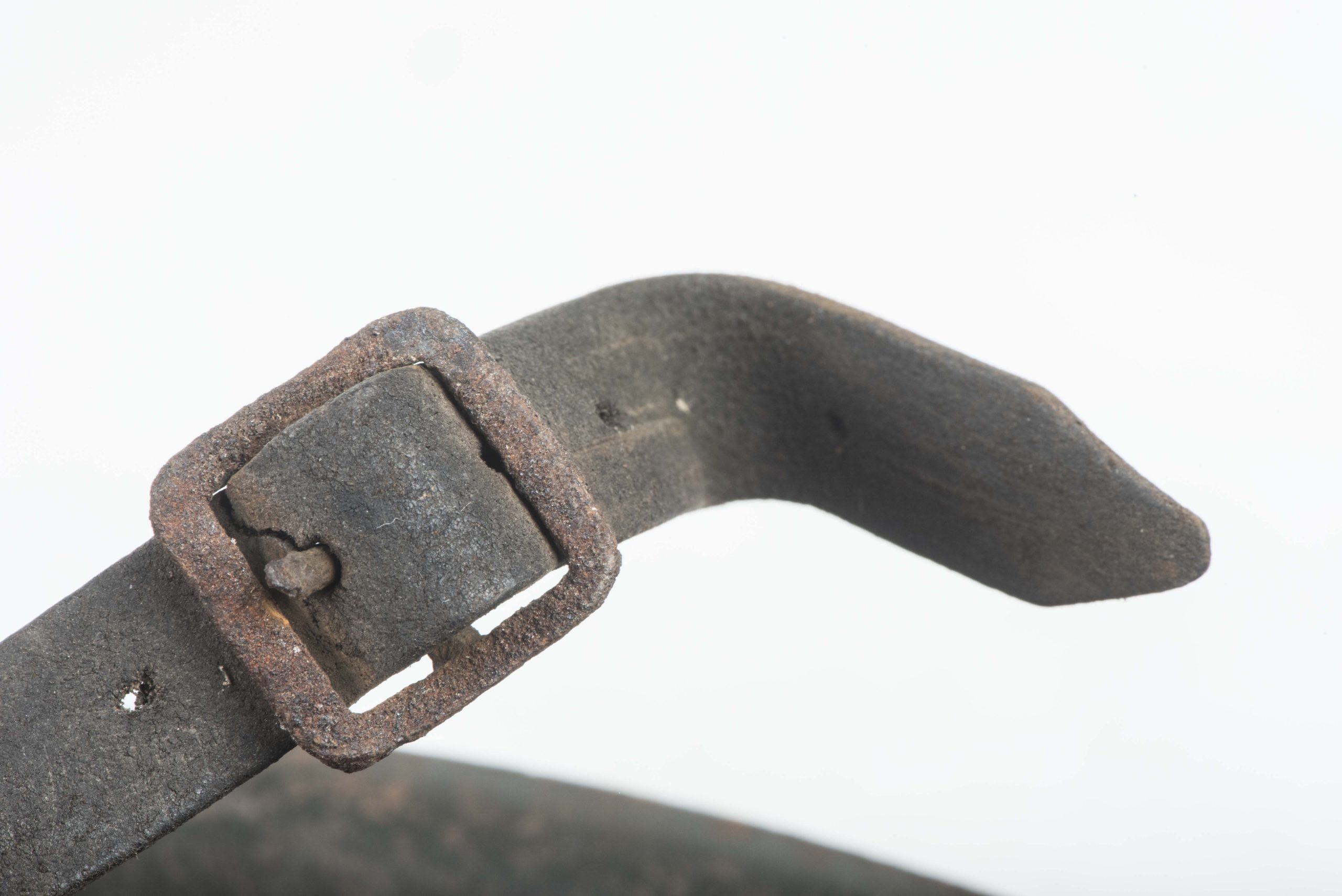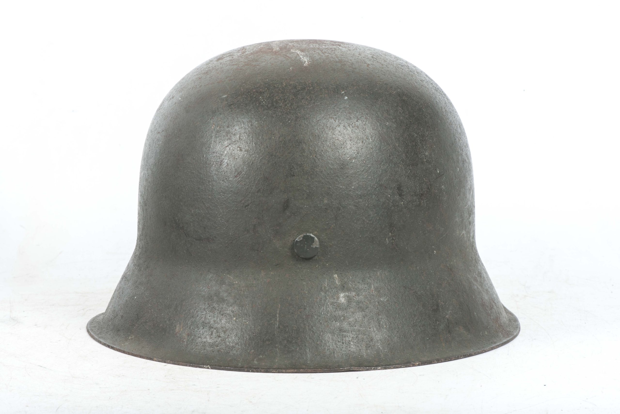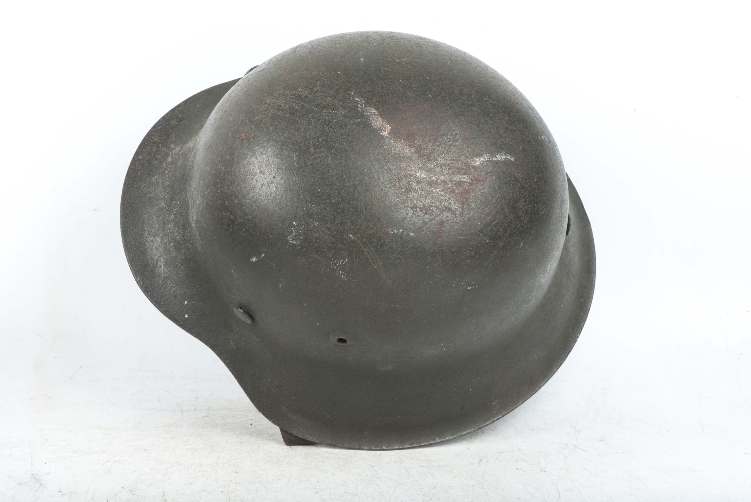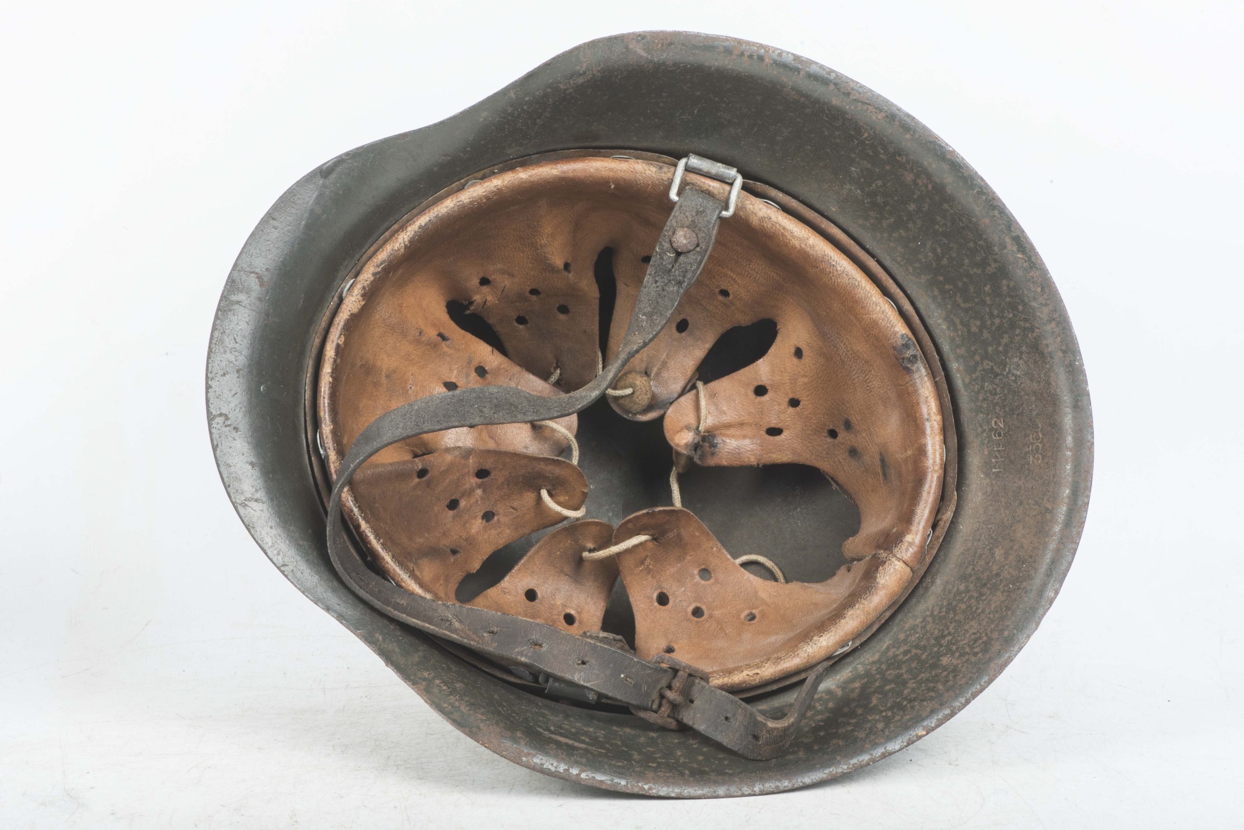 hkp62 M42 no decal helmet in good used condition. Typical late war example without decal. Complete with its original factory installed liner and damaged chinstrap. Nice piece!